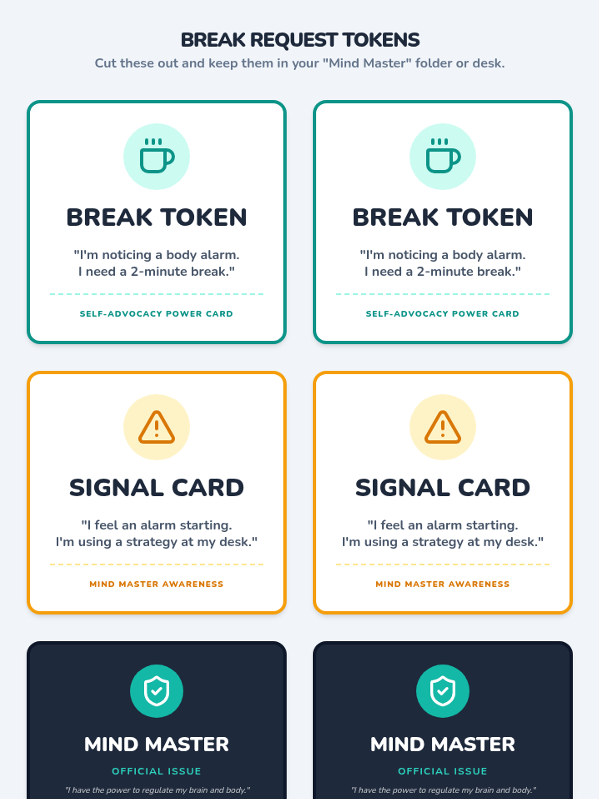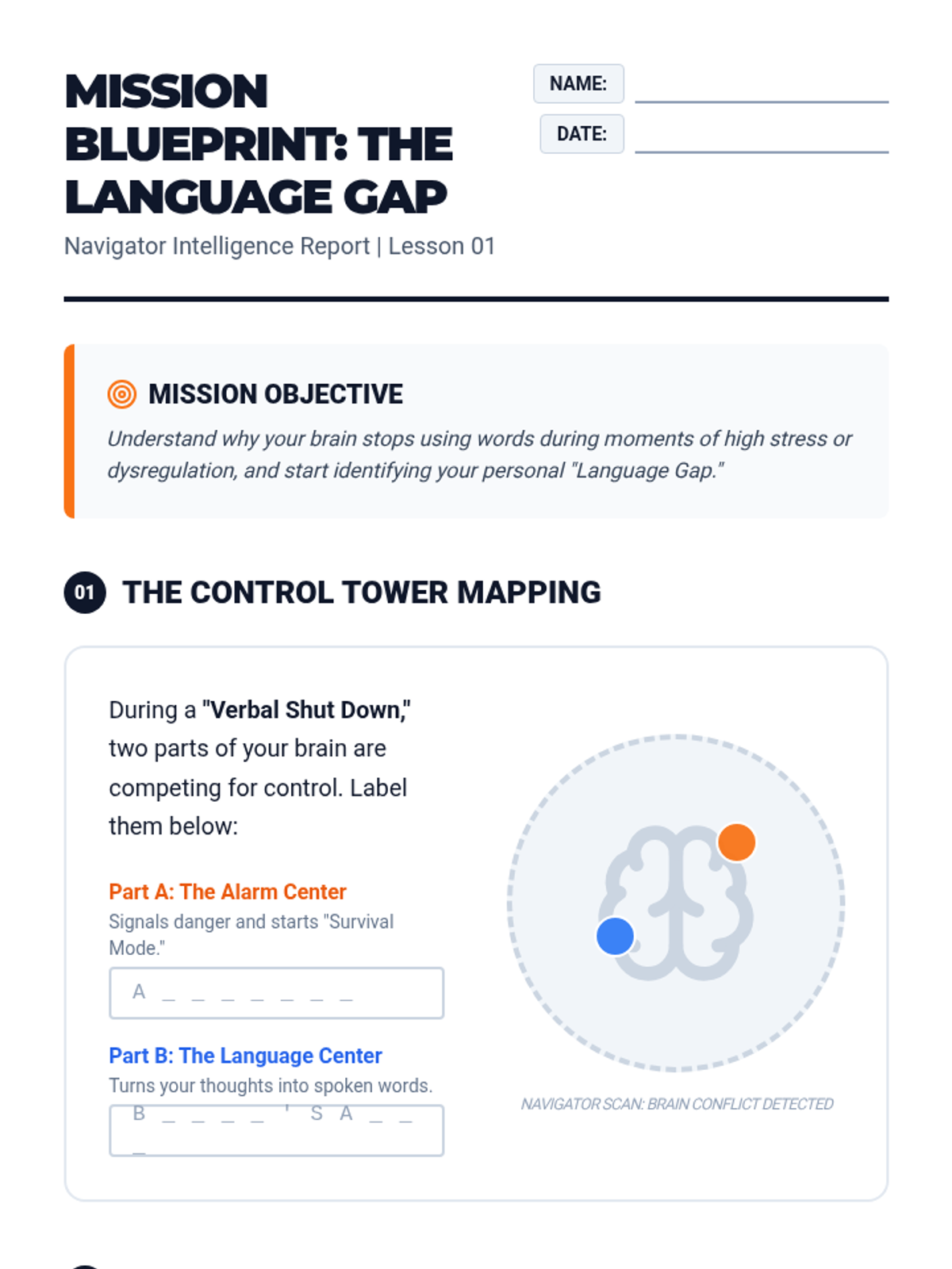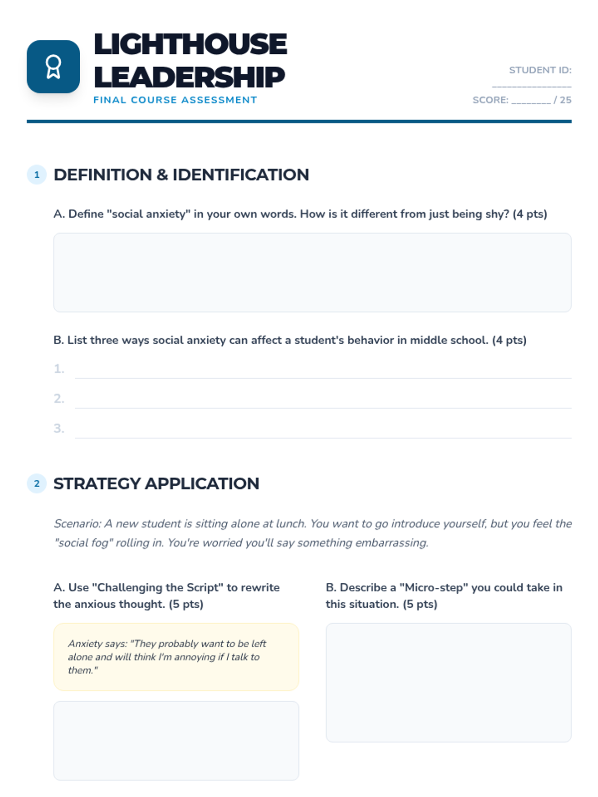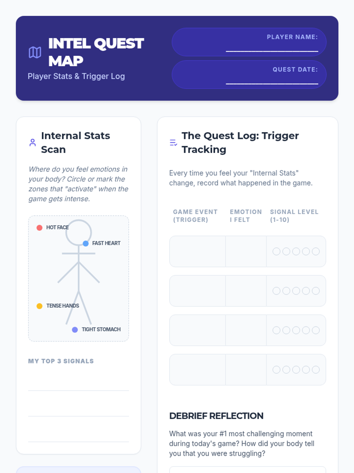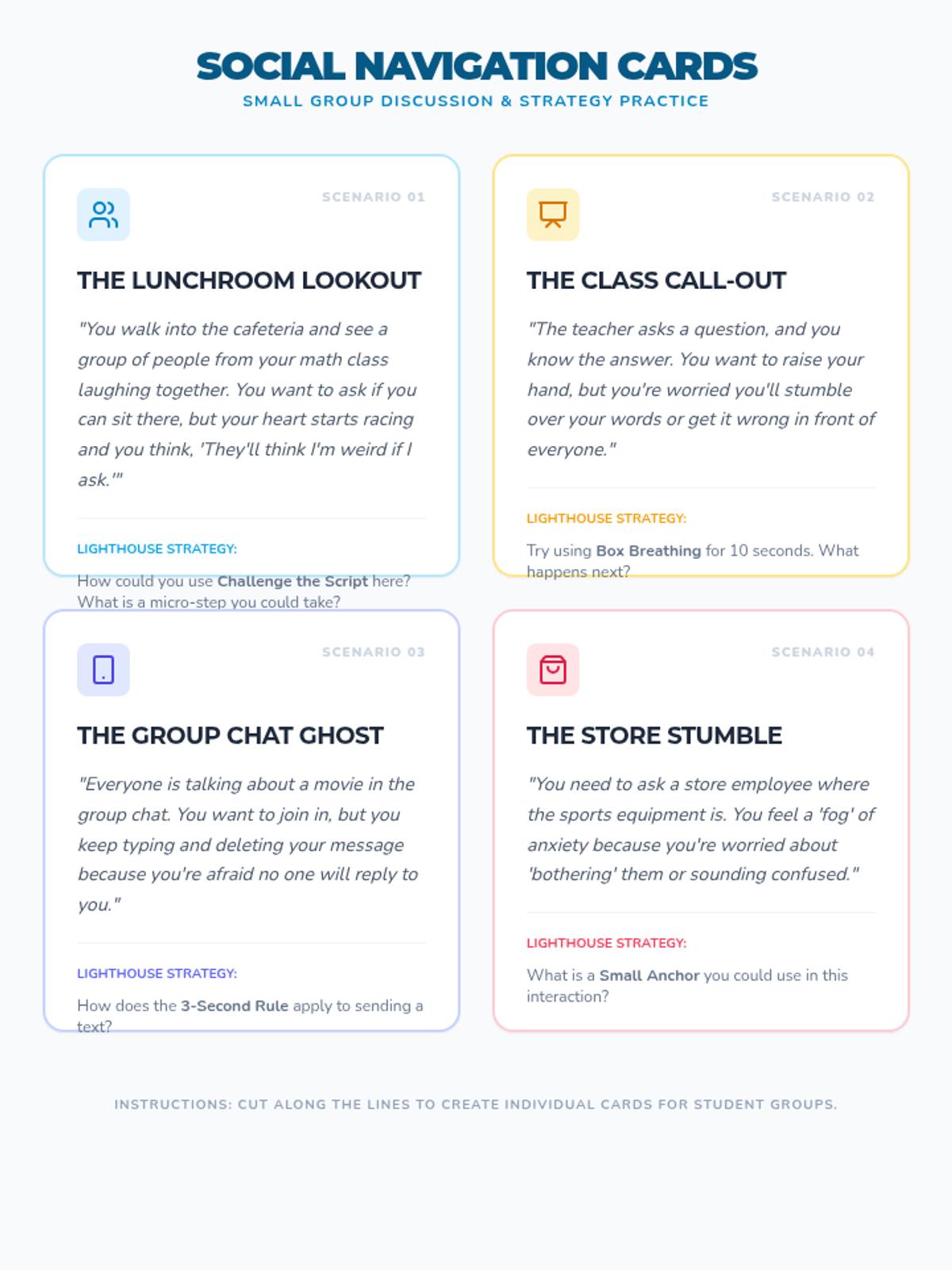 A high-energy, 35-minute workshop for a duo of middle school boys. Framed as a performance challenge, it gamifies identifying unhelpful thoughts, practicing positive self-talk, and mastering communication circuits.
