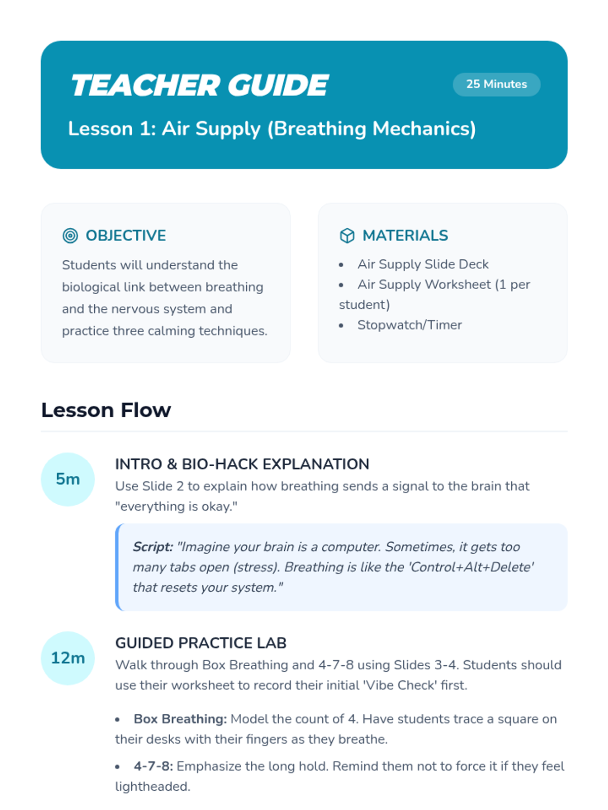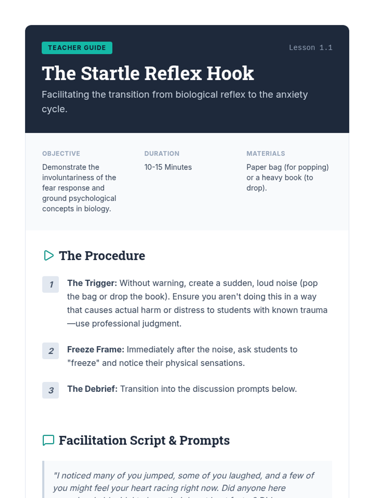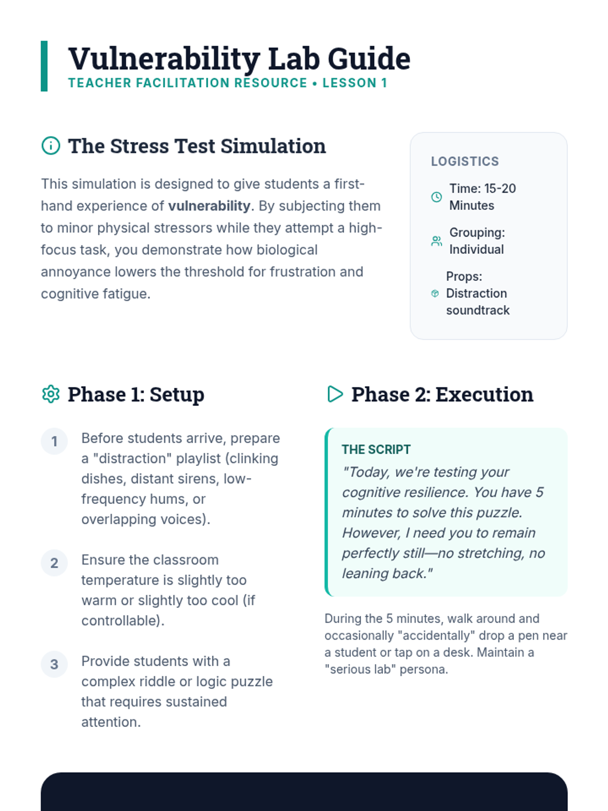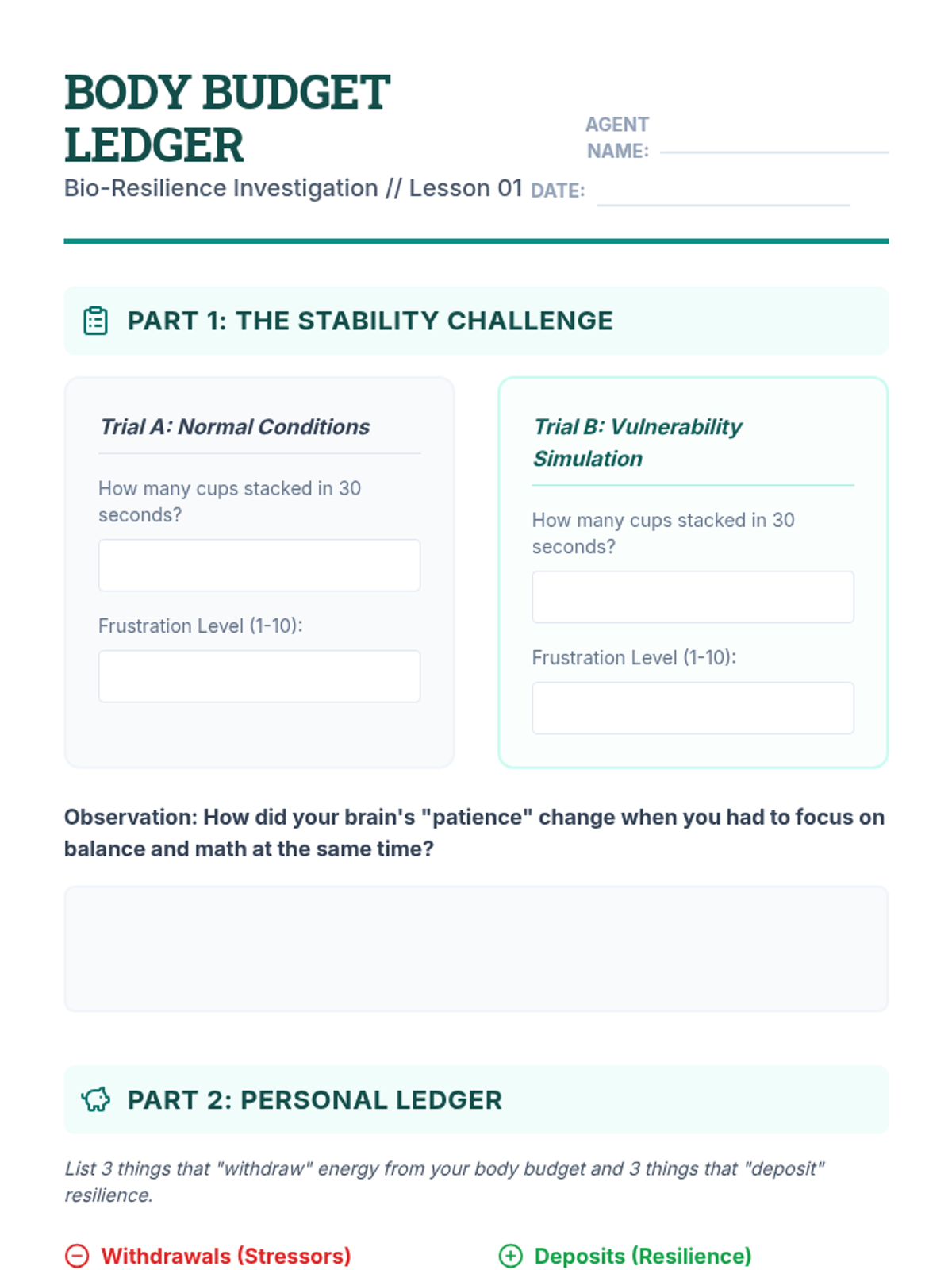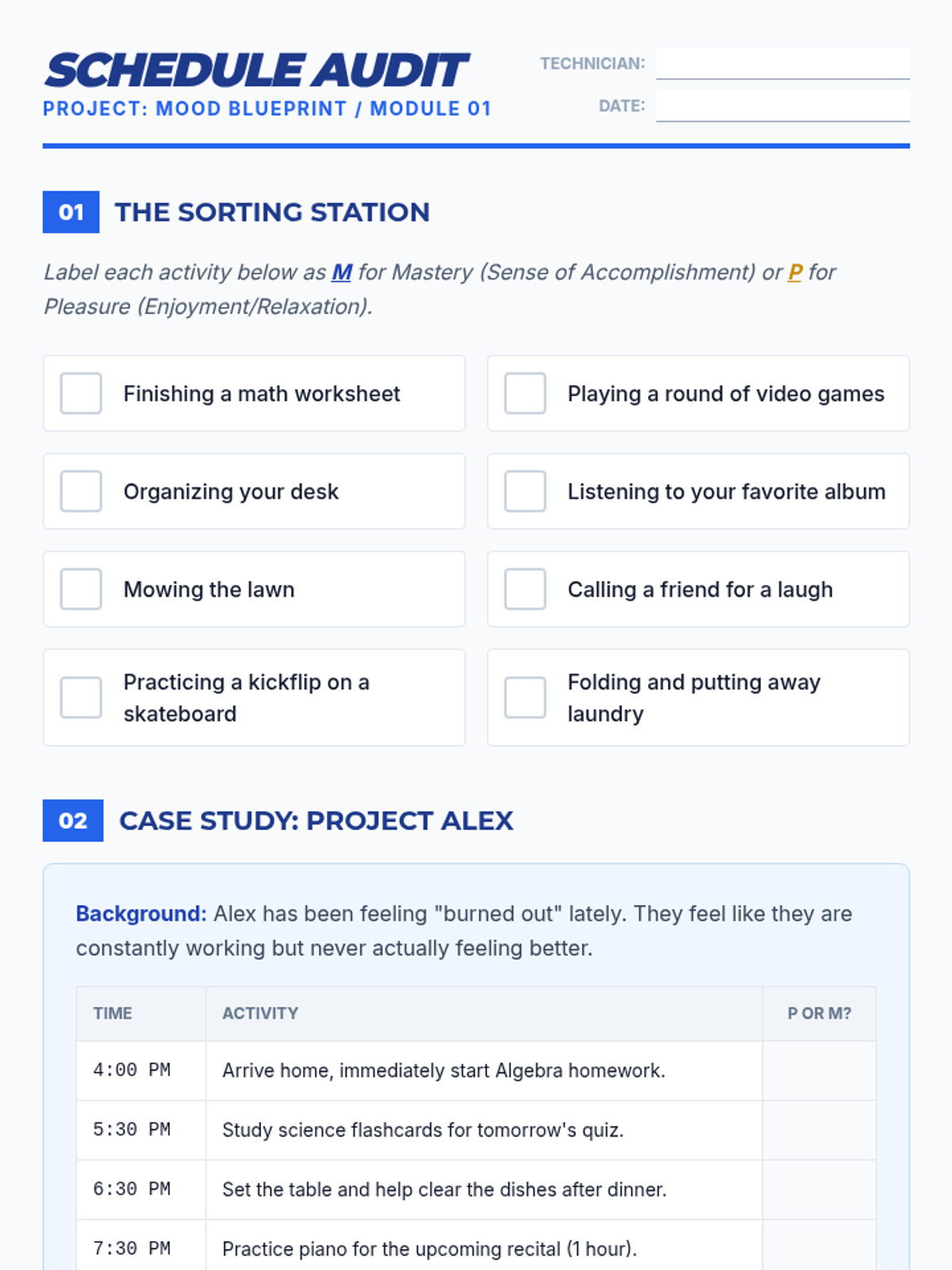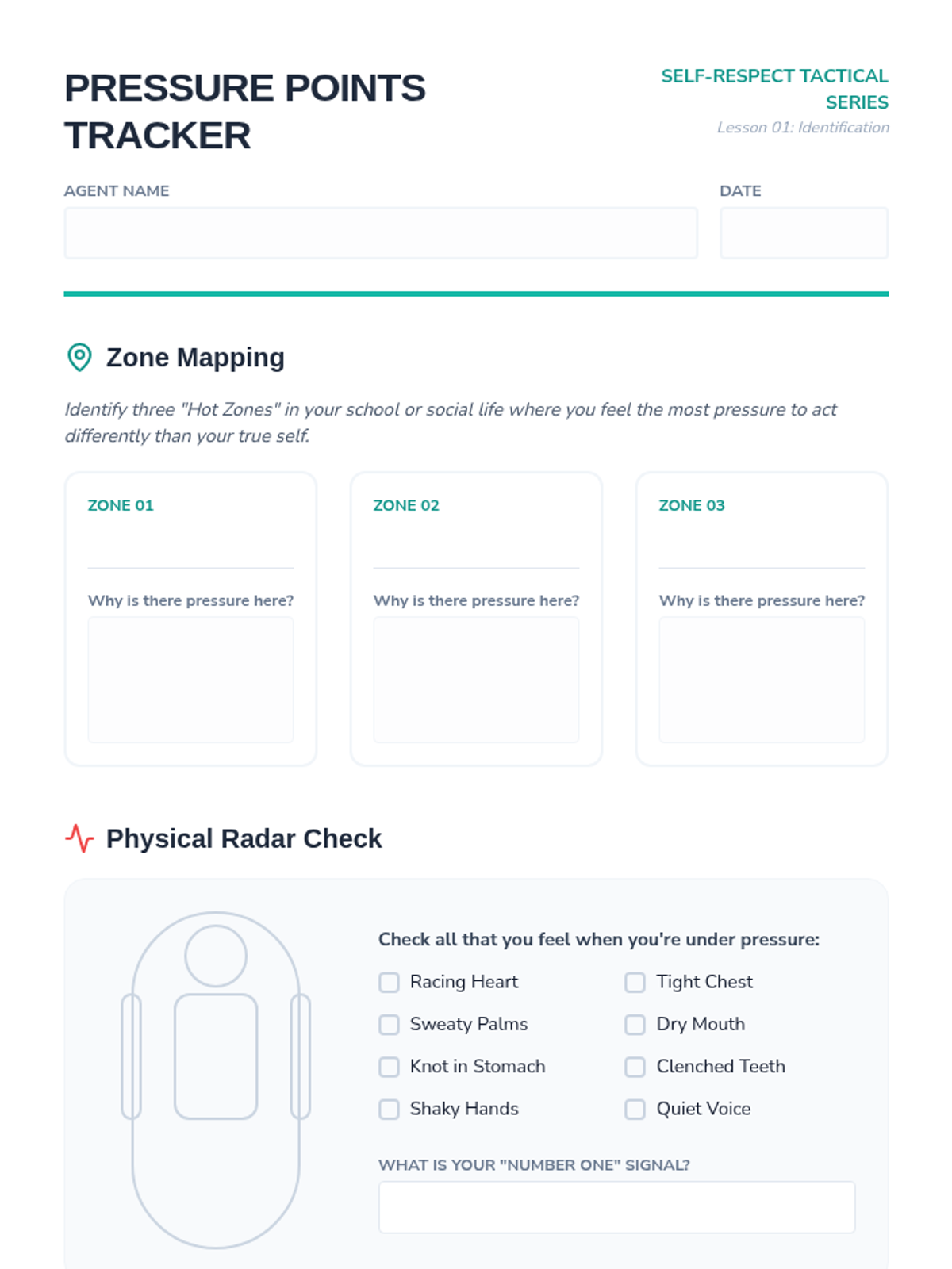 A high-energy, 35-minute workshop for a duo of middle school boys. Framed as a performance challenge, it gamifies identifying unhelpful thoughts, practicing positive self-talk, and mastering communication circuits.