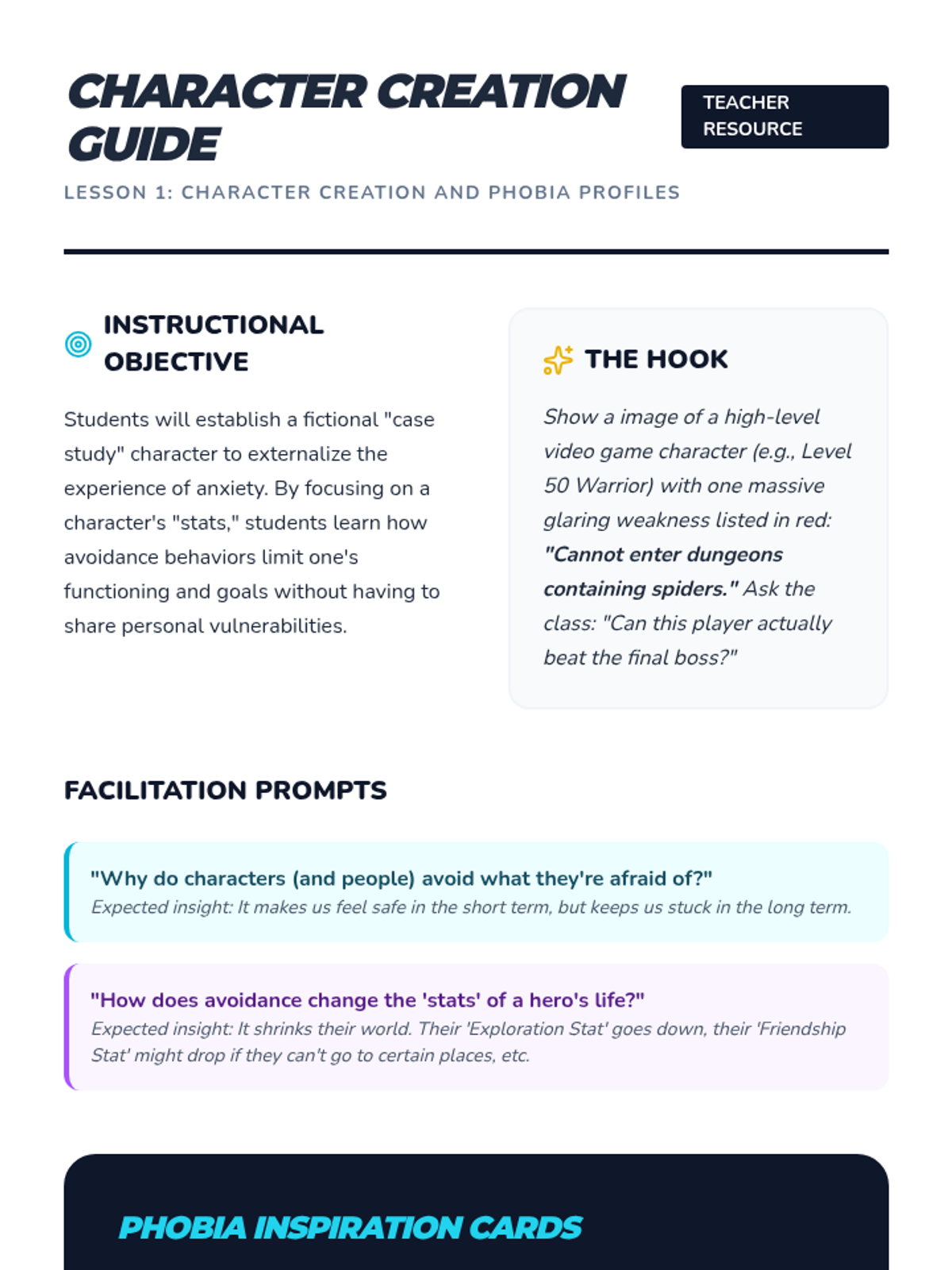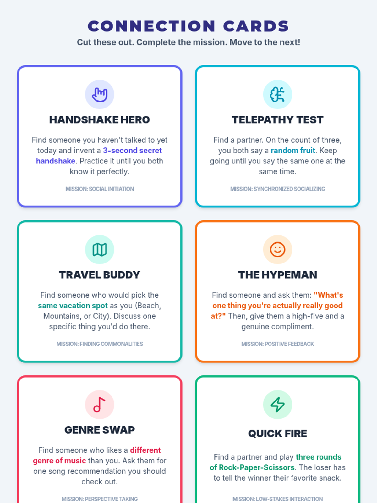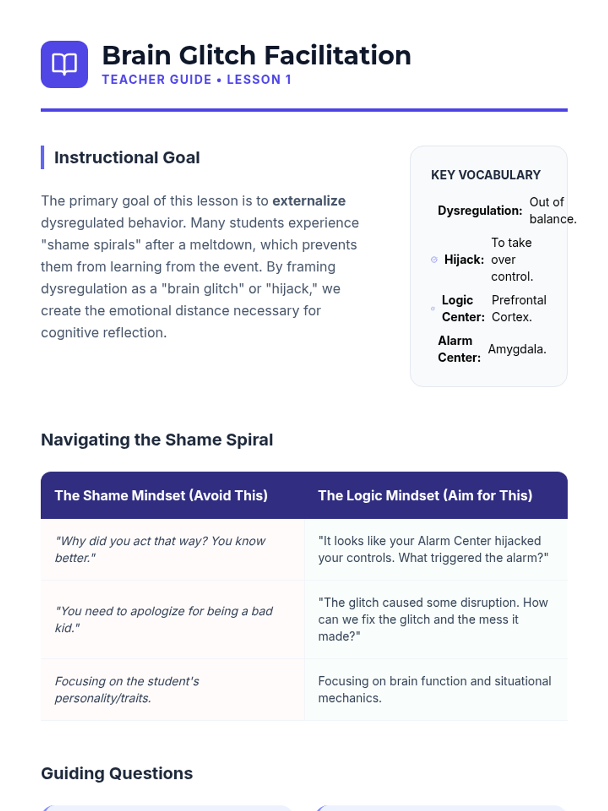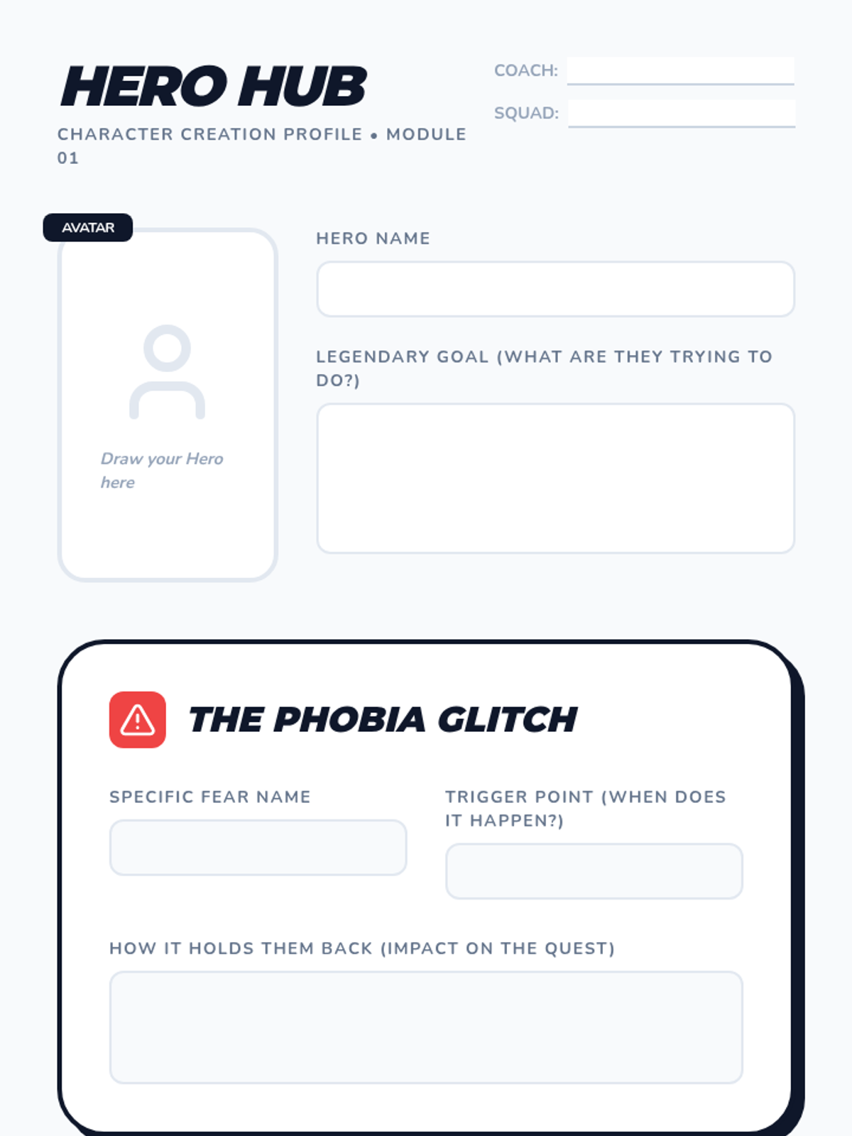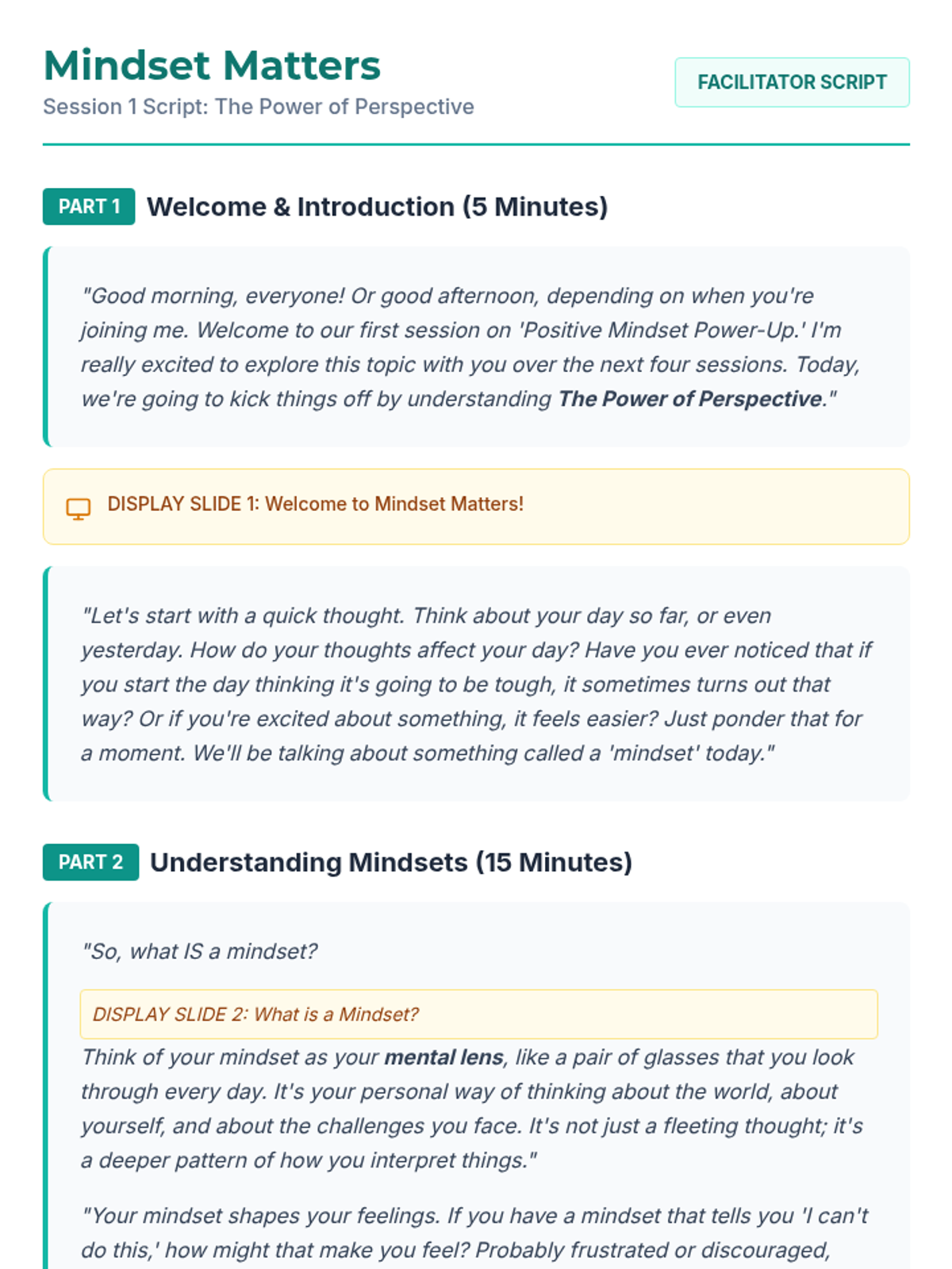 A high-energy, 35-minute workshop for a duo of middle school boys. Framed as a performance challenge, it gamifies identifying unhelpful thoughts, practicing positive self-talk, and mastering communication circuits.