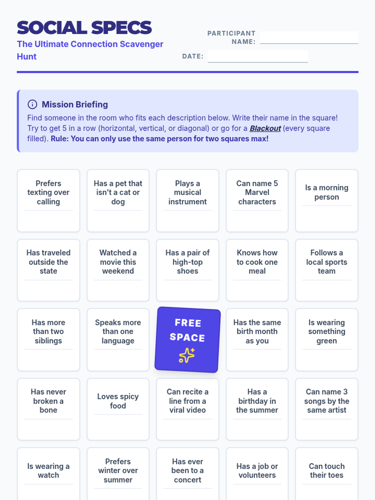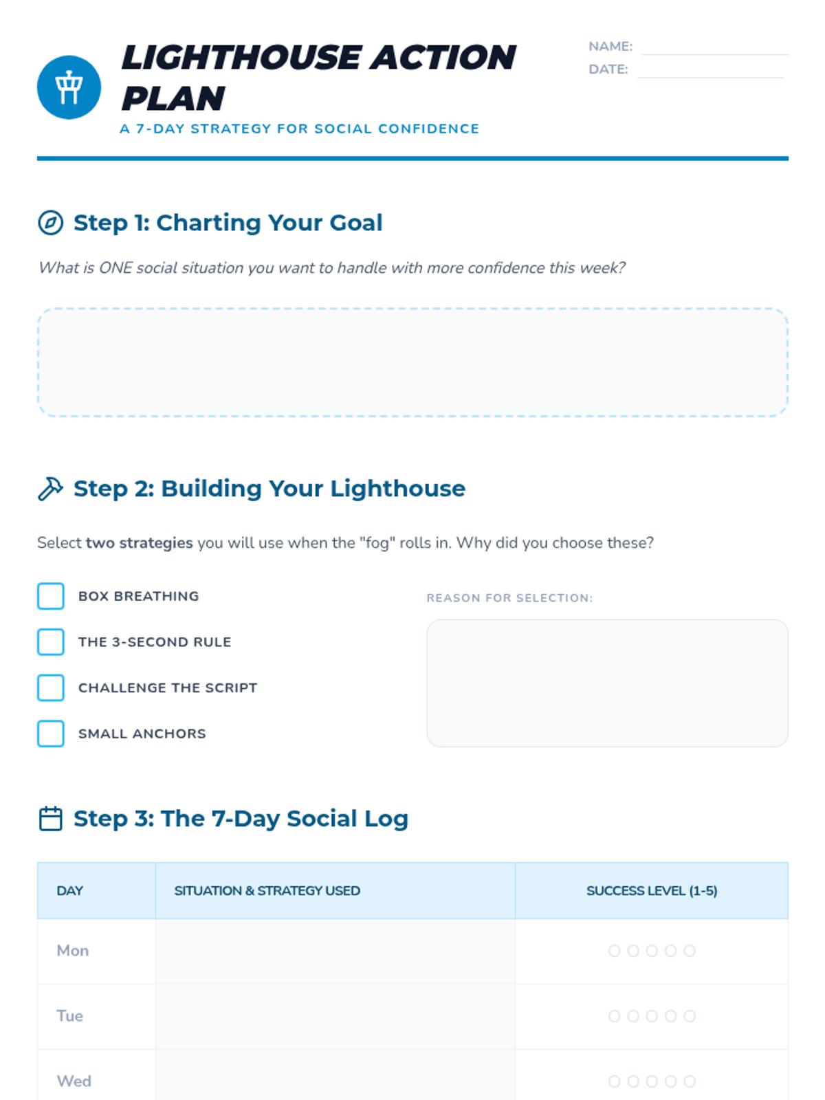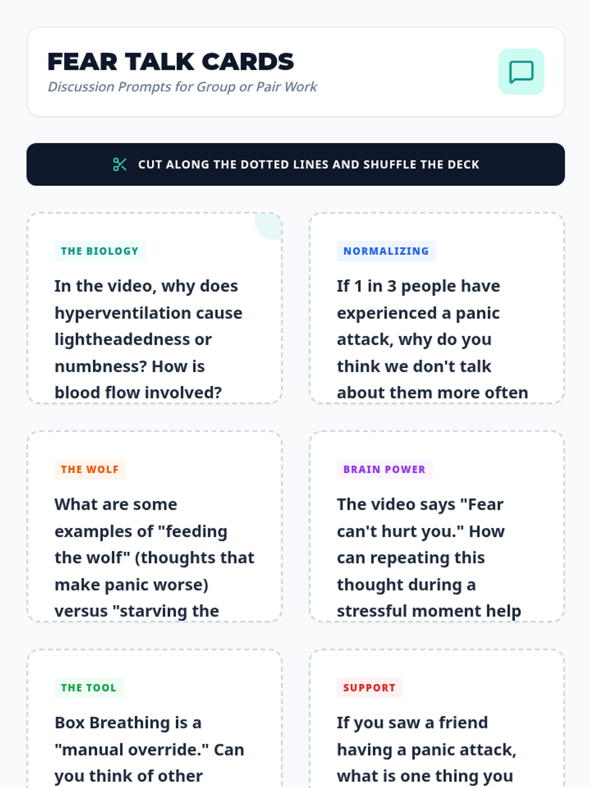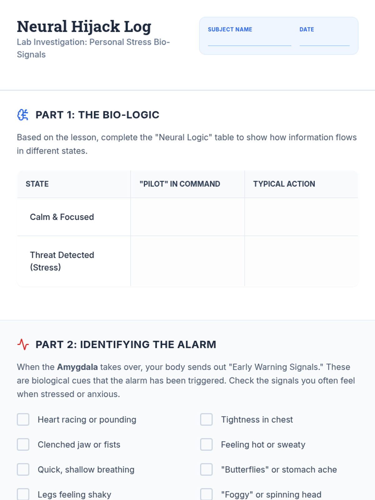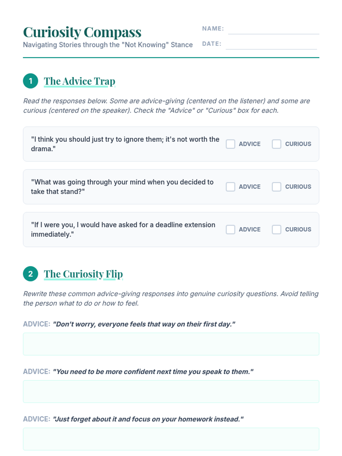 A high-energy, 35-minute workshop for a duo of middle school boys. Framed as a performance challenge, it gamifies identifying unhelpful thoughts, practicing positive self-talk, and mastering communication circuits.