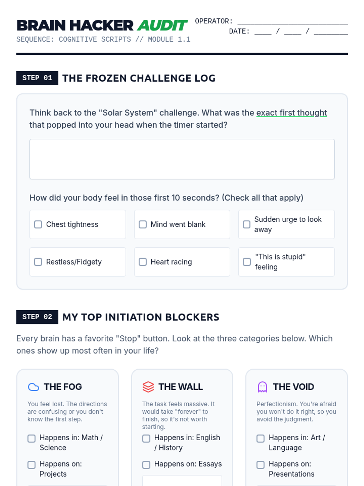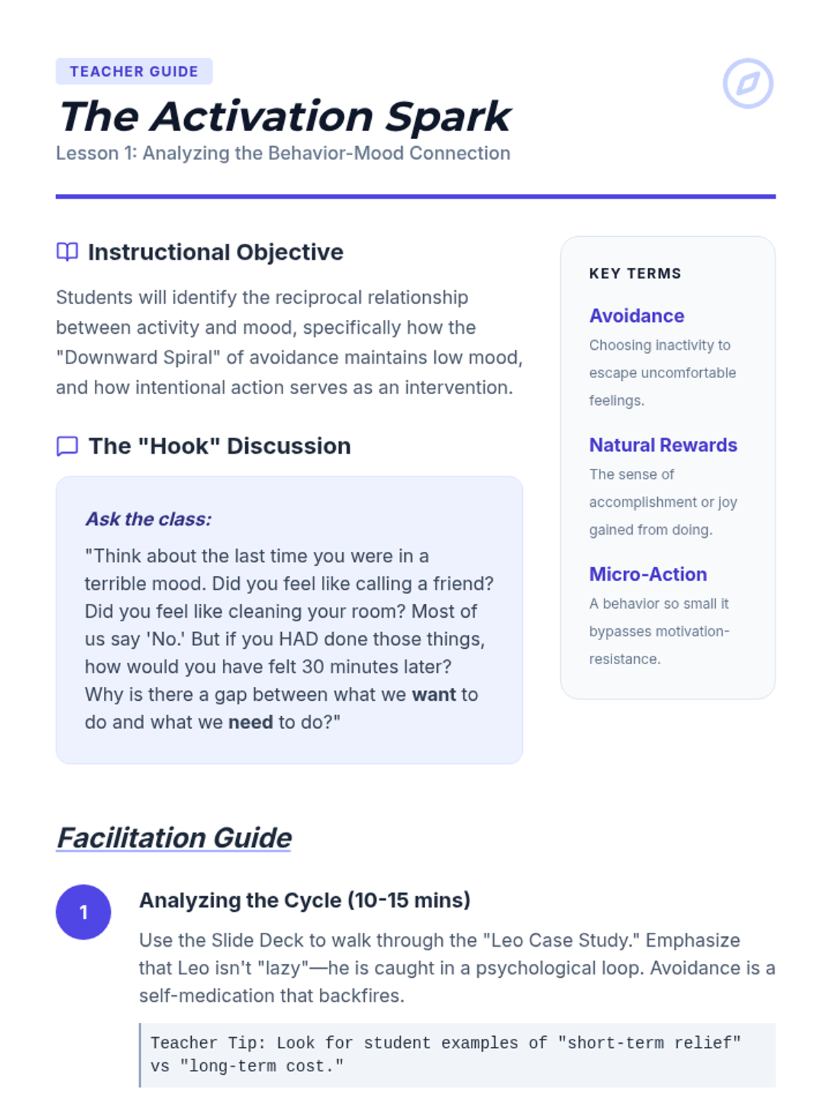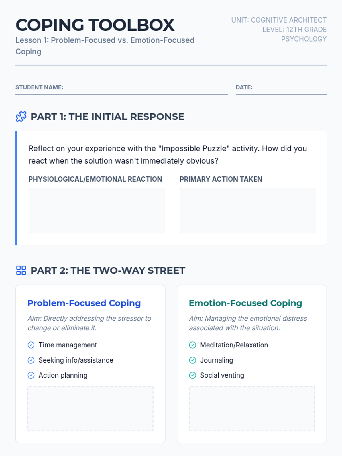 A task management sequence for 10th-grade students focusing on self-talk as a tool for independent work initiation. Students analyze performance psychology, simulate peer coaching, and develop personalized 'Launch Codes' to overcome procrastination and academic paralysis.