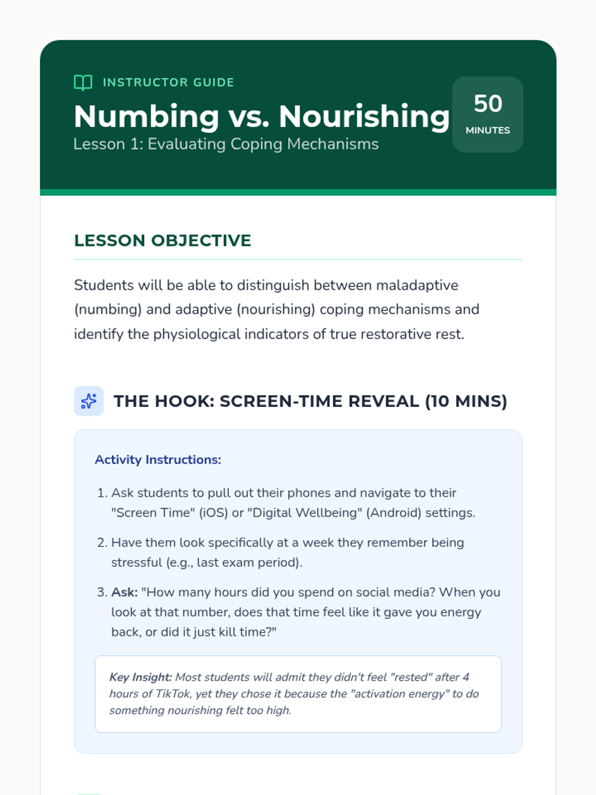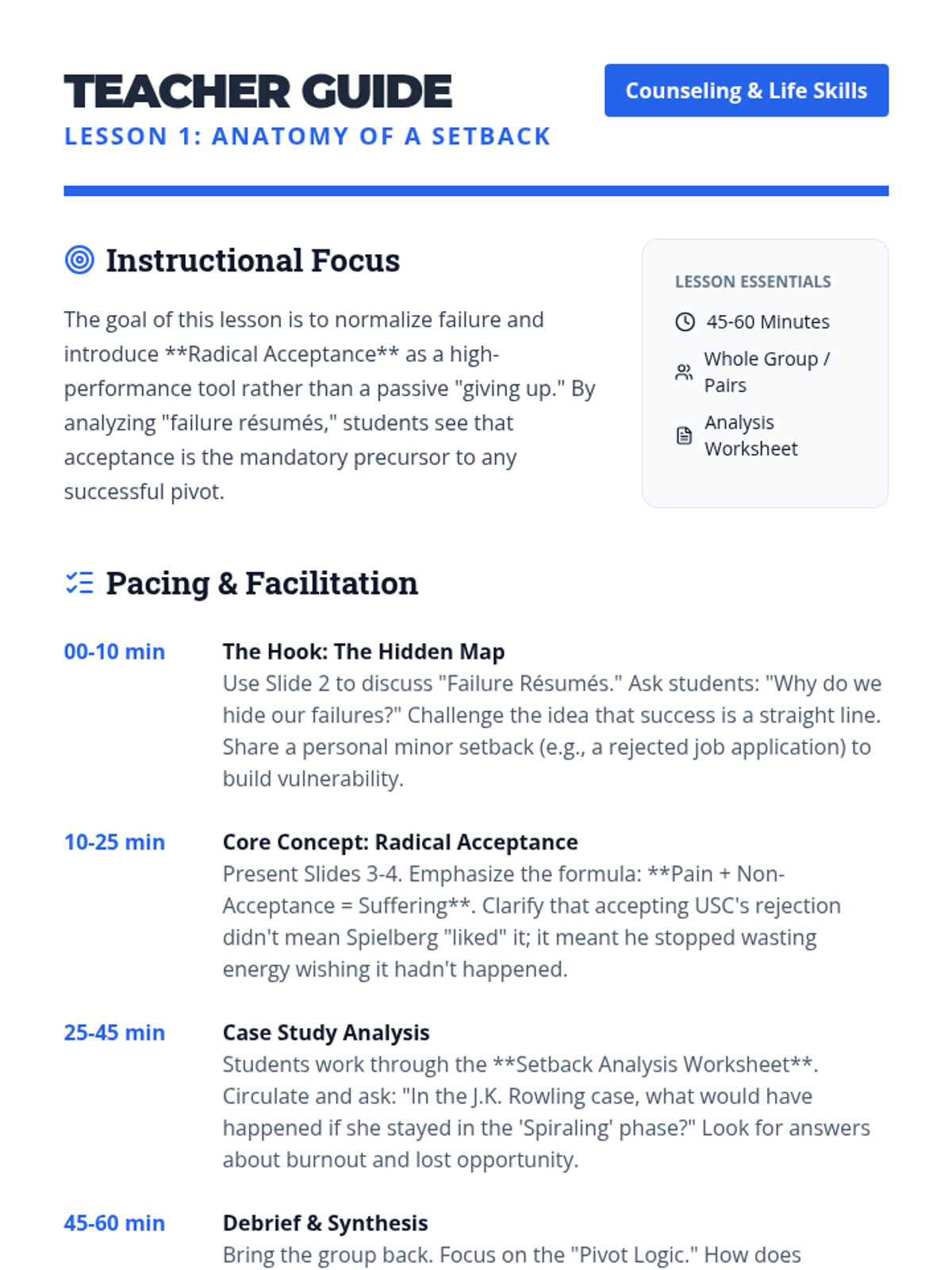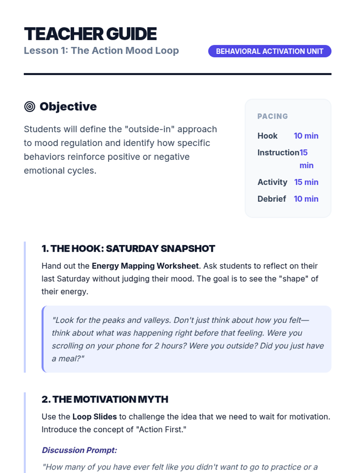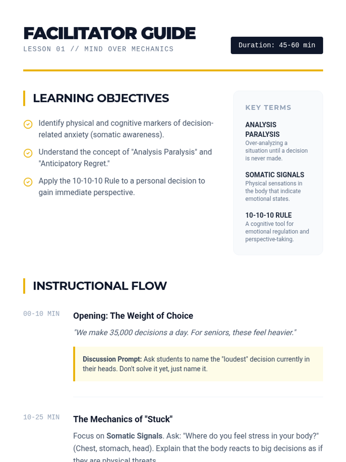 A task management sequence for 10th-grade students focusing on self-talk as a tool for independent work initiation. Students analyze performance psychology, simulate peer coaching, and develop personalized 'Launch Codes' to overcome procrastination and academic paralysis.