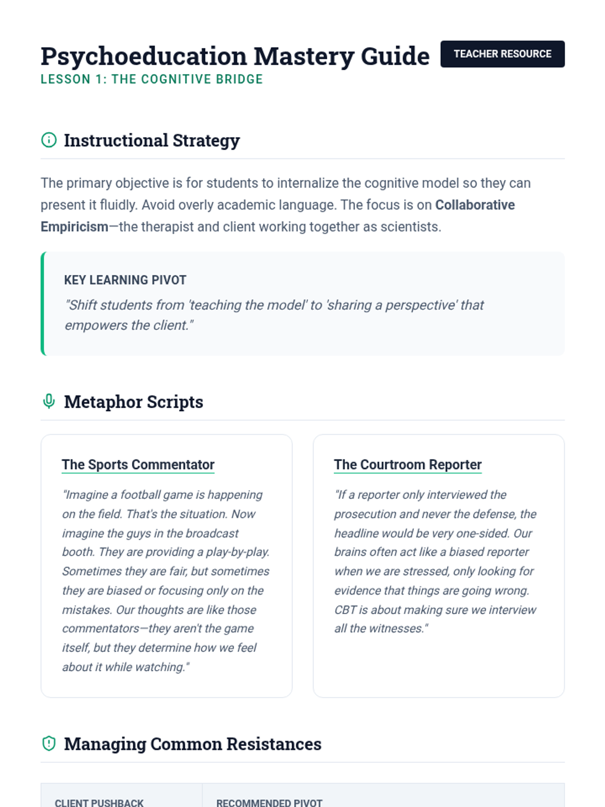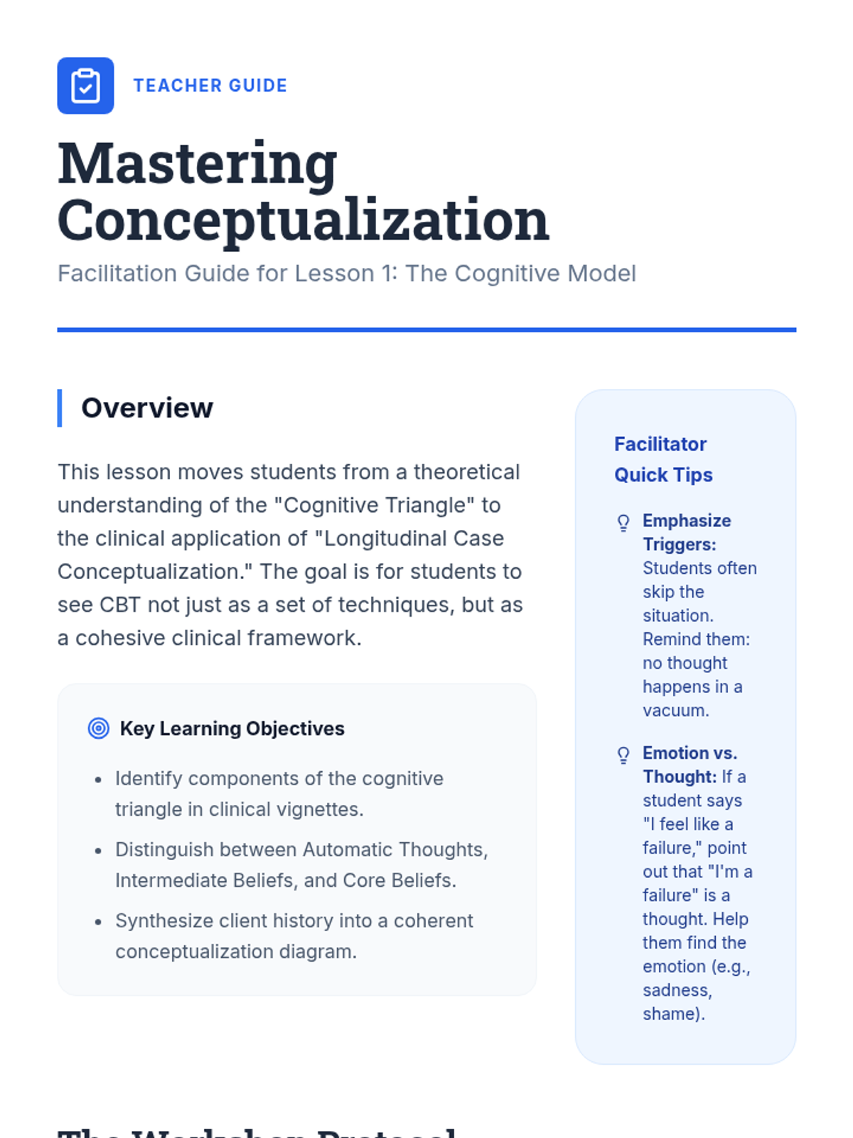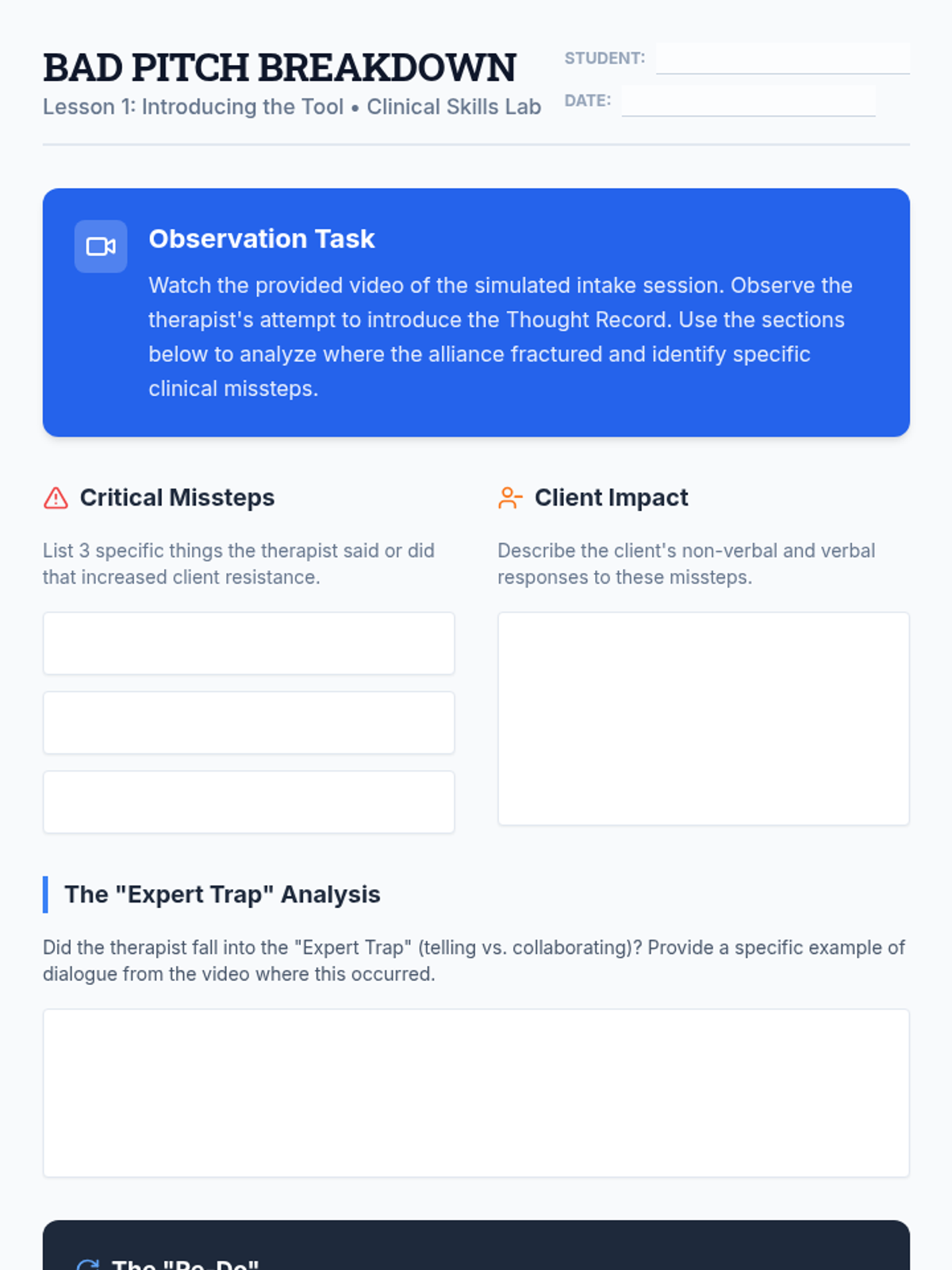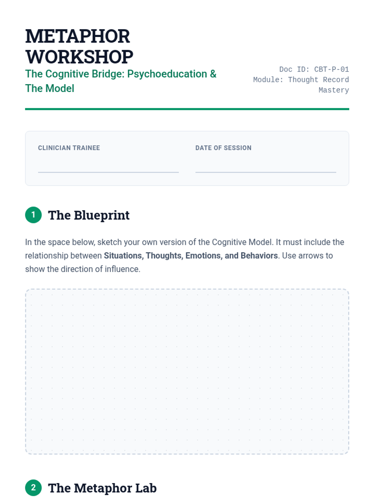 A comprehensive training sequence for undergraduate students focused on the clinical application of Thought Record tracking. Students transition from understanding the tool to facilitating it, mastering psychoeducation, Socratic questioning, and managing clinical resistance.