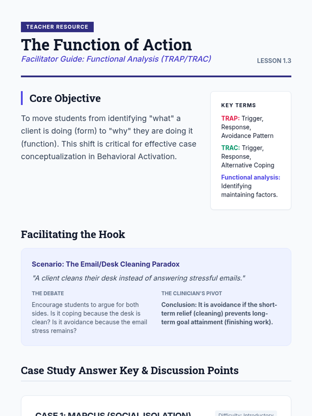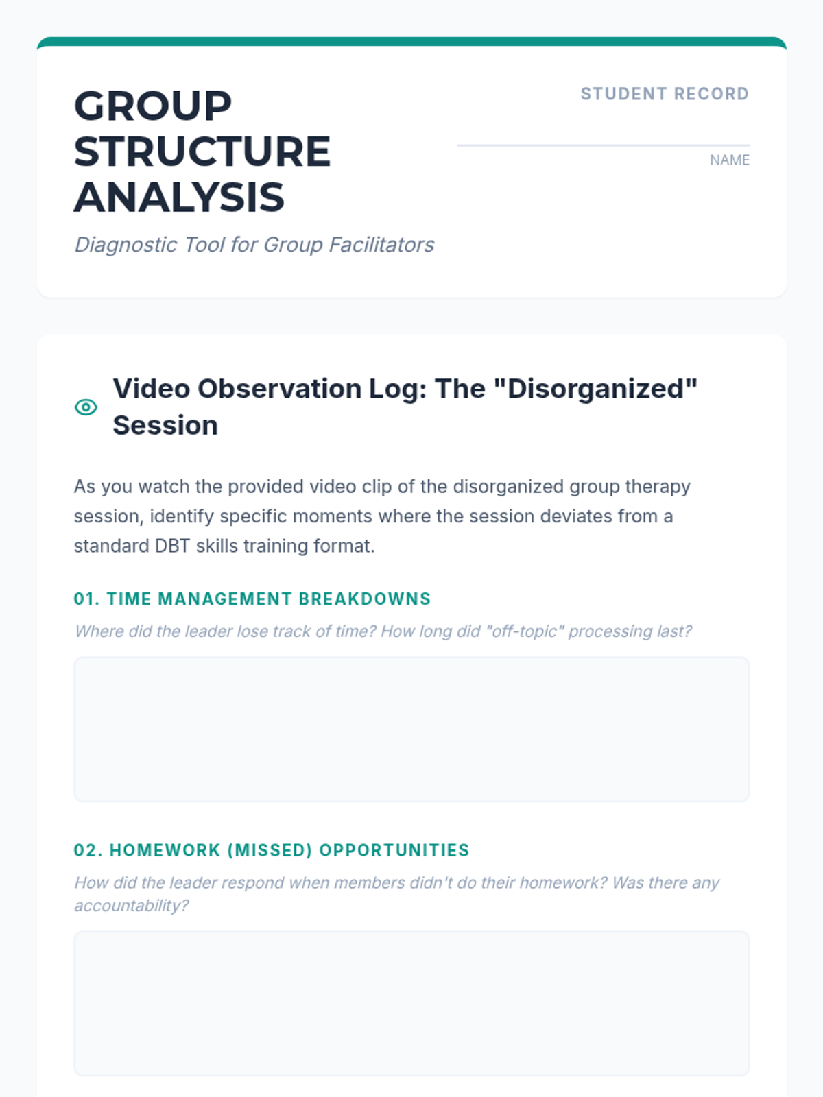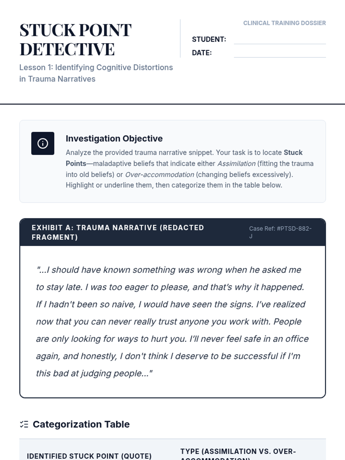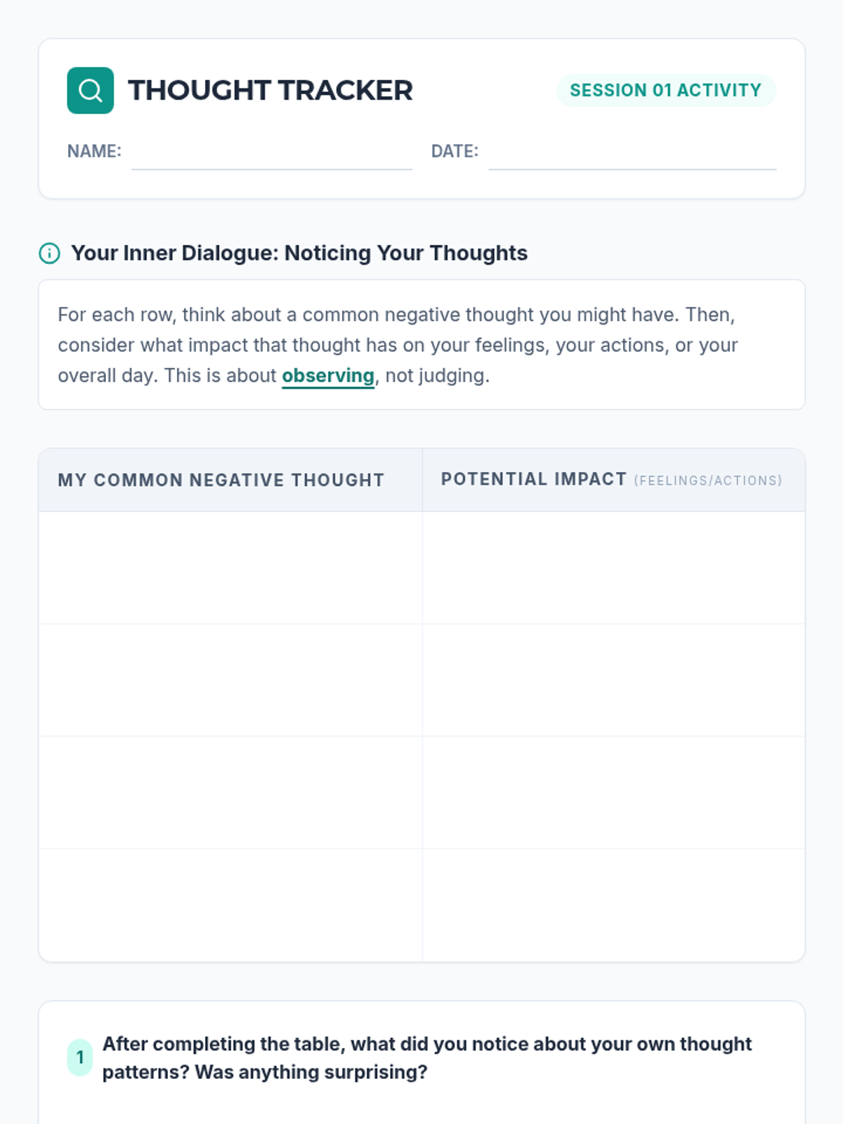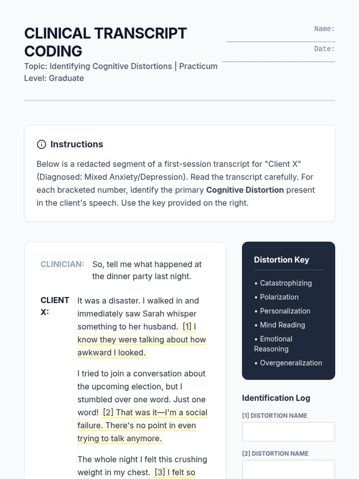 A comprehensive training sequence for undergraduate students focused on the clinical application of Thought Record tracking. Students transition from understanding the tool to facilitating it, mastering psychoeducation, Socratic questioning, and managing clinical resistance.
