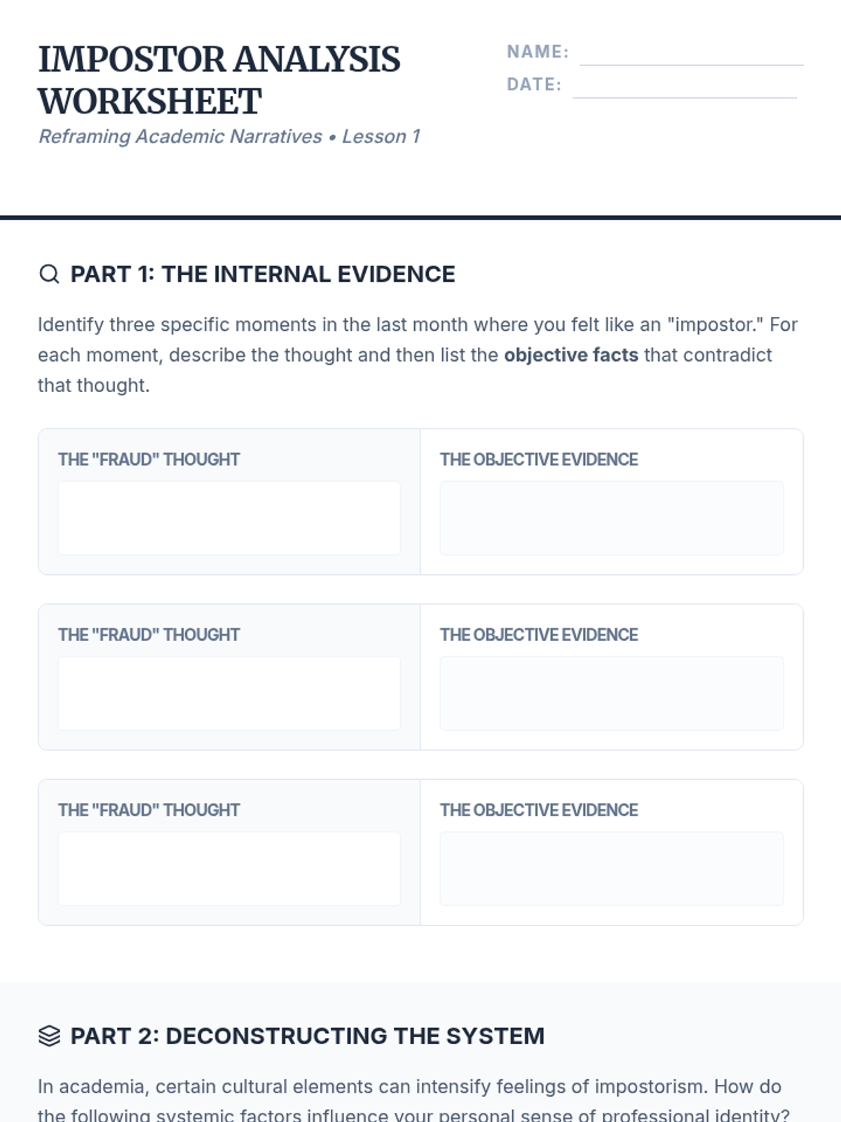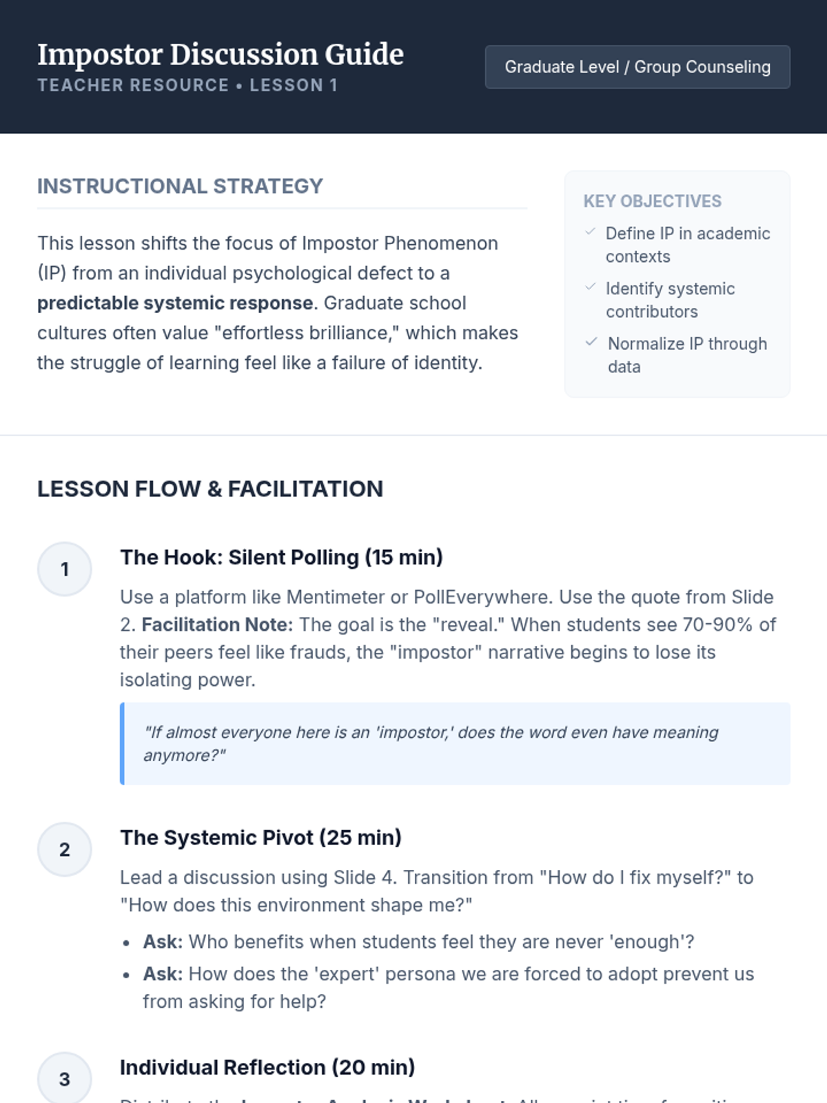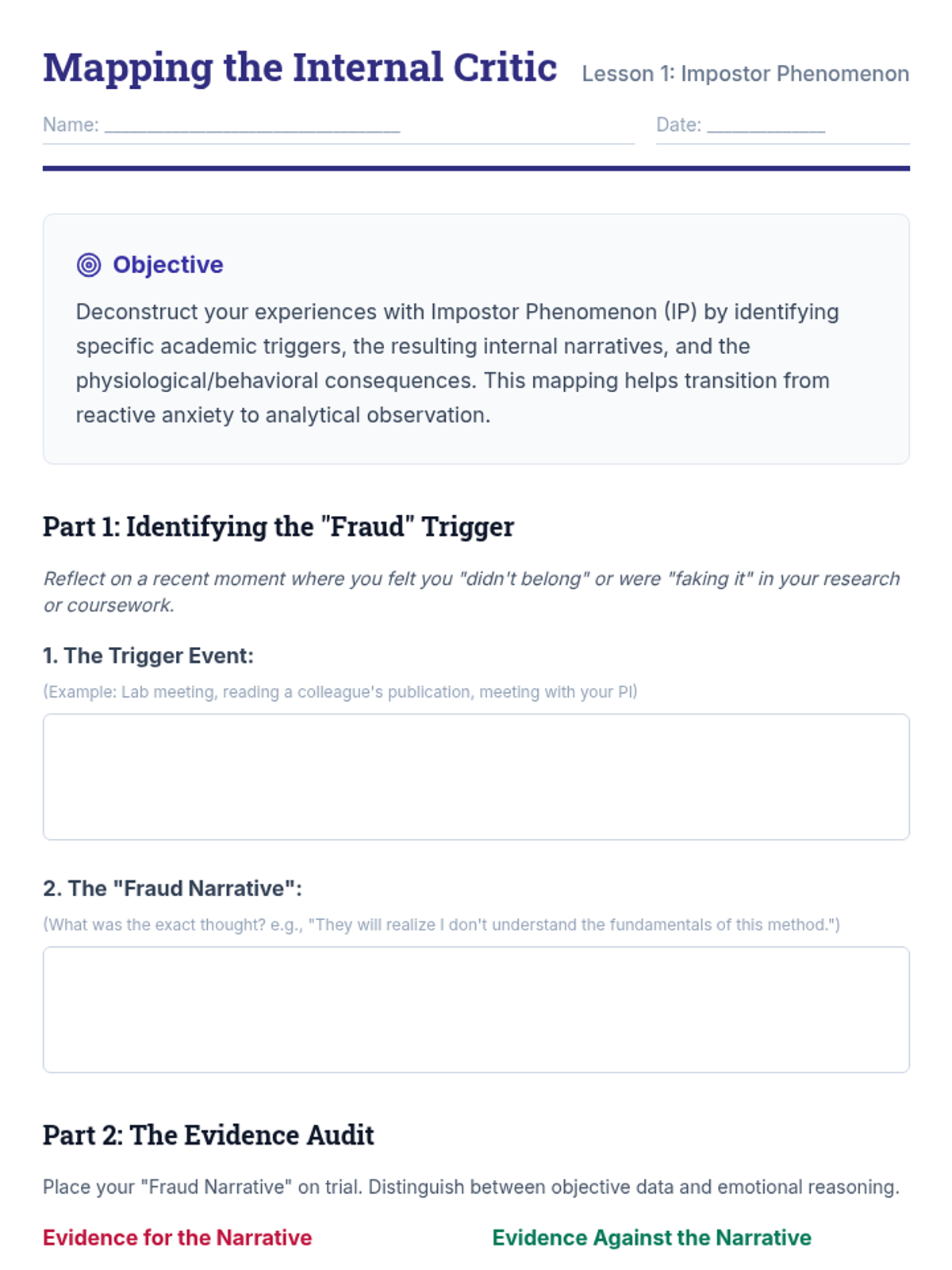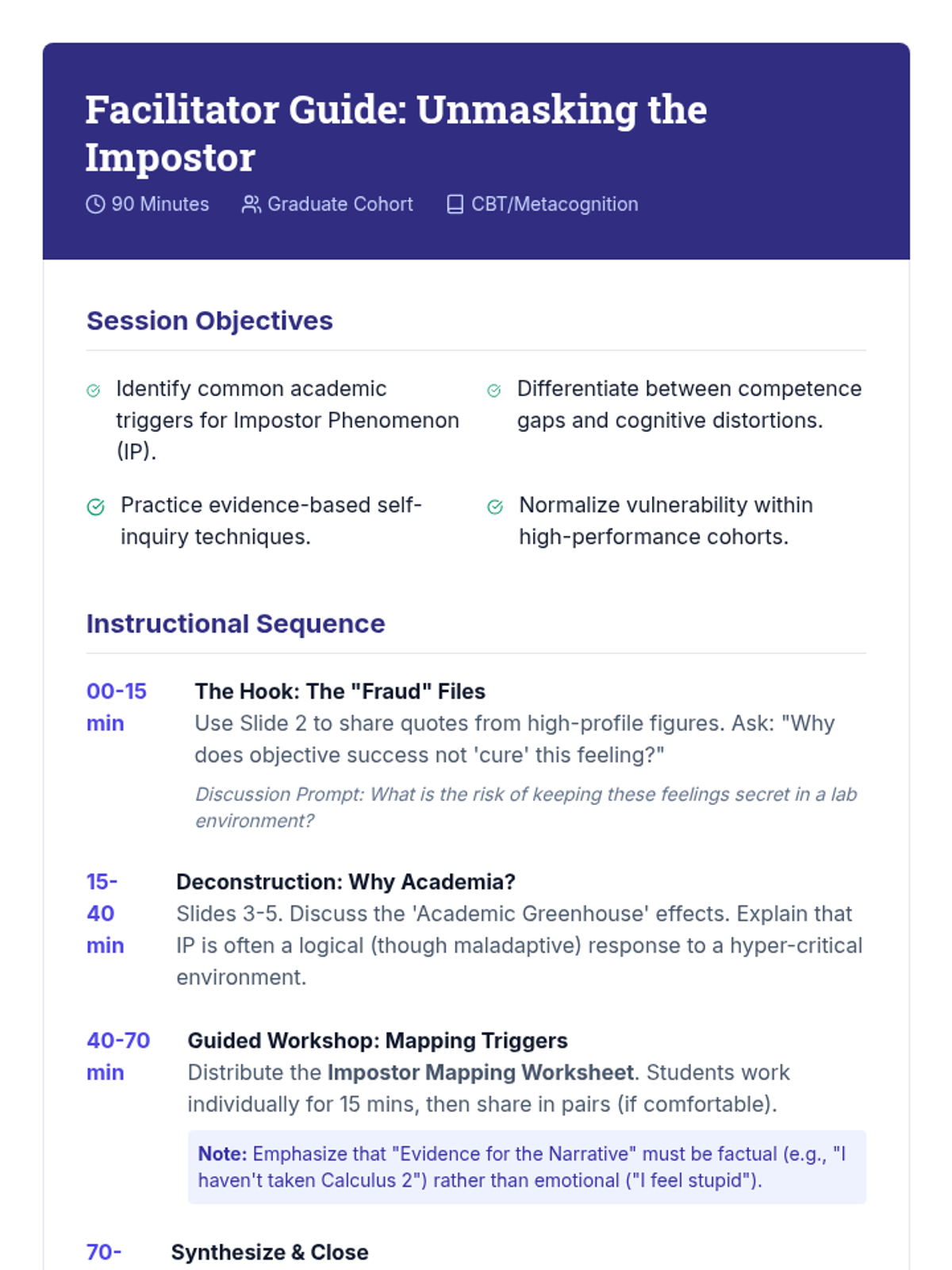 A comprehensive workshop sequence for graduate students to address academic anxiety through cognitive restructuring. The sequence explores Impostor Phenomenon, cognitive distortions, perfectionism, and professional identity to build long-term resilience.