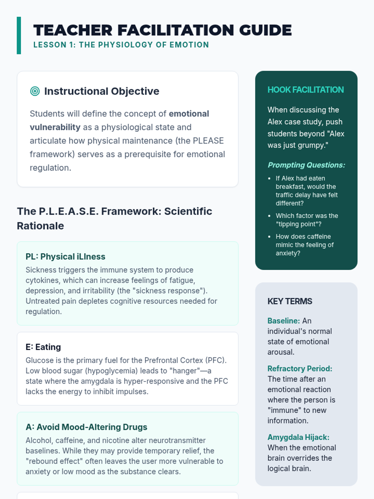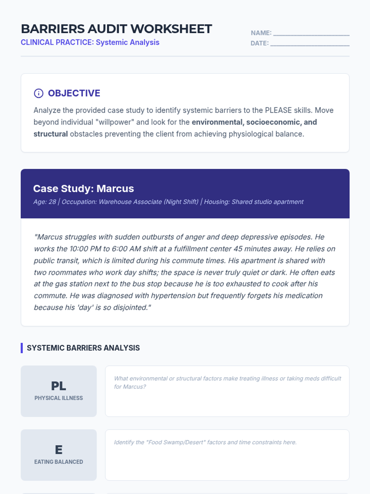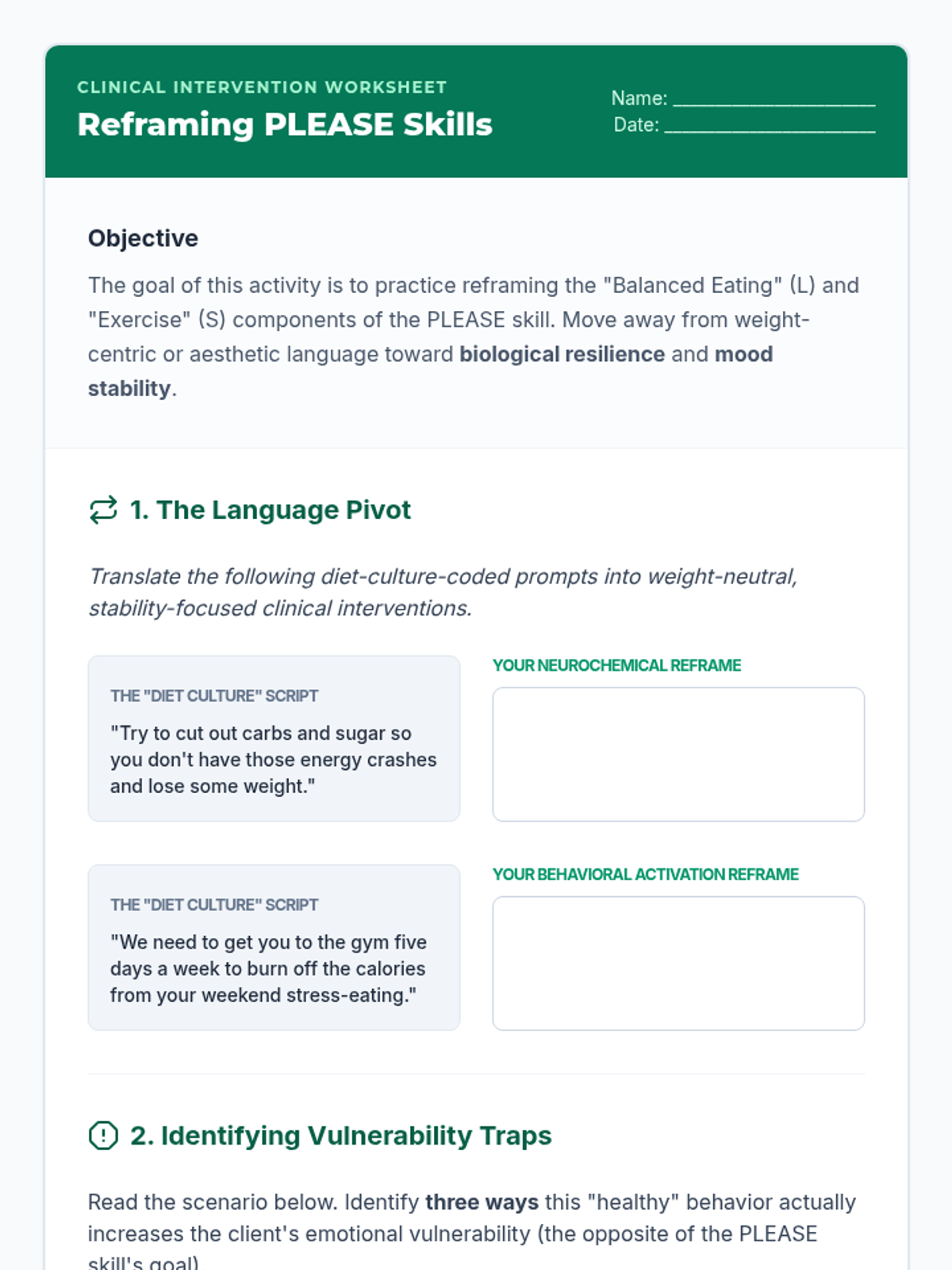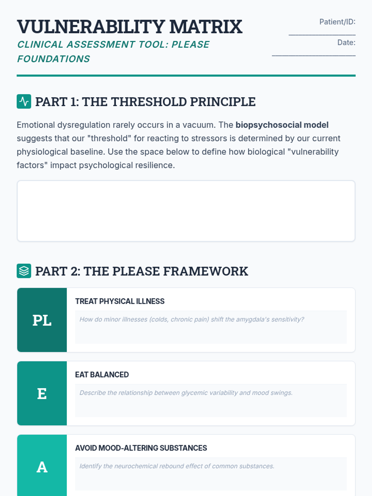 Reducing Emotional Vulnerability (PLEASE)DBT-based strategies for managing physical health to decrease emotional sensitivity. Targets sleep hygiene, balanced nutrition, exercise, and physical illness management to build emotional resilience.