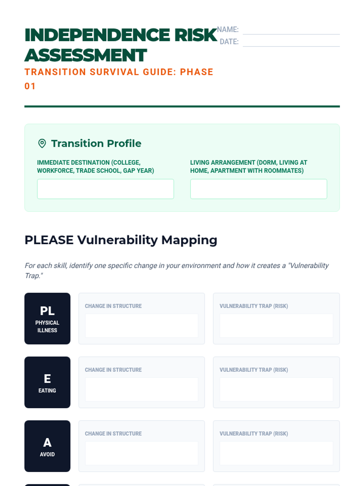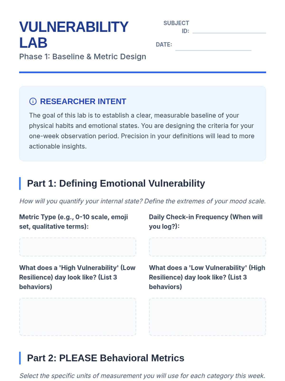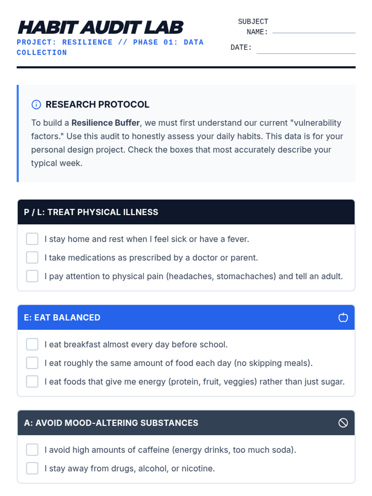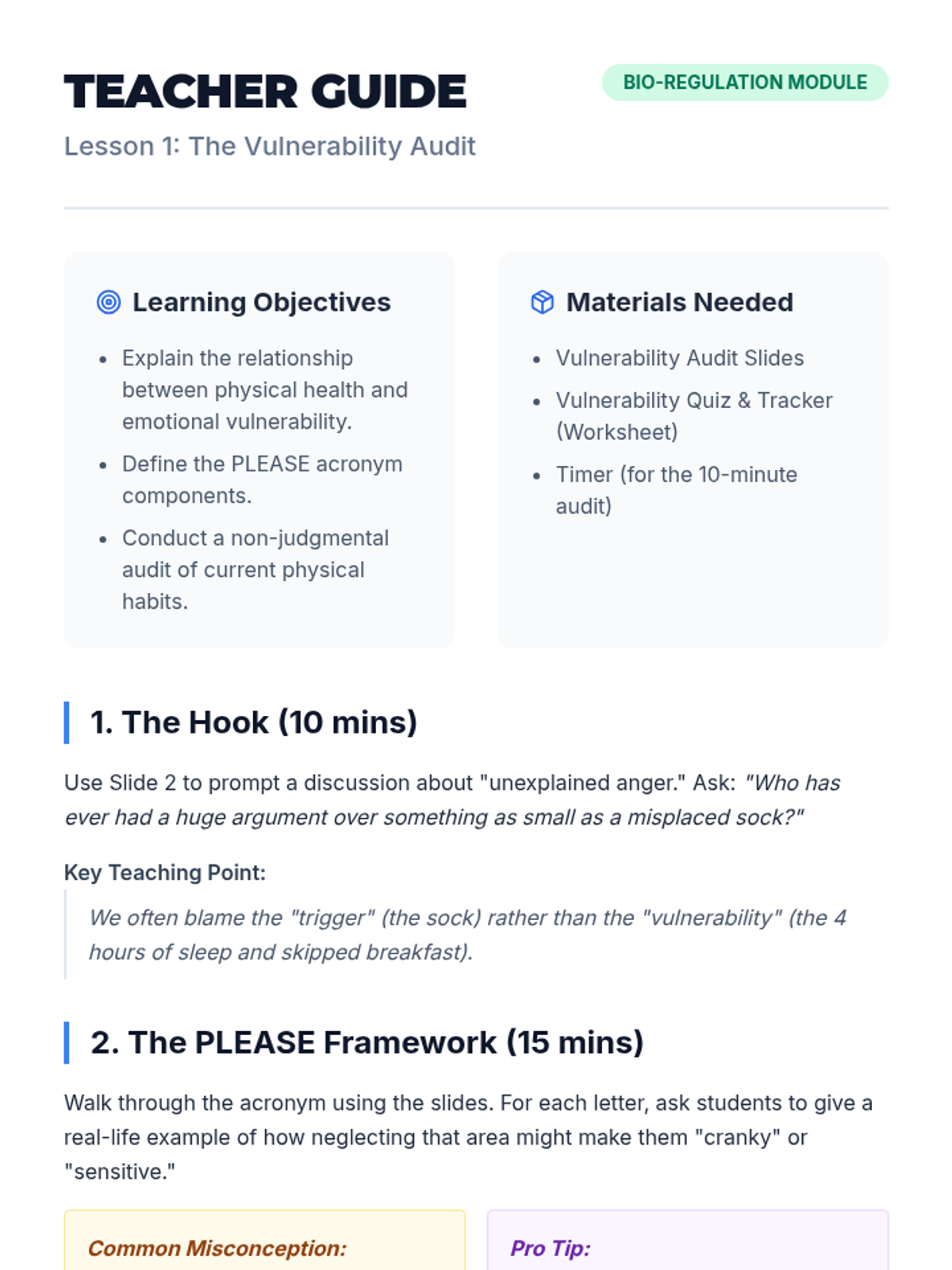 Reducing Emotional Vulnerability (PLEASE)DBT-based strategies for managing physical health to decrease emotional sensitivity. Targets sleep hygiene, balanced nutrition, exercise, and physical illness management to build emotional resilience.