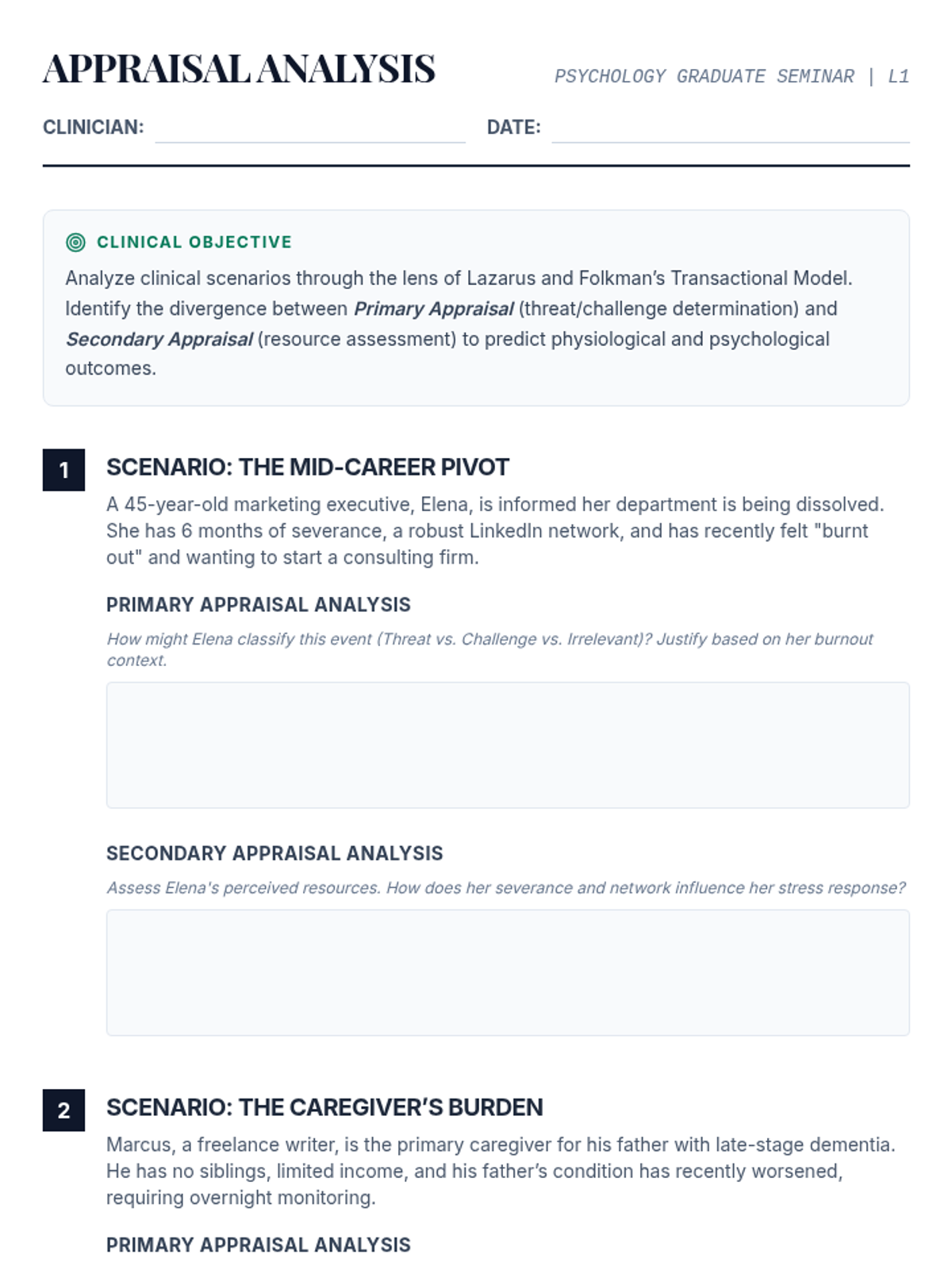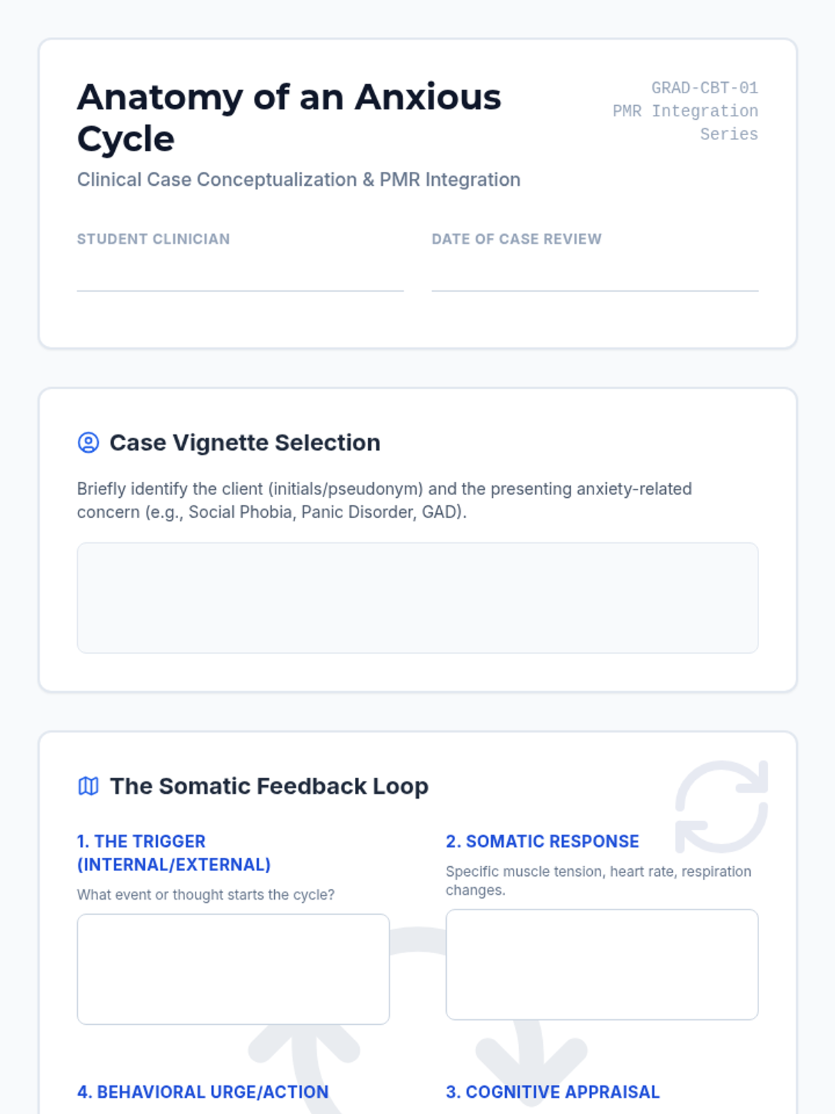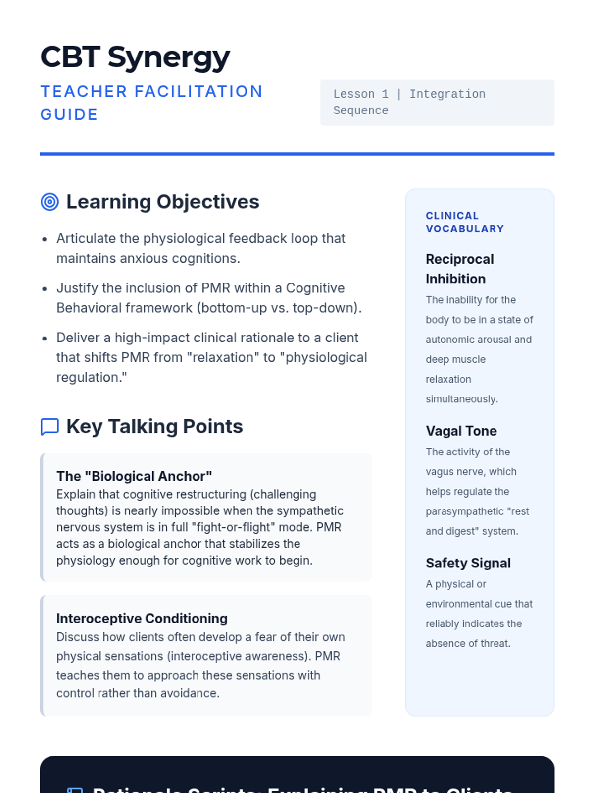 This advanced sequence explores the integration of Progressive Muscle Relaxation (PMR) within comprehensive therapeutic frameworks like CBT and Systematic Desensitization. Graduate students will move from theoretical understanding to constructing sophisticated multimodal treatment plans for complex clinical cases.