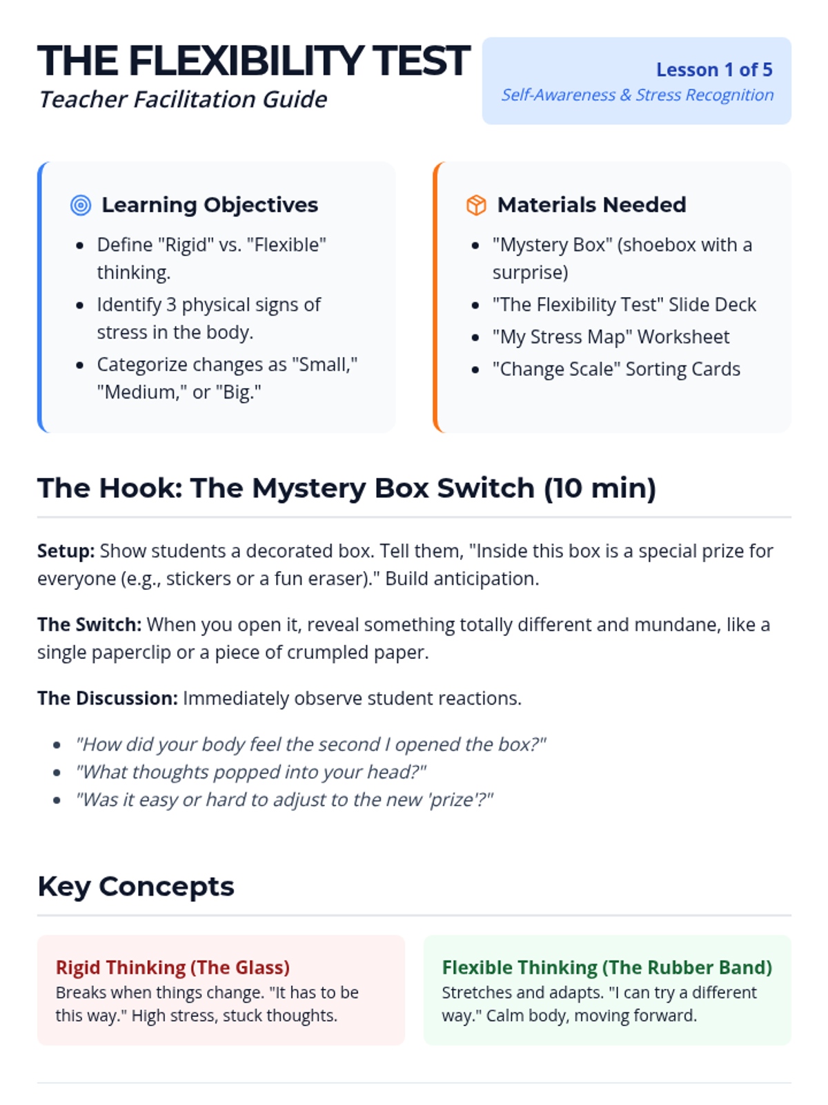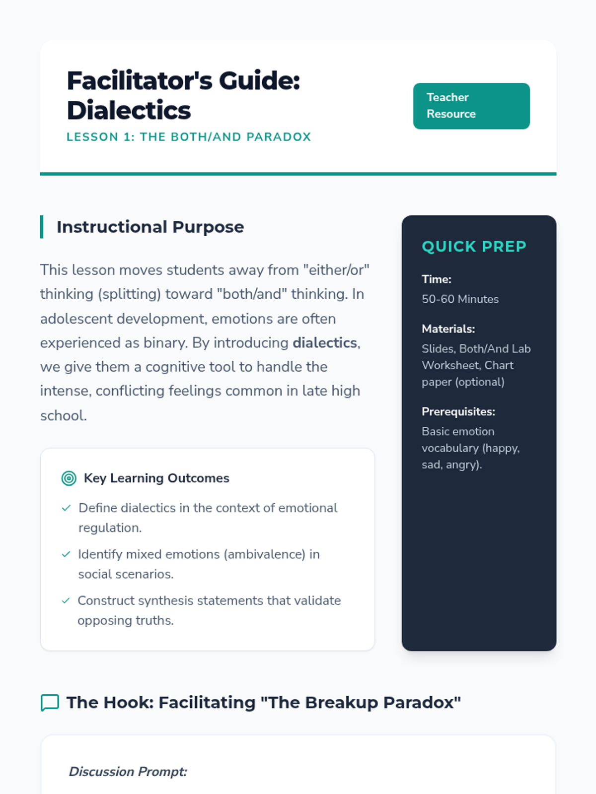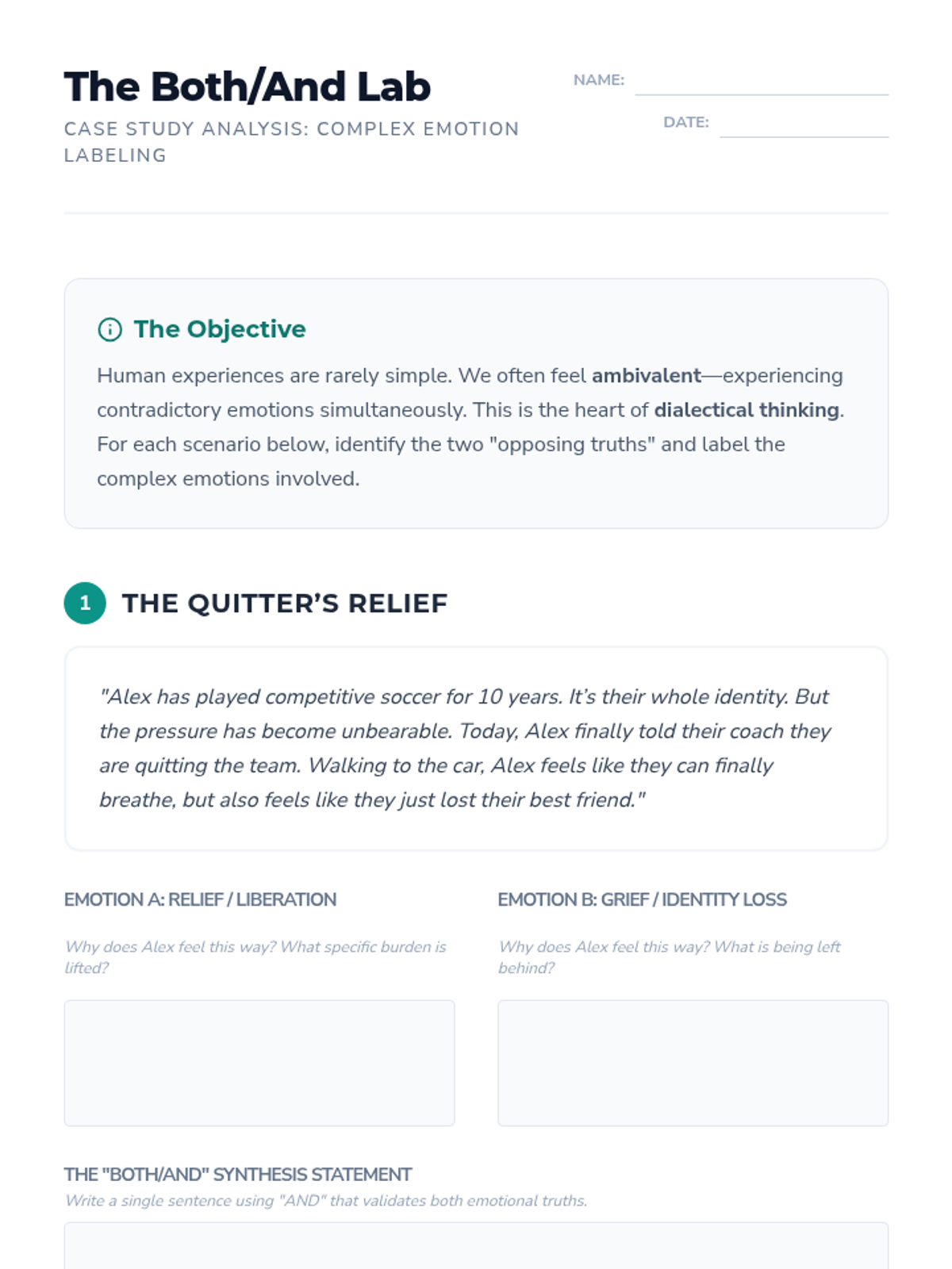 A comprehensive unit for 11th-grade students focusing on complex emotion labeling through dialectical thinking, case studies of imposter syndrome, empathy gap analysis, and transition-related emotions. Students develop sophisticated perspective-taking and conflict-resolution skills by moving beyond surface-level labels to identify mixed emotional states.