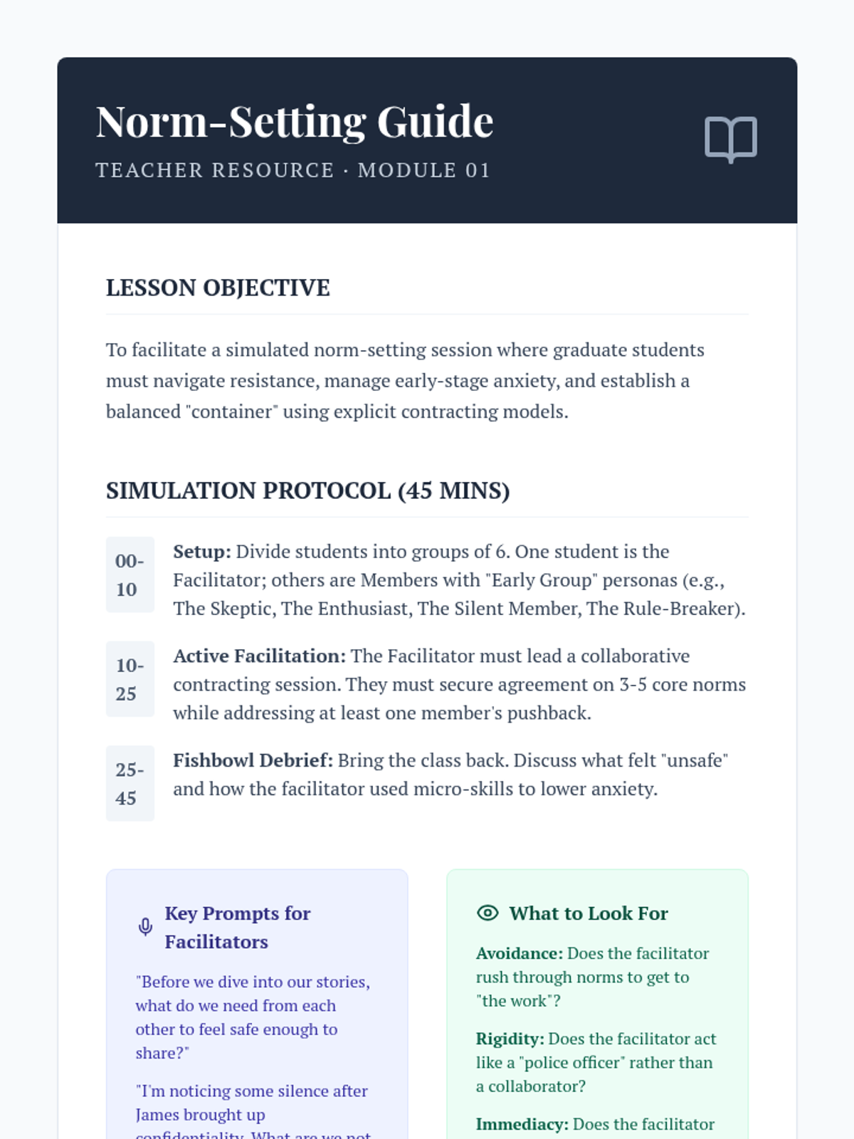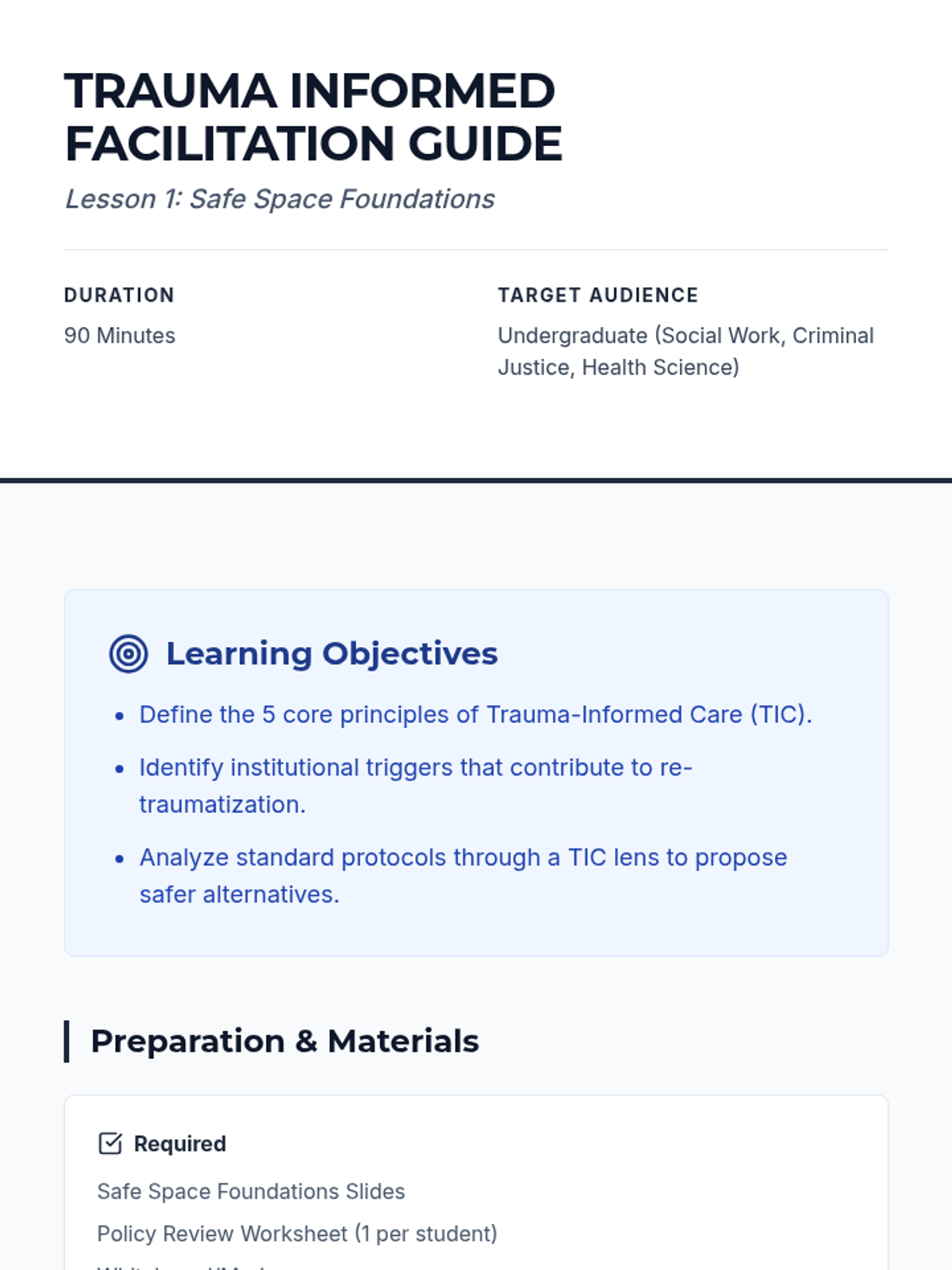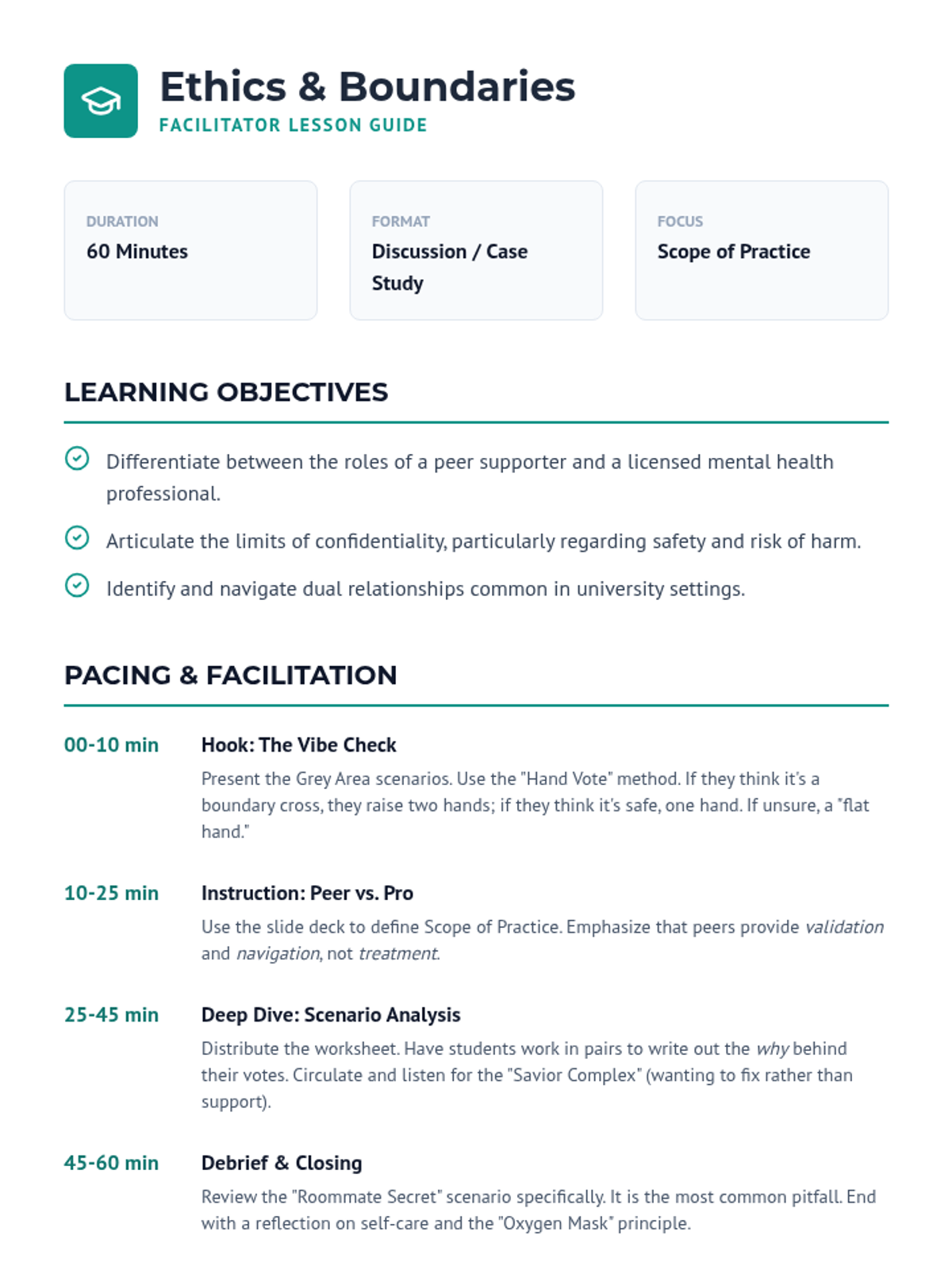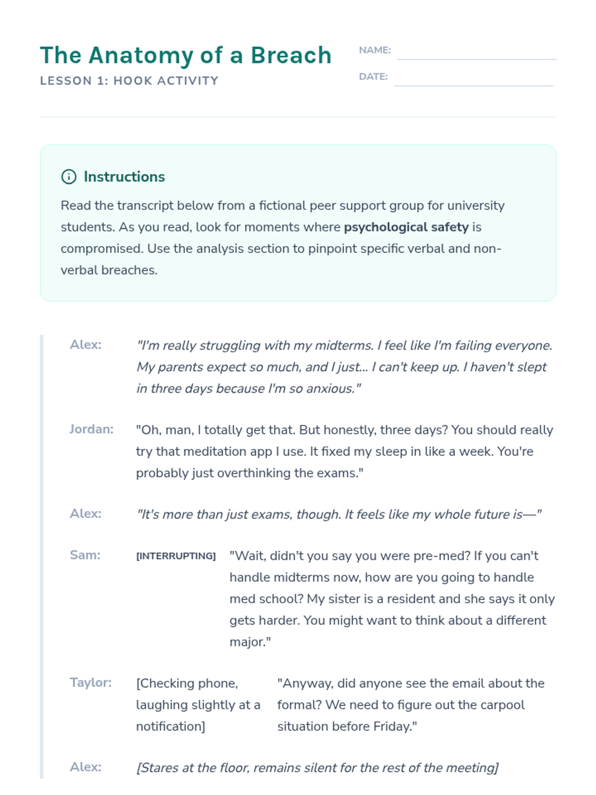 This sequence trains undergraduate students in the foundational mechanisms required to build and maintain safe peer support environments. Students progress from theoretical psychological safety to practical microskills, empathy, boundary management, and group facilitation.