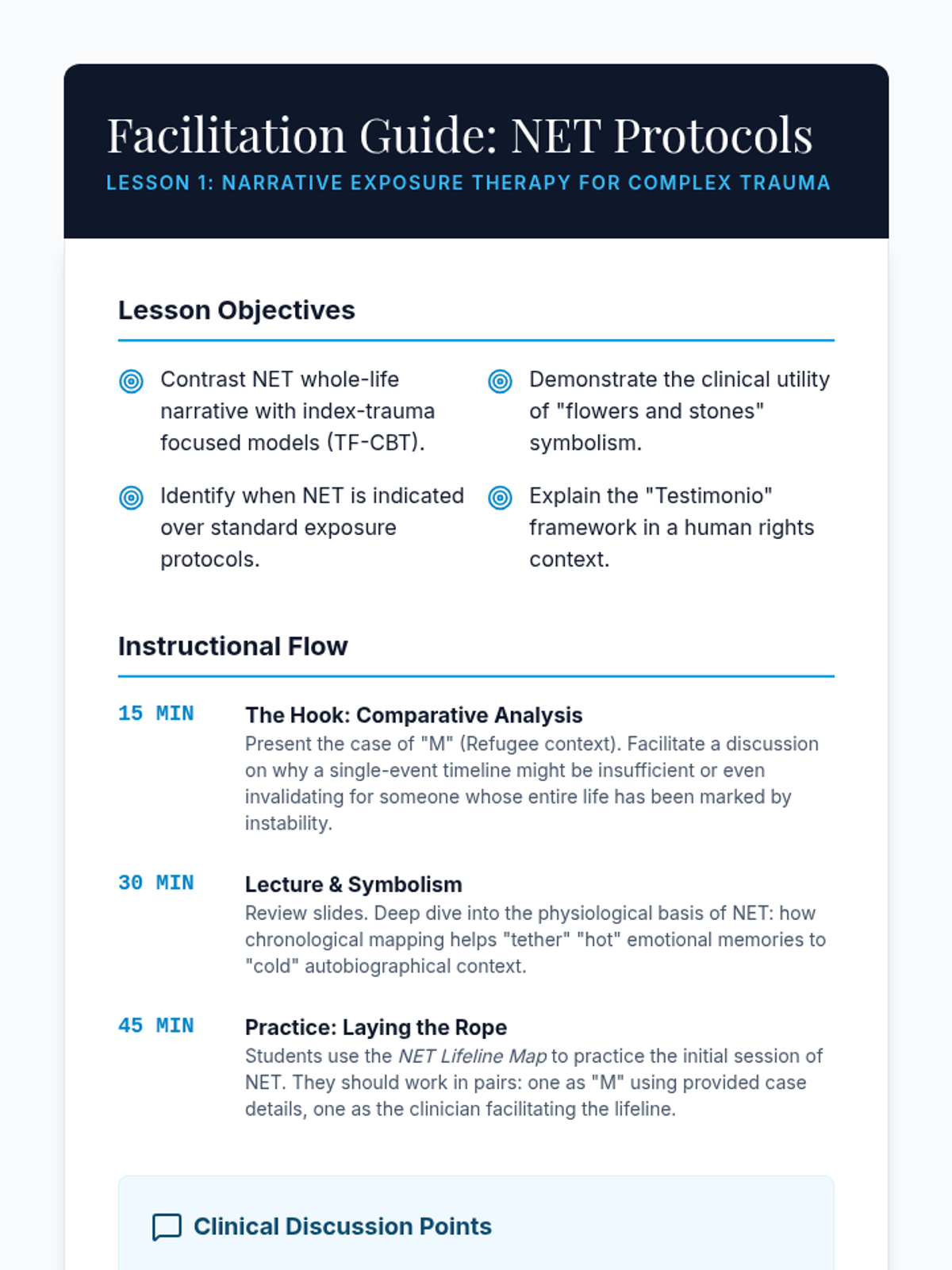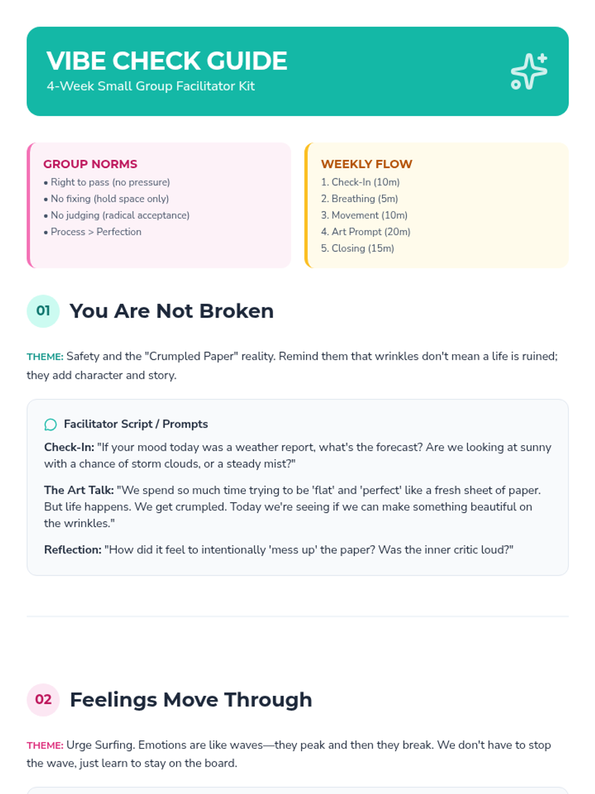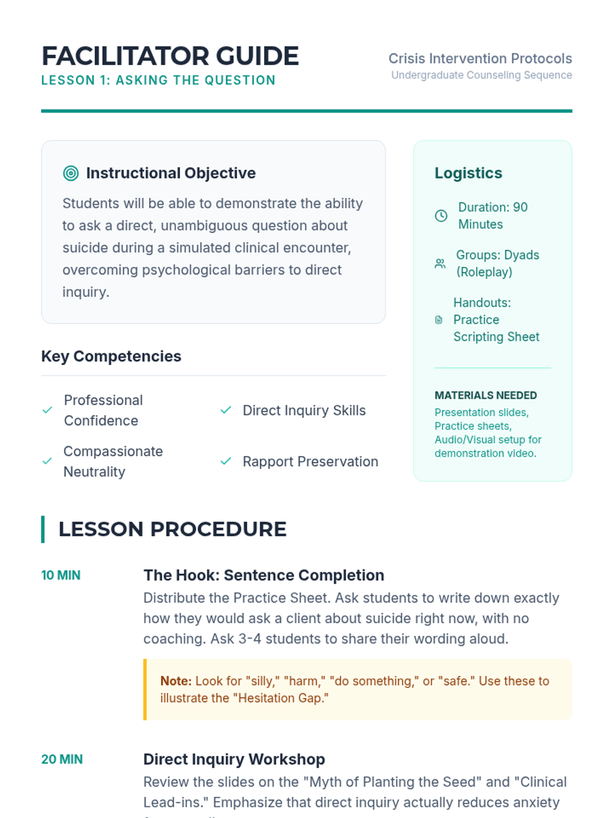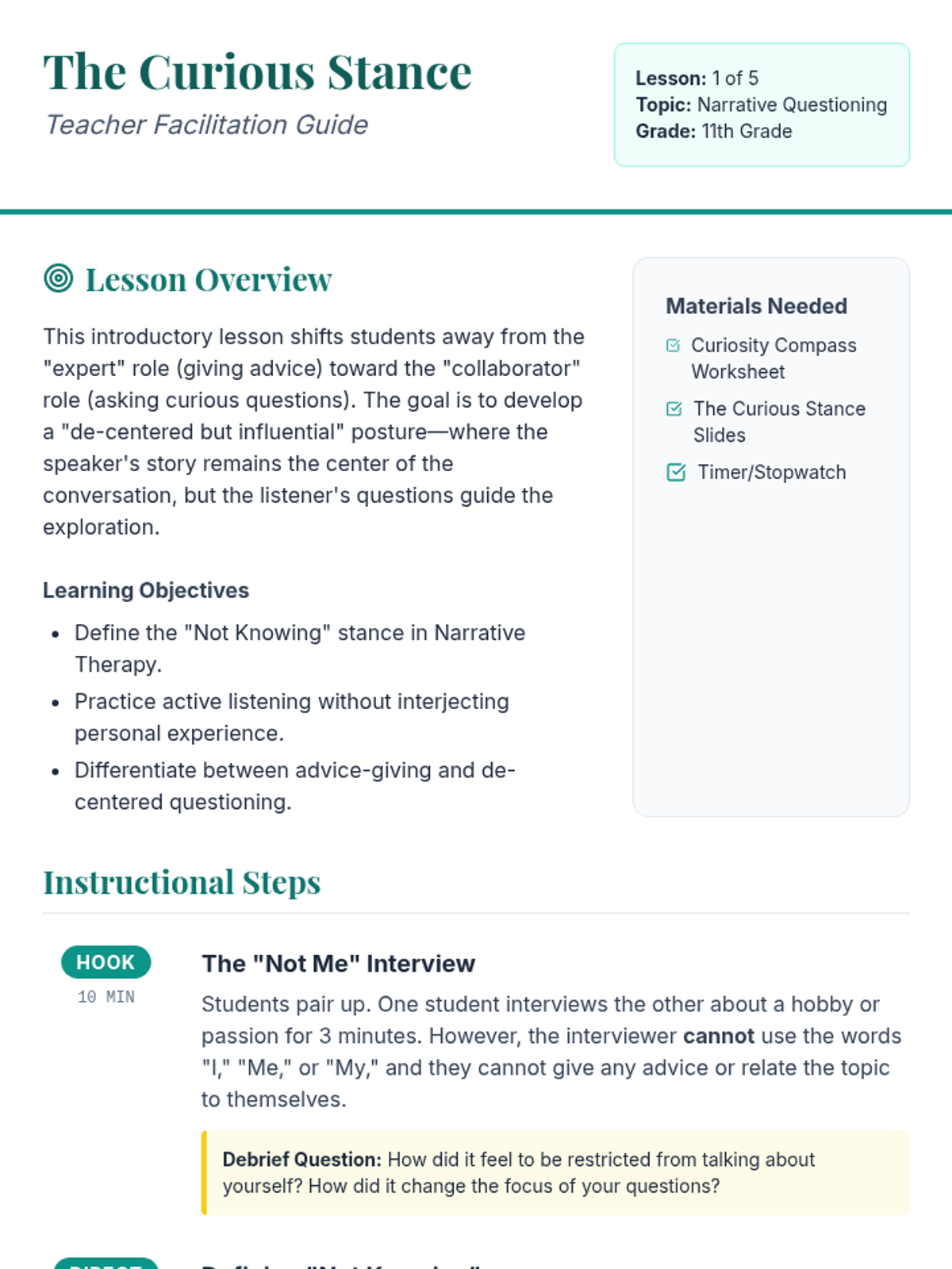 This sequence trains undergraduate students in the foundational mechanisms required to build and maintain safe peer support environments. Students progress from theoretical psychological safety to practical microskills, empathy, boundary management, and group facilitation.