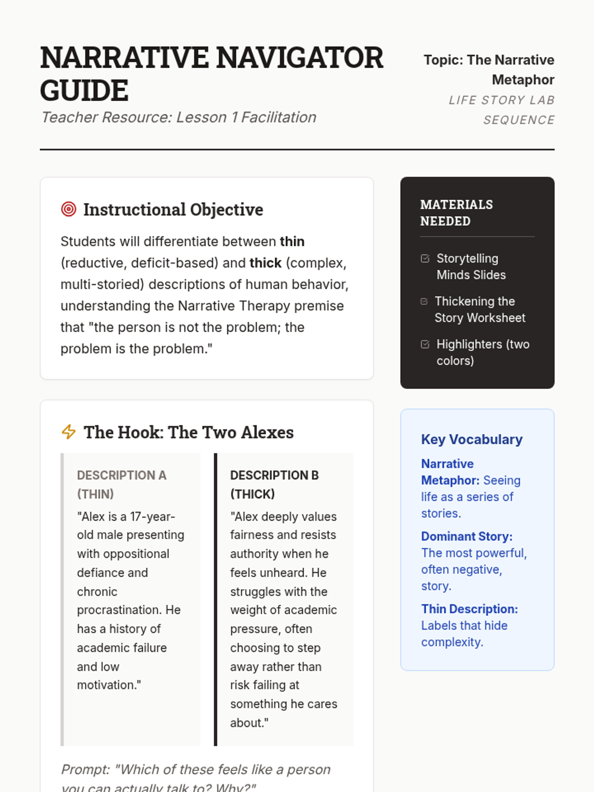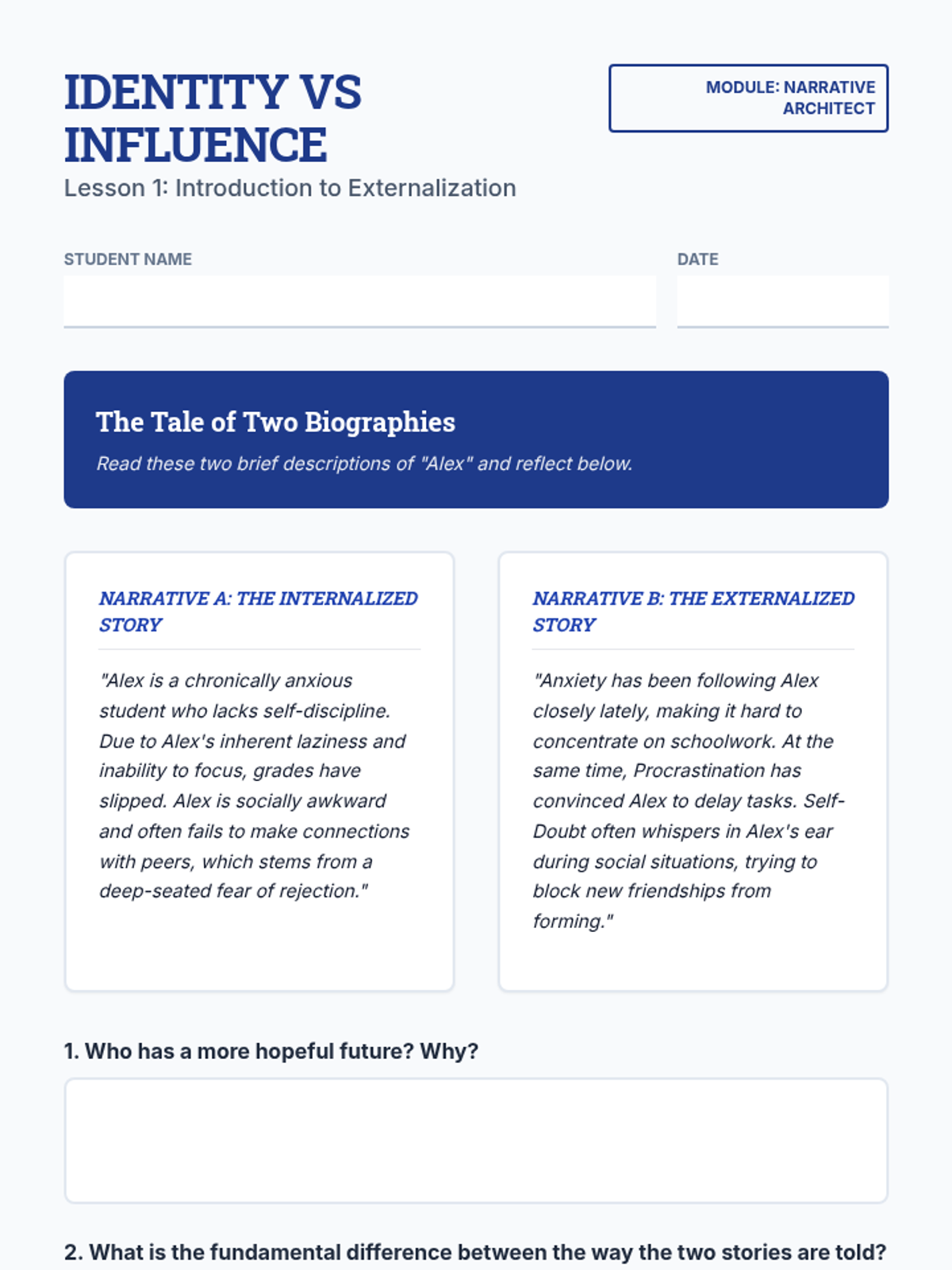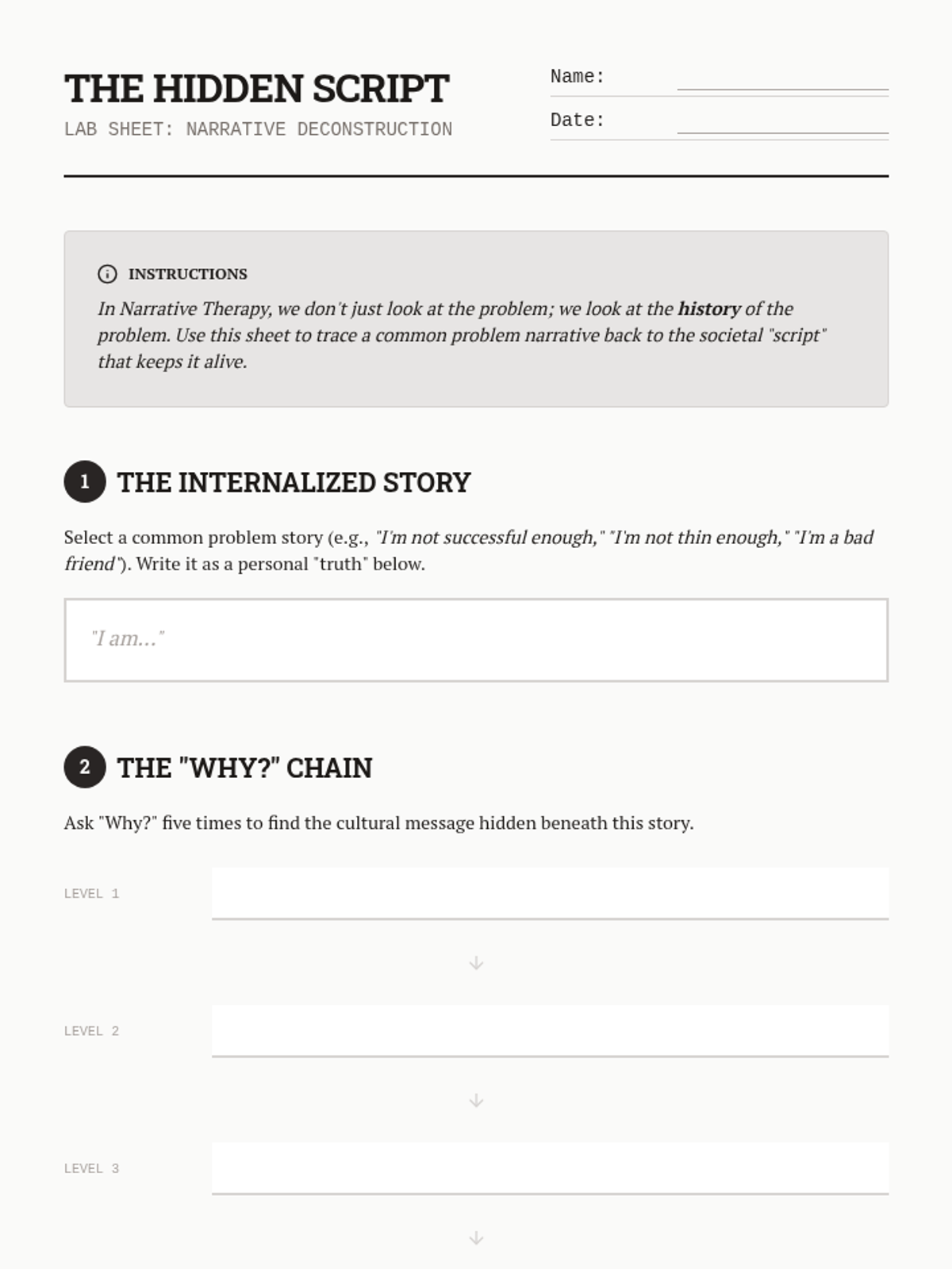 Processing Through NarrativeReauthoring techniques and externalizing conversations to help clients reconstruct personal identities. Examines how dominant narratives shape meaning and supports the development of alternative life stories.