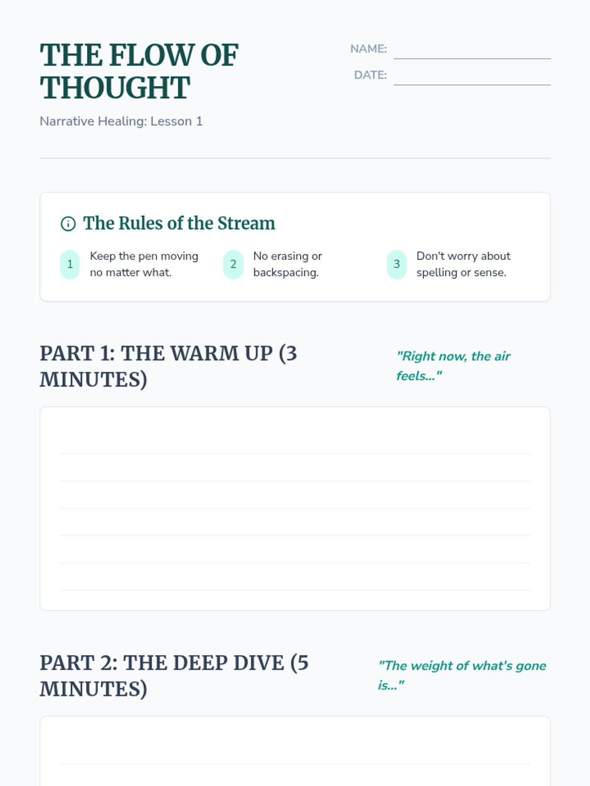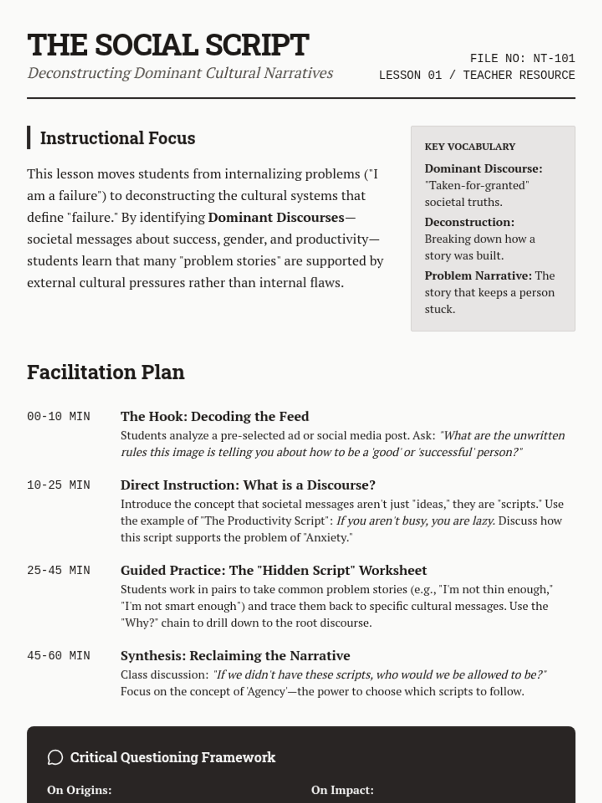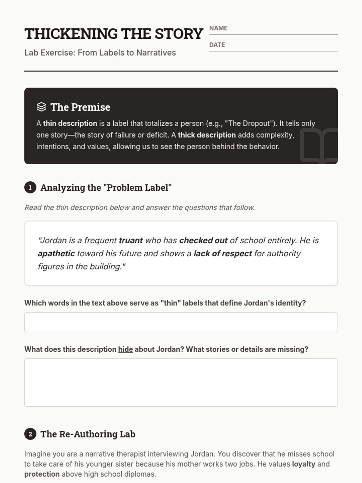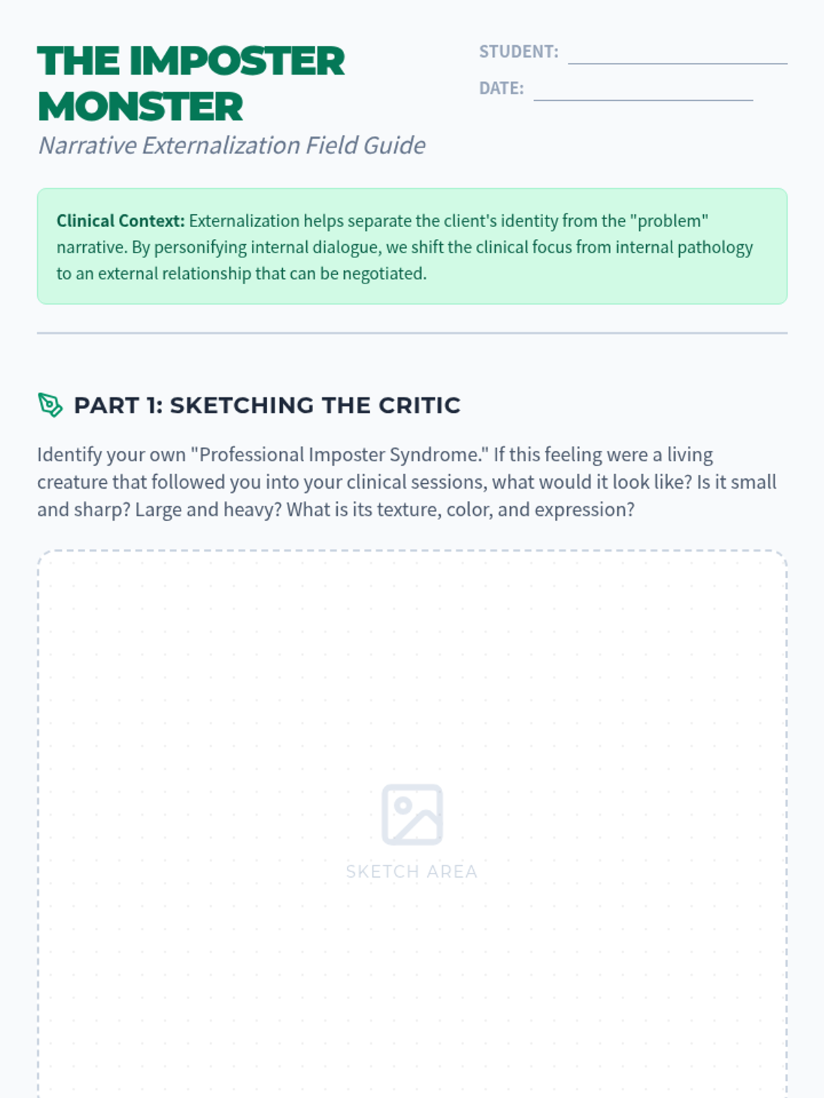 Processing Through NarrativeReauthoring techniques and externalizing conversations to help clients reconstruct personal identities. Examines how dominant narratives shape meaning and supports the development of alternative life stories.