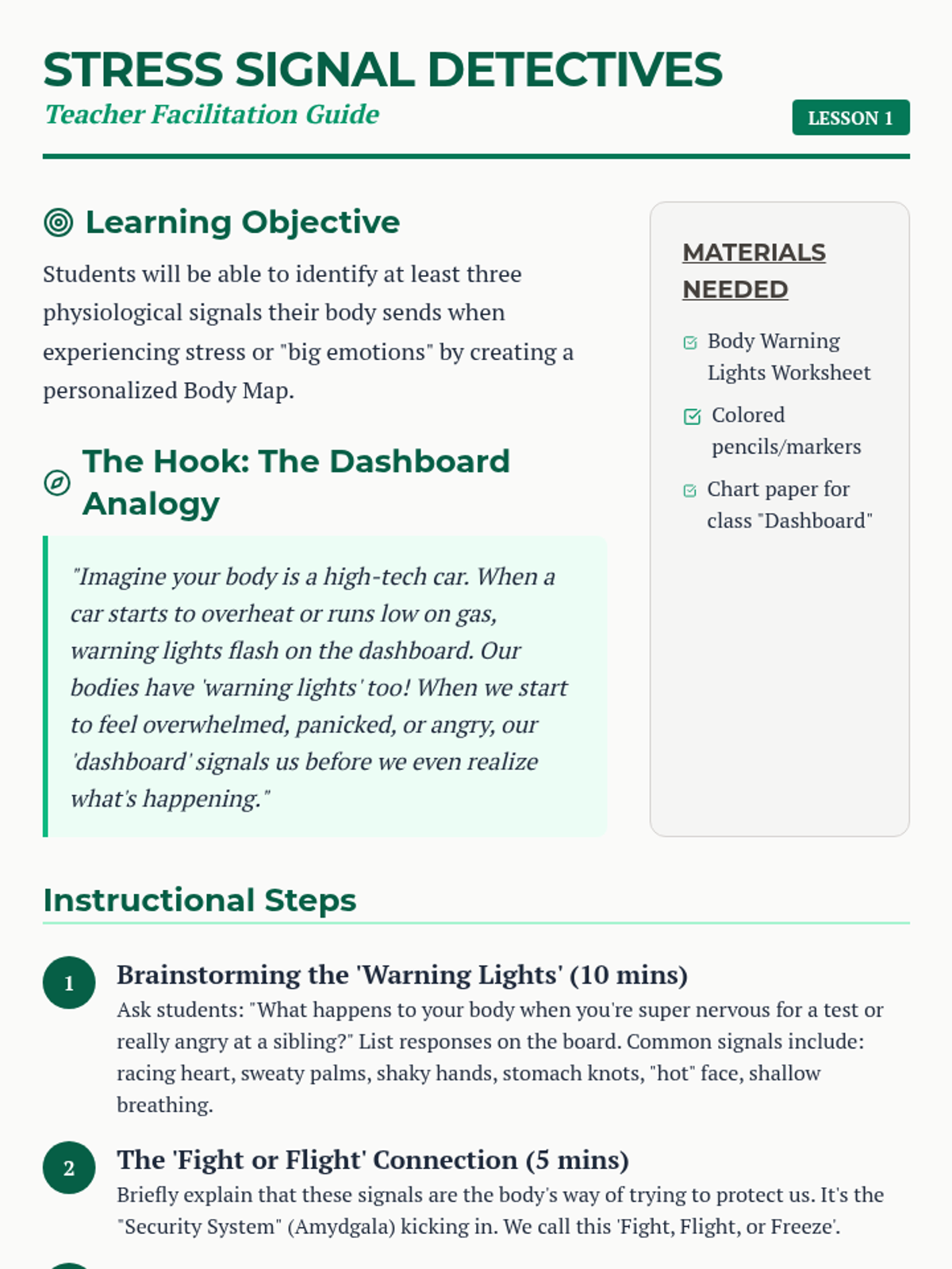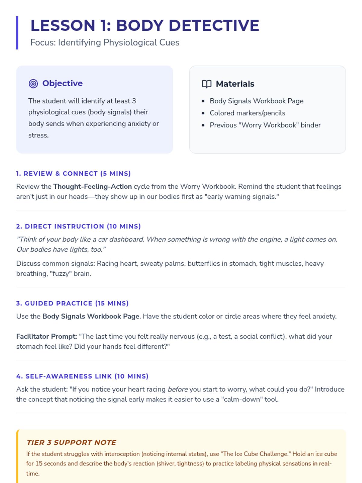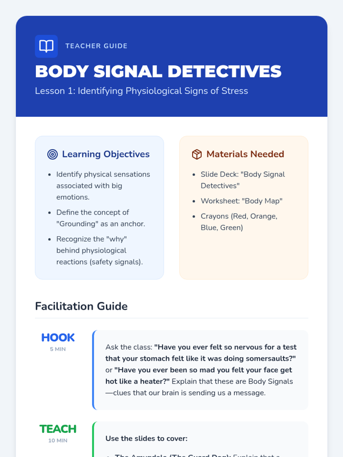 Complex Emotion LabelingNuanced emotional identification techniques that go beyond basic categories like happy or sad. Builds emotional literacy and self-regulation by connecting physiological cues to specific affective labels.