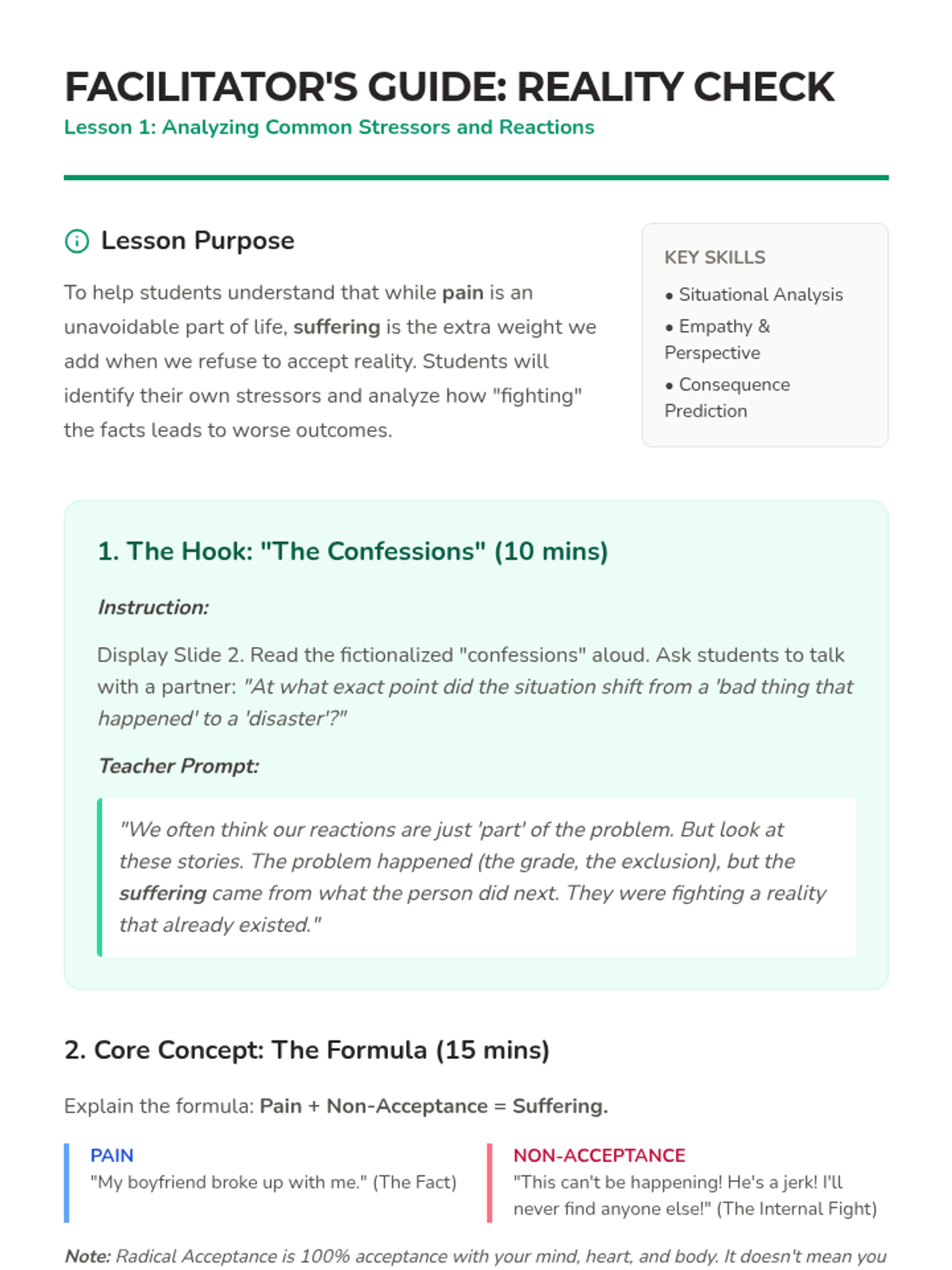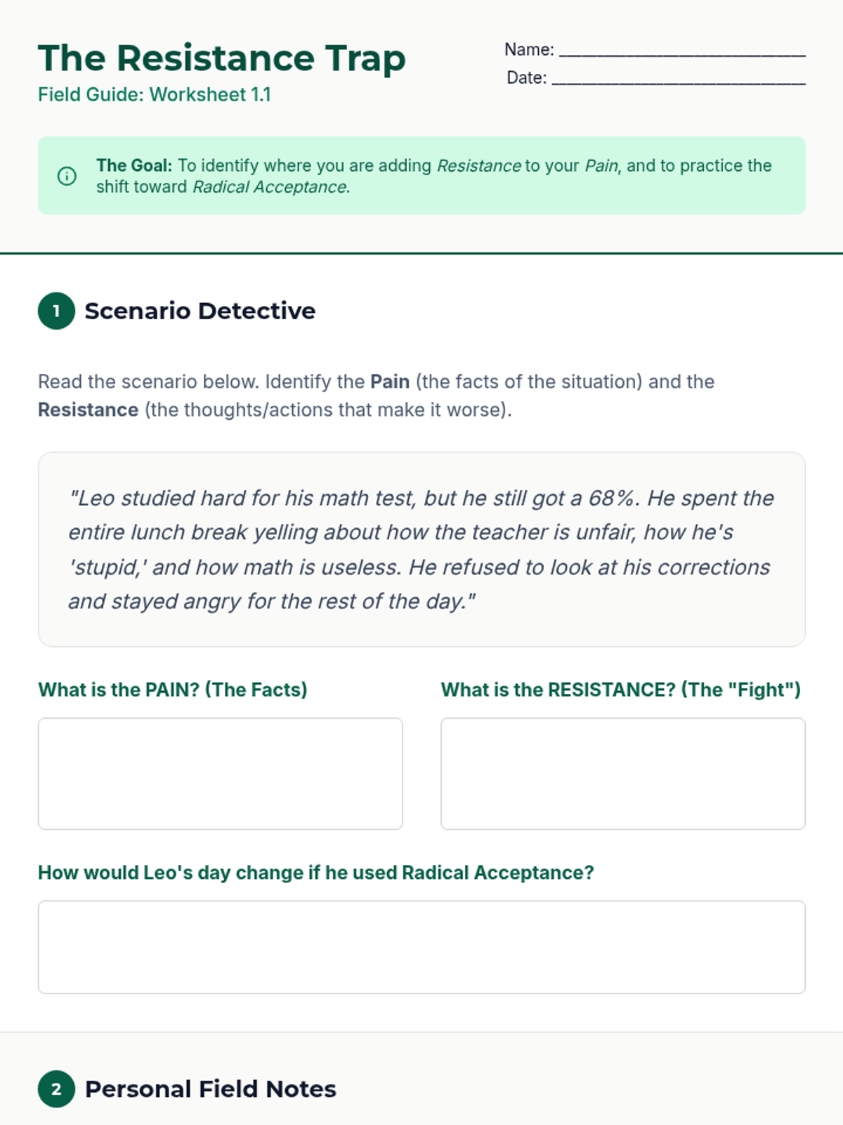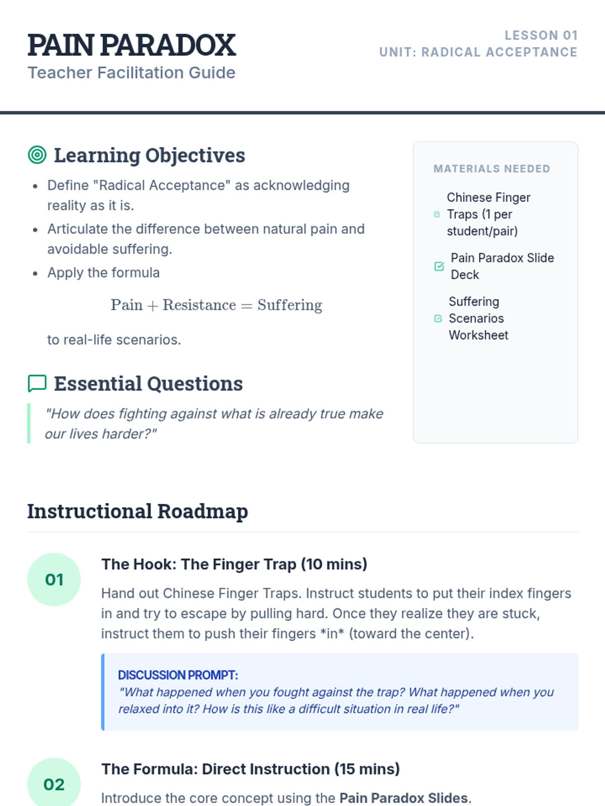 Radical Acceptance PracticeTechniques for acknowledging reality without judgment to reduce emotional suffering and psychological resistance. Develops distress tolerance skills through mindfulness, cognitive reframing, and acceptance-based coping strategies.