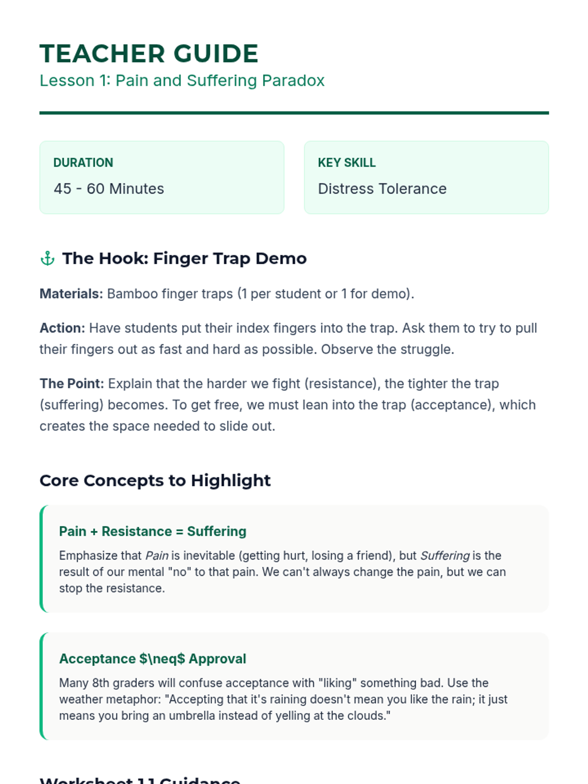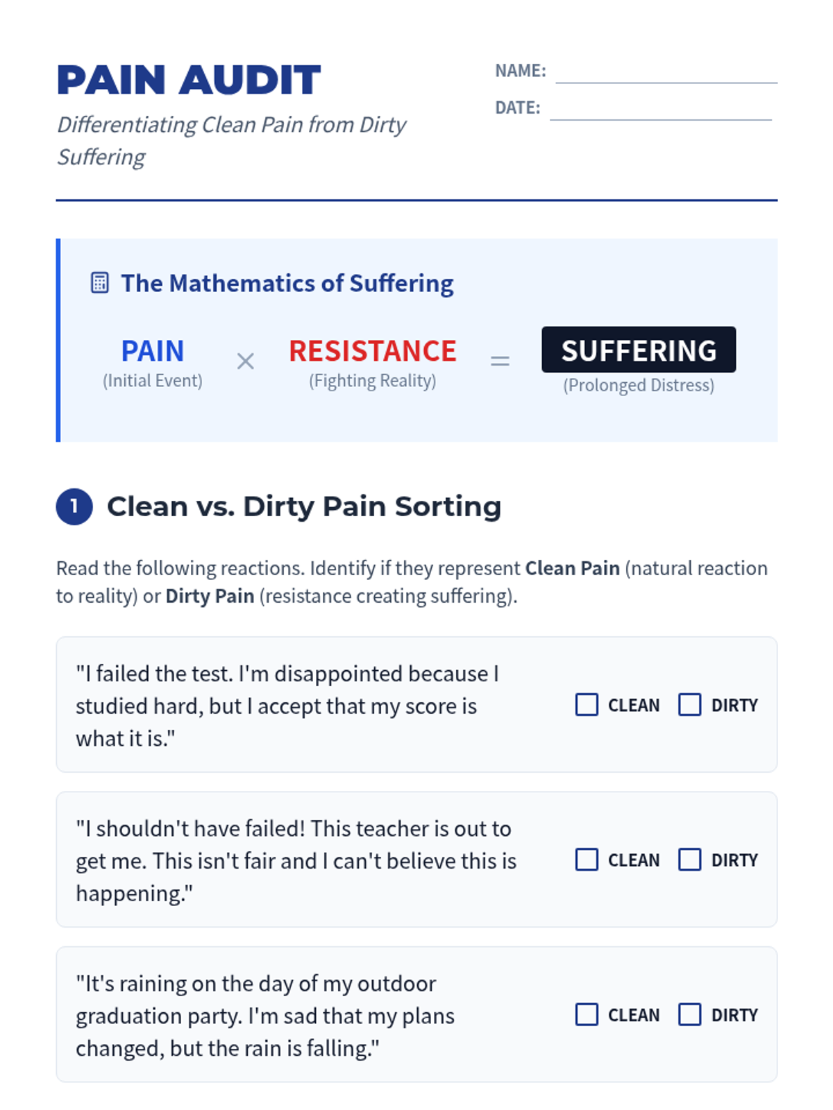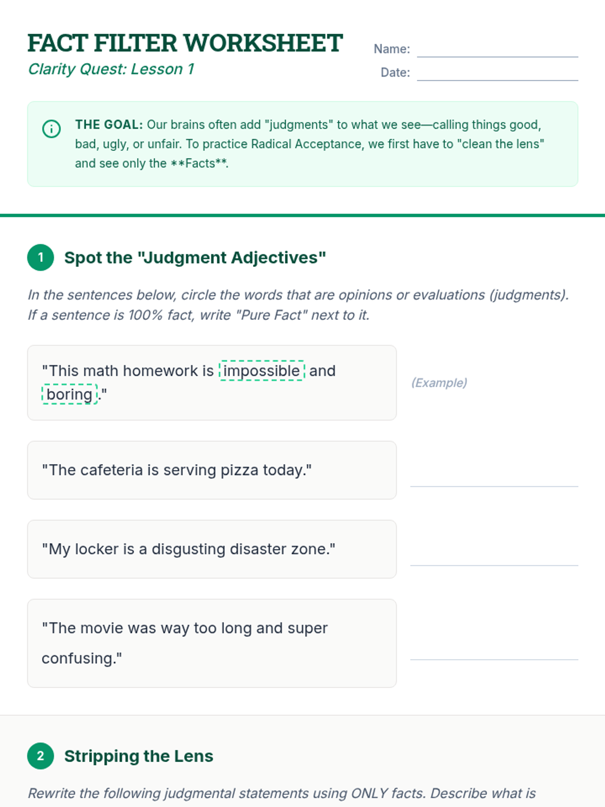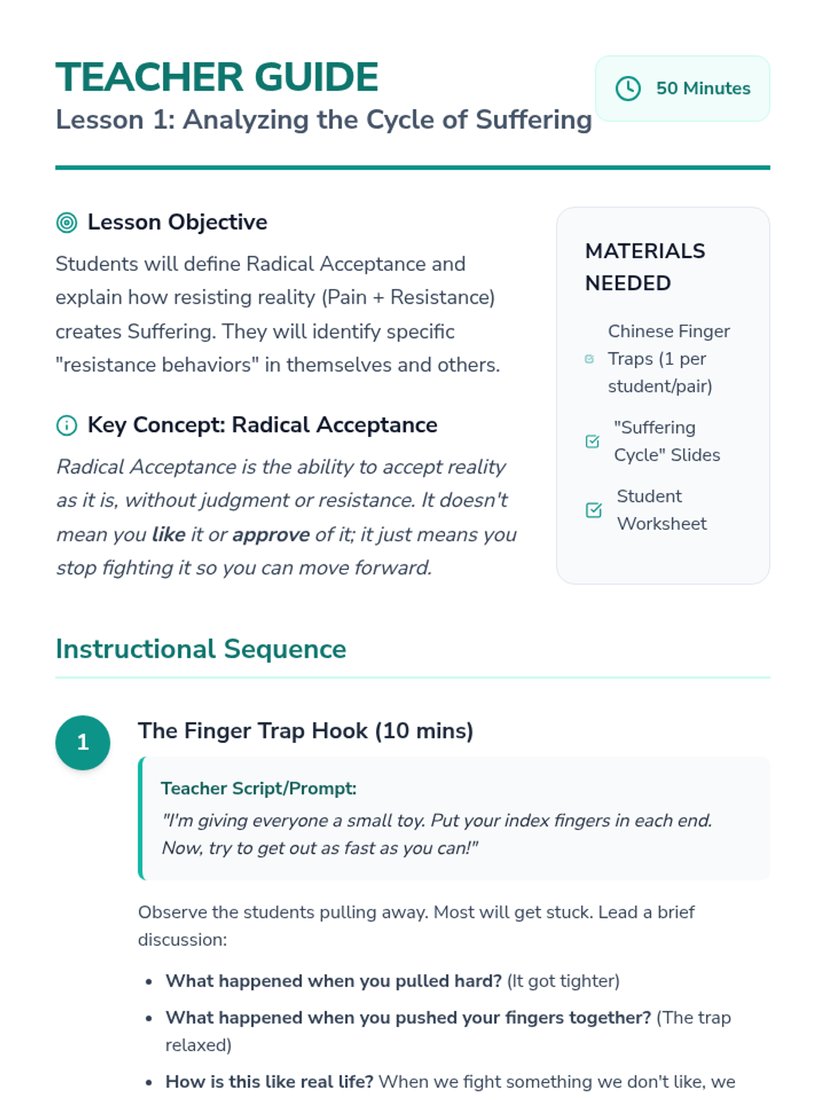 Radical Acceptance PracticeTechniques for acknowledging reality without judgment to reduce emotional suffering and psychological resistance. Develops distress tolerance skills through mindfulness, cognitive reframing, and acceptance-based coping strategies.