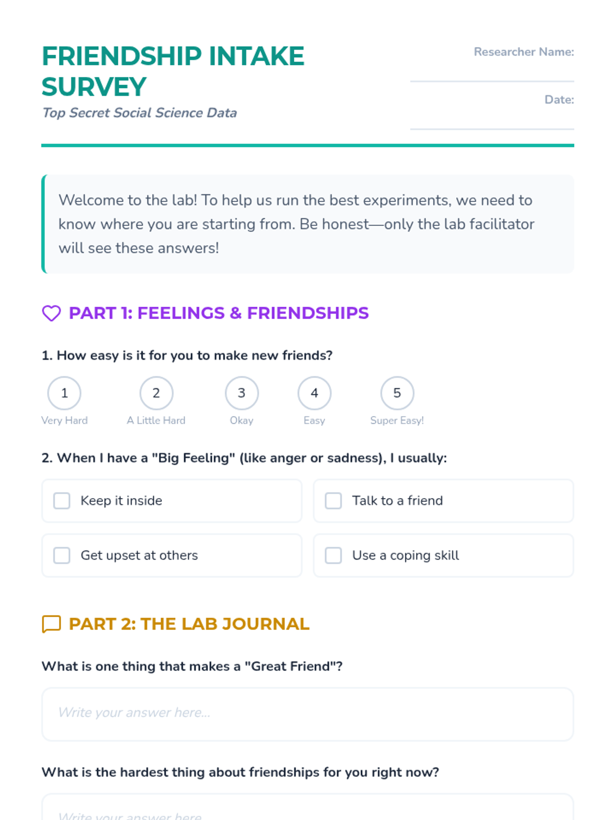 A 6-week social-emotional learning unit for a small group of 4th grade girls, focusing on friendship dynamics, emotional regulation, and conflict resolution through the lens of a 'Friendship Lab'.