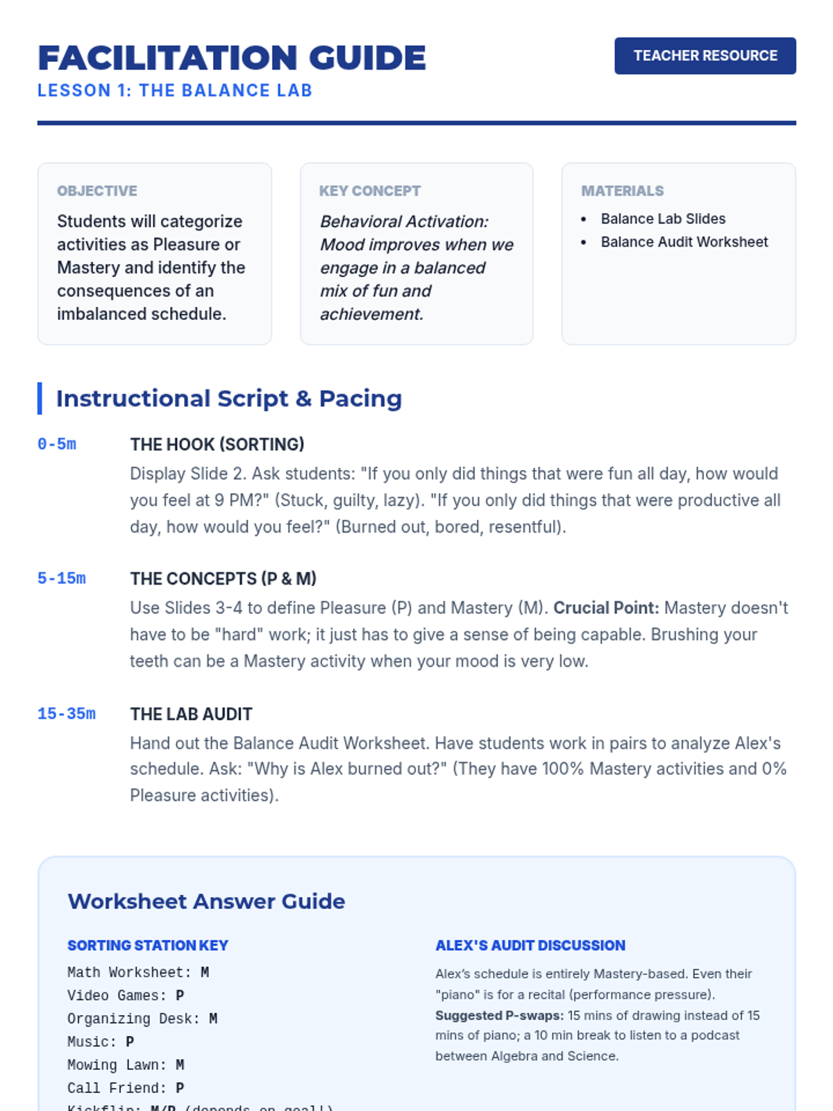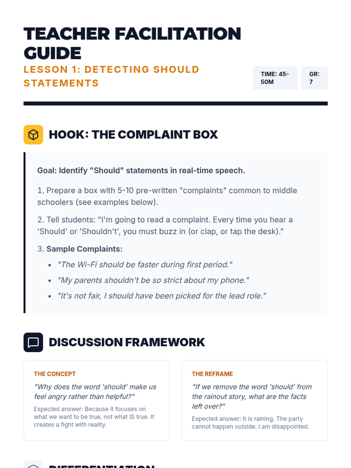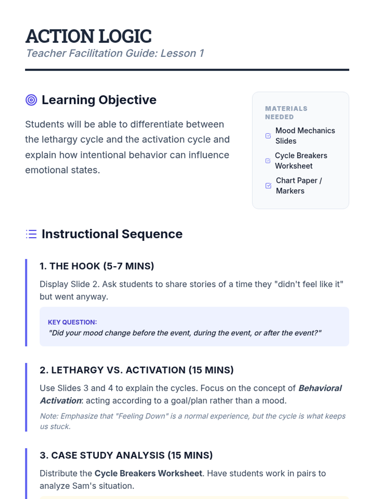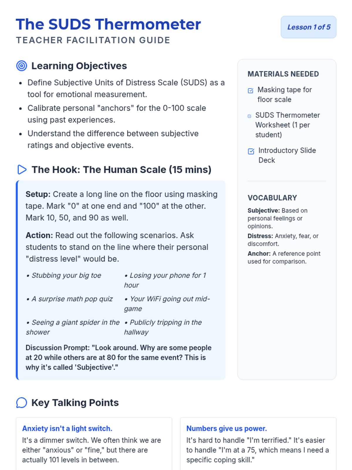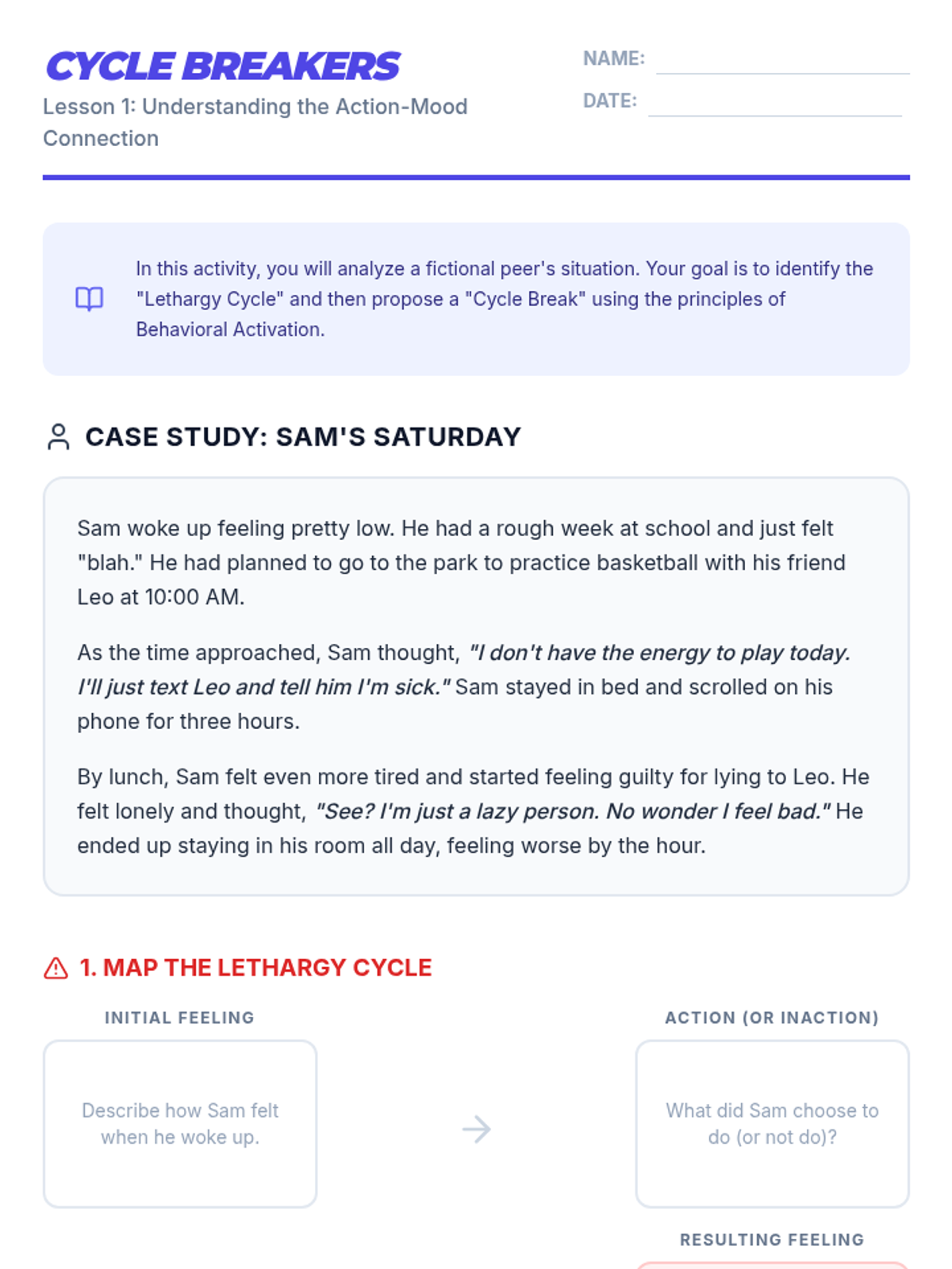 This sequence introduces 7th-grade students to cognitive restructuring through the use of Thought Records. Students will explore the 'Cognitive Triangle,' identify cognitive distortions (ANTs), and learn to evaluate thoughts as hypotheses by examining evidence to generate balanced perspectives and regulate emotional responses.