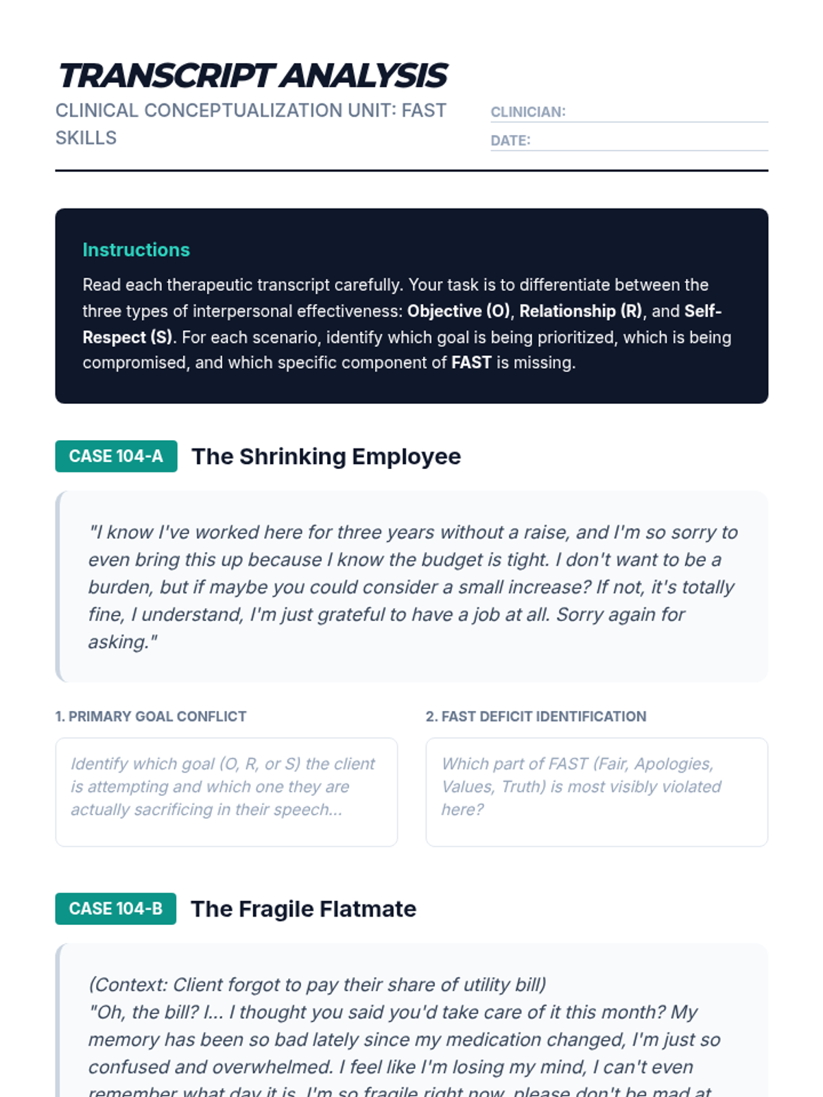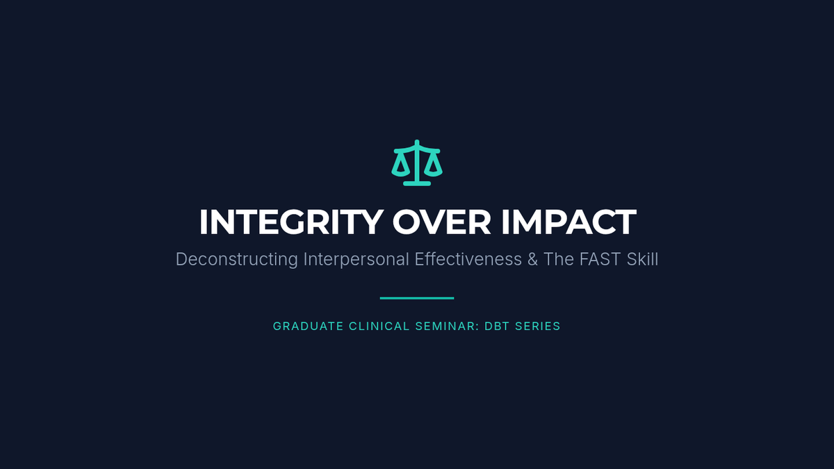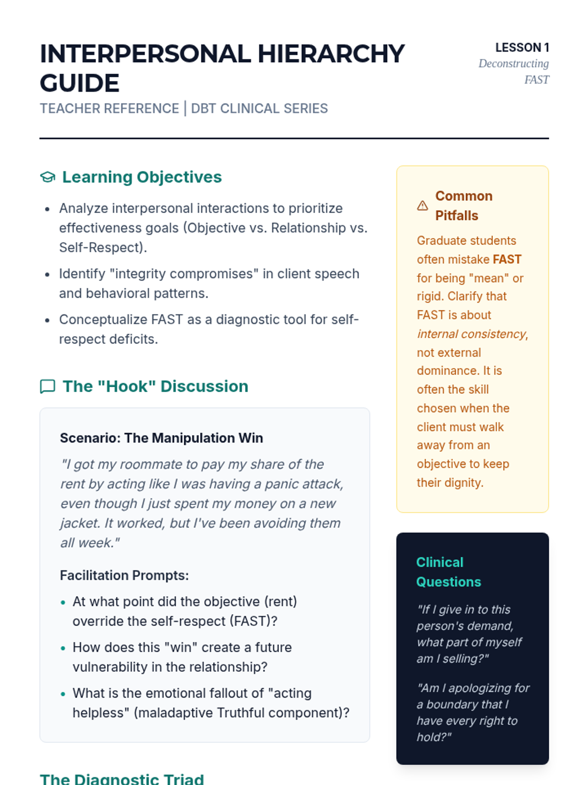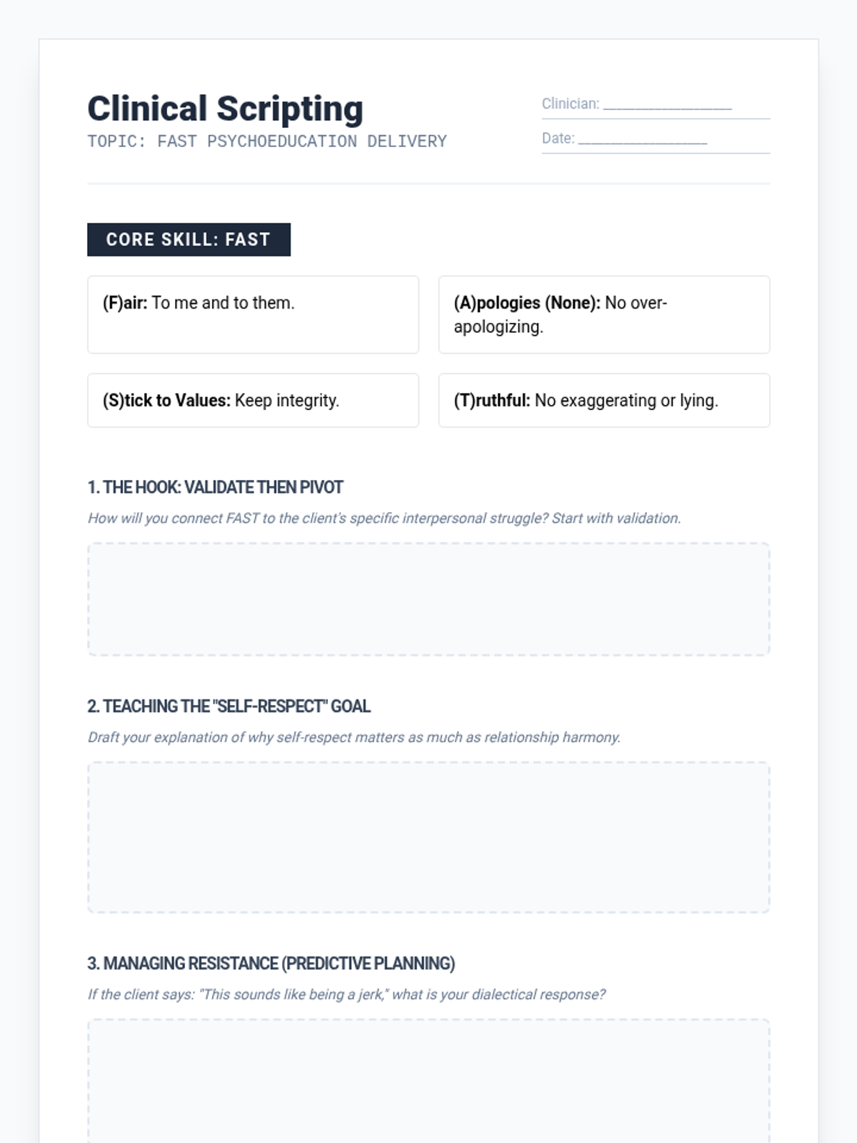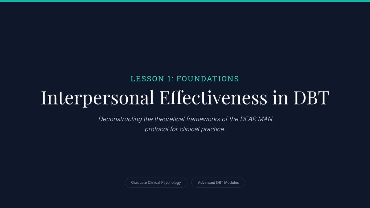 An advanced clinical training sequence for graduate students to master the DBT DEAR MAN communication protocol, focusing on theoretical depth, precise scripting, and high-fidelity simulation.