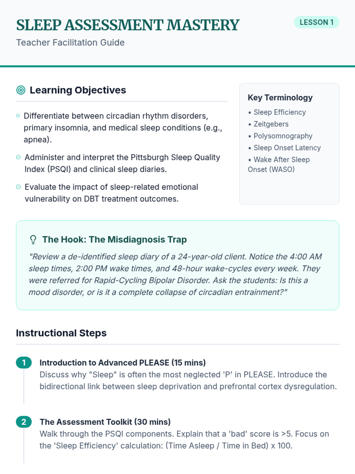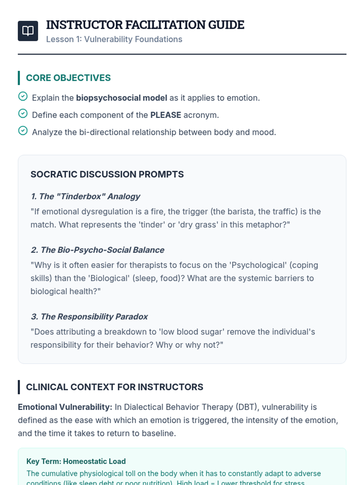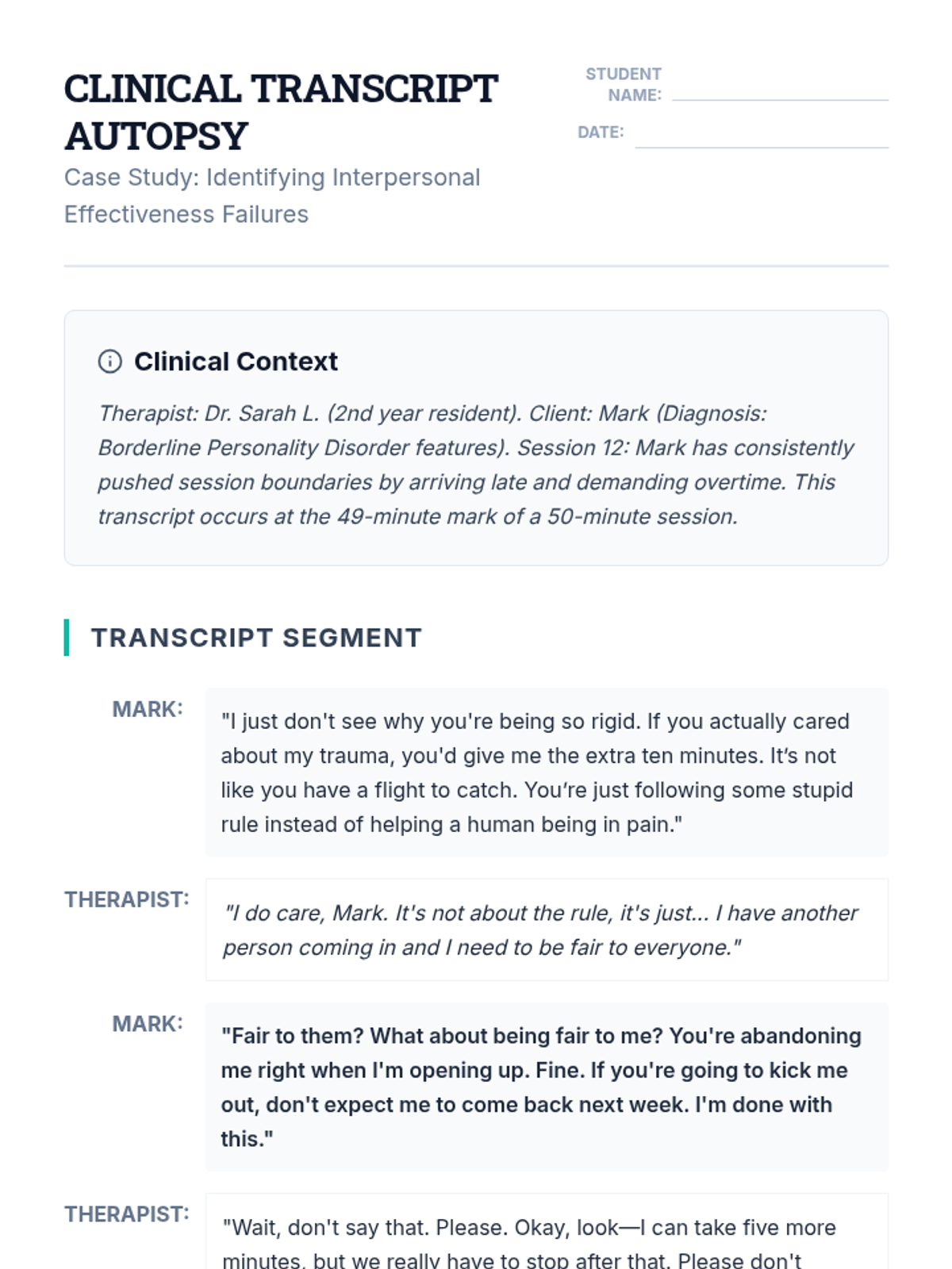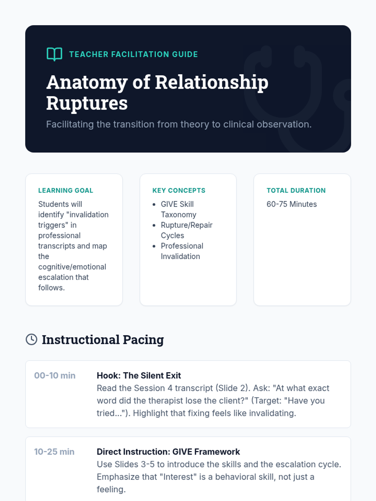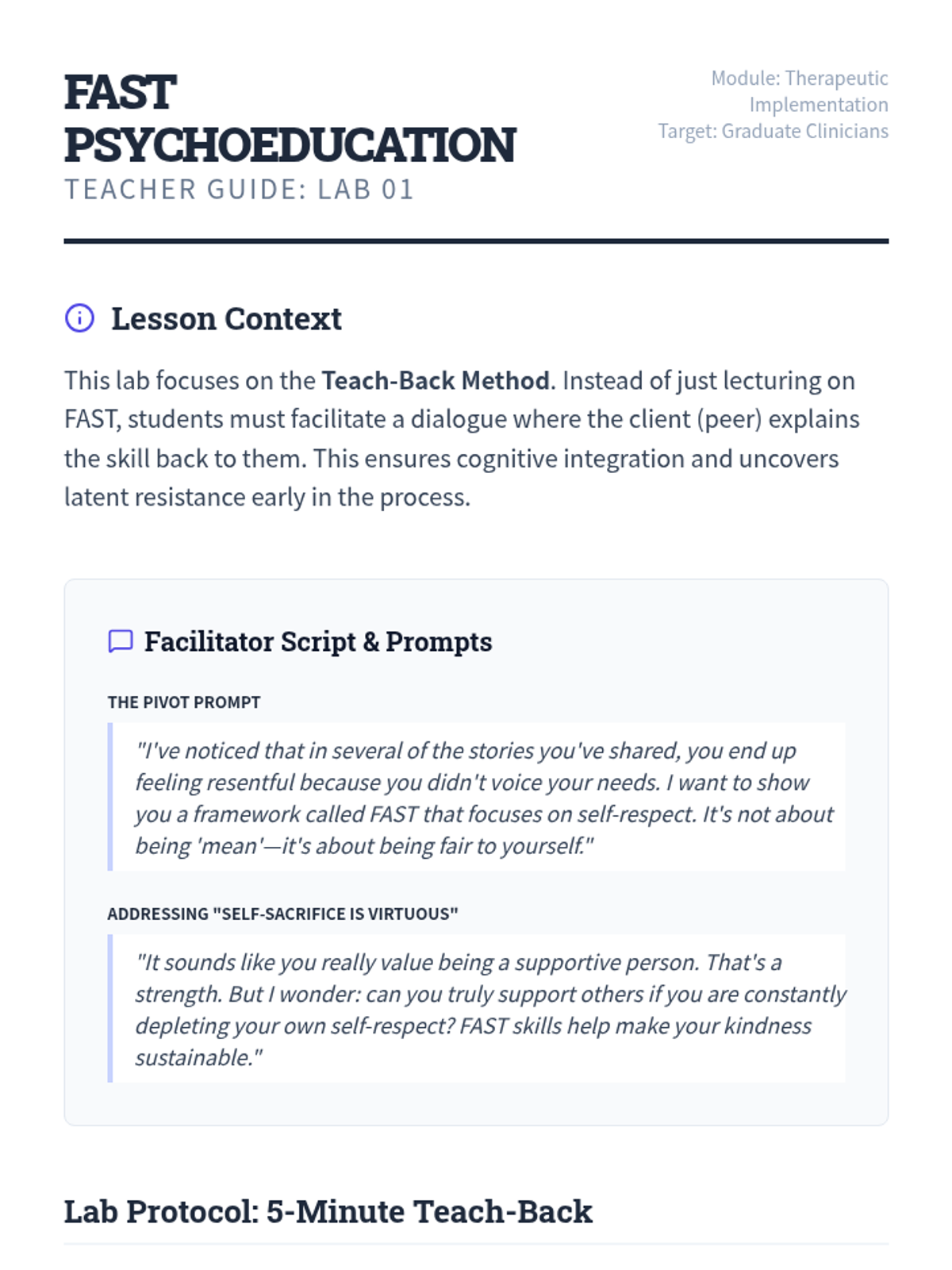 An advanced clinical training sequence for graduate students to master the DBT DEAR MAN communication protocol, focusing on theoretical depth, precise scripting, and high-fidelity simulation.
