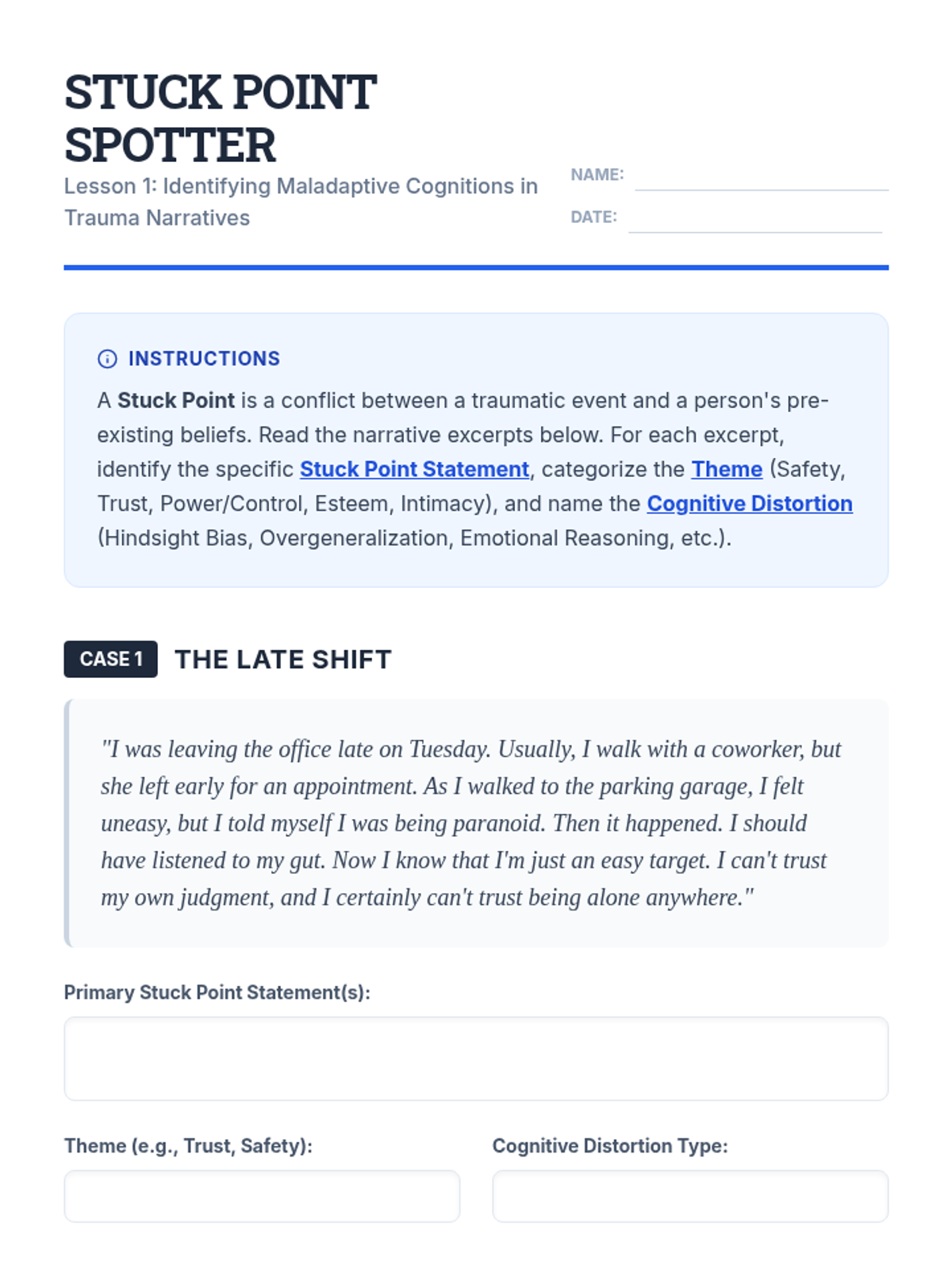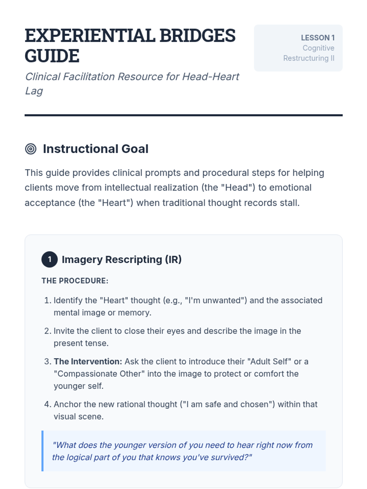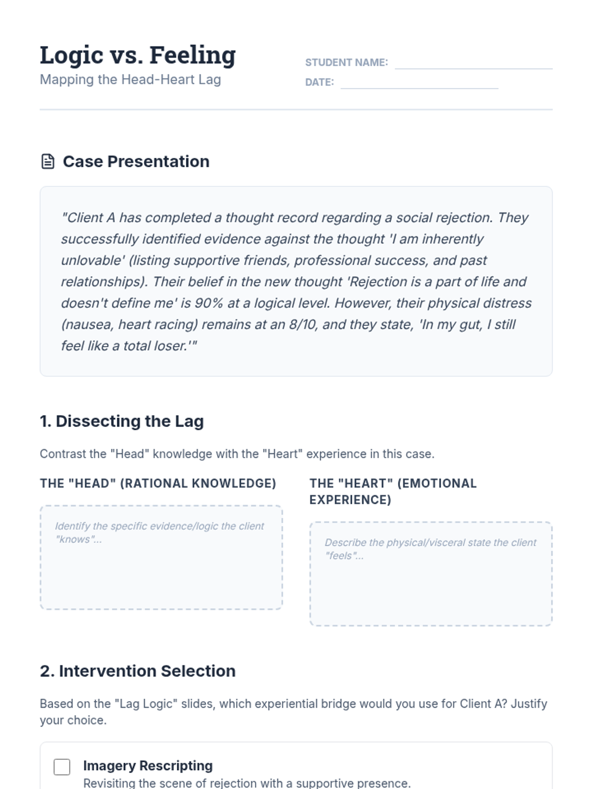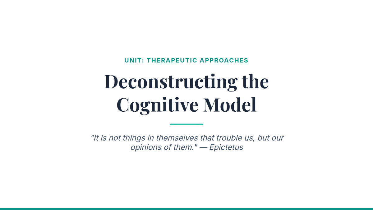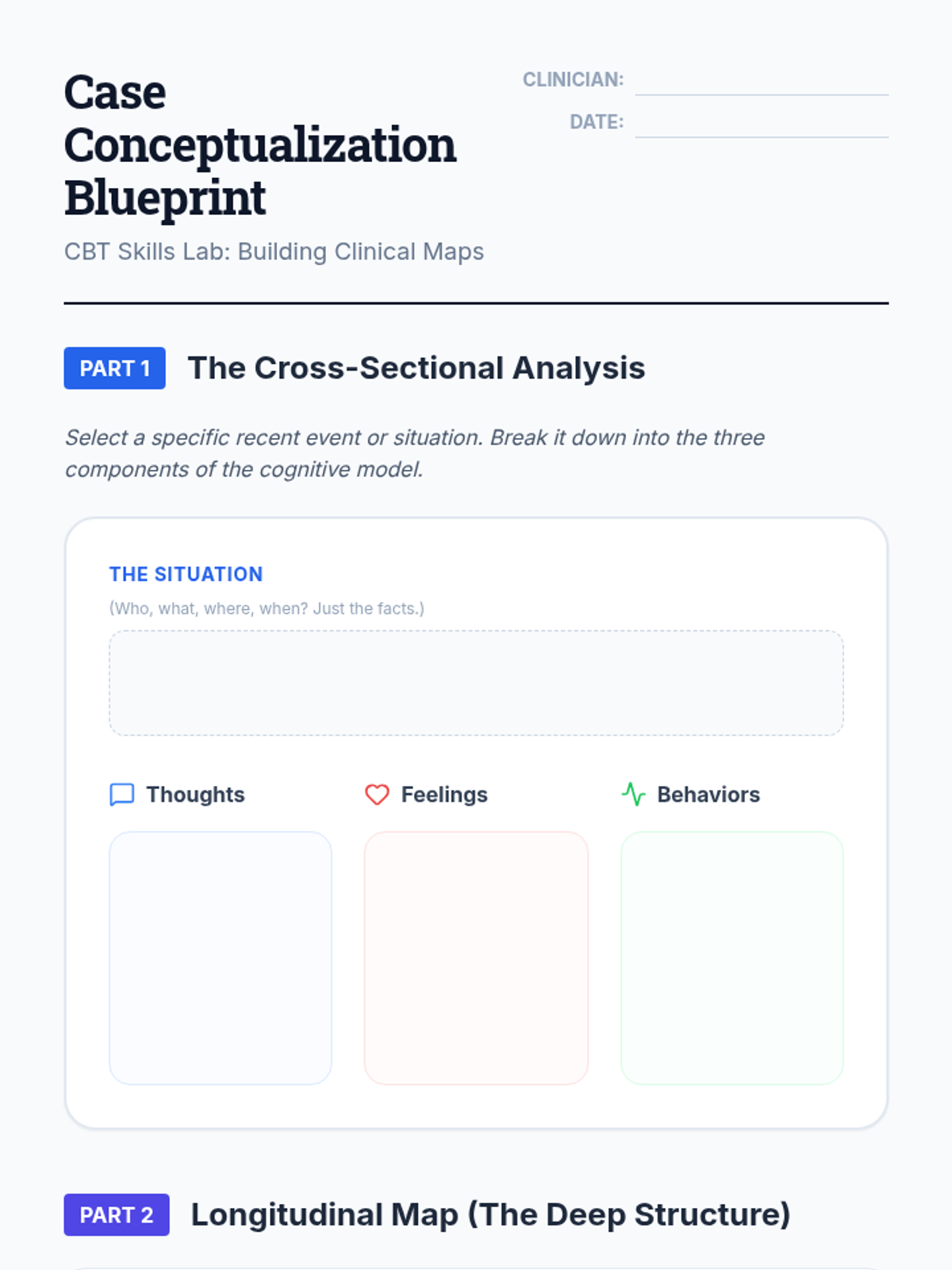 A comprehensive training workshop for graduate students on the clinical implementation of the standard 7-column thought record in Cognitive Behavioral Therapy (CBT). Students move from initial psychoeducation to the precise mechanics of cognitive restructuring and troubleshooting client compliance.