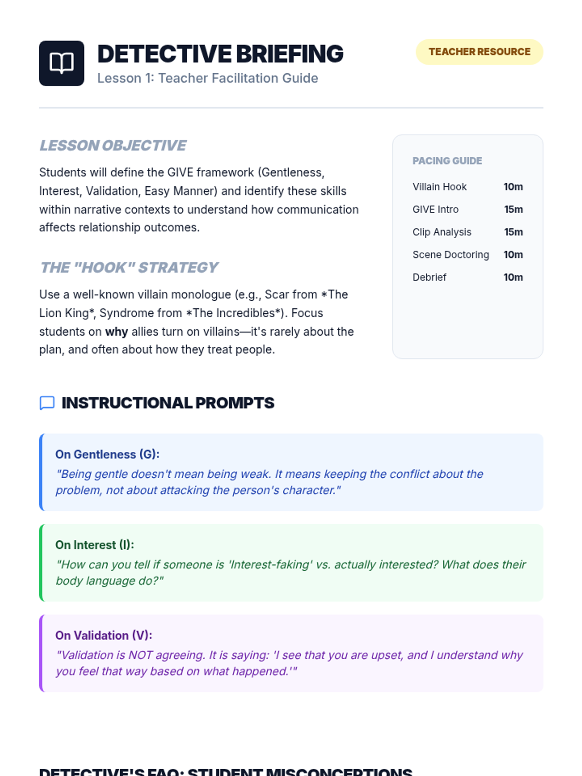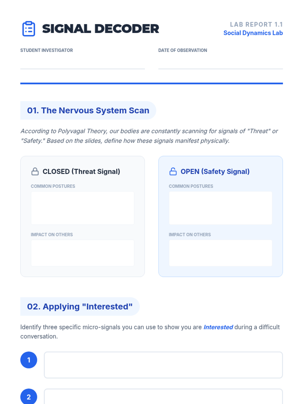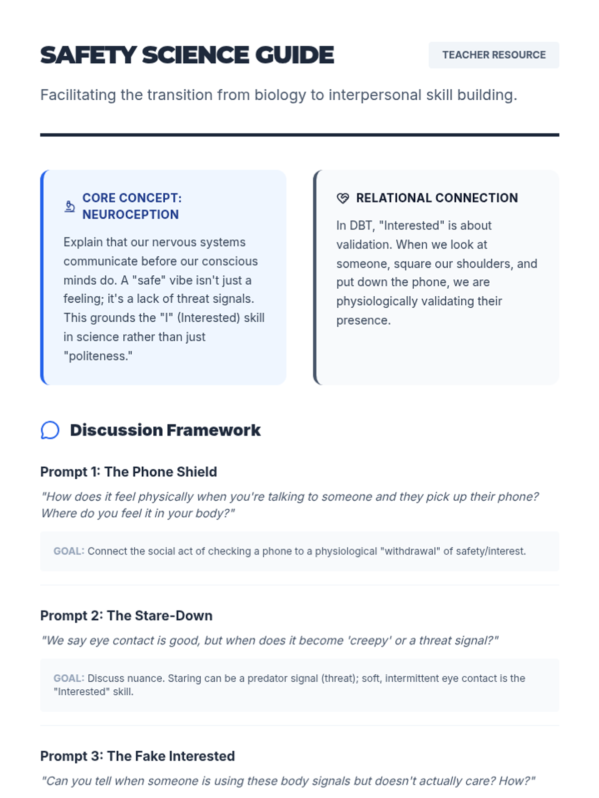 A project-based unit exploring the nonverbal elements of GIVE skills (Gentle, Interested, Validate, Easy manner), moving from biological theory and field observation to performance-based synthesis. Students analyze body language, tone, and micro-expressions to understand how their demeanor impacts social safety.