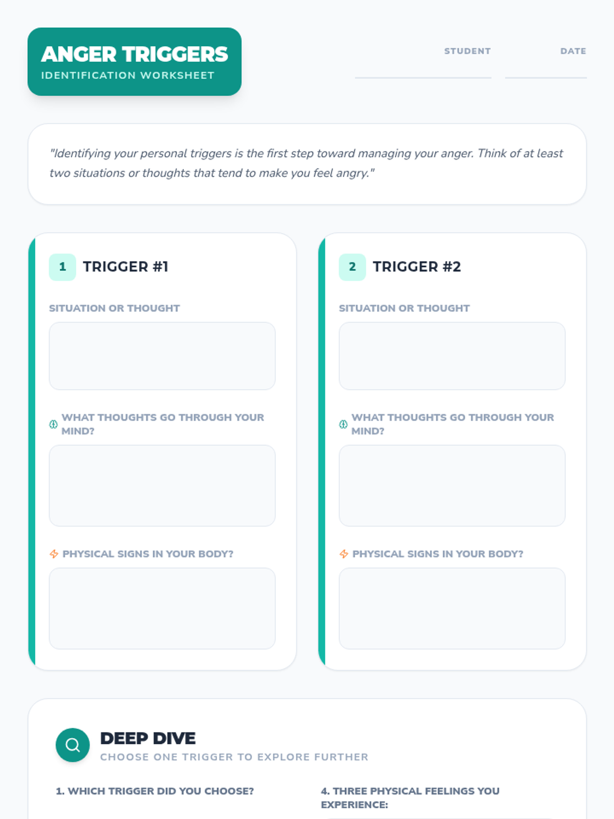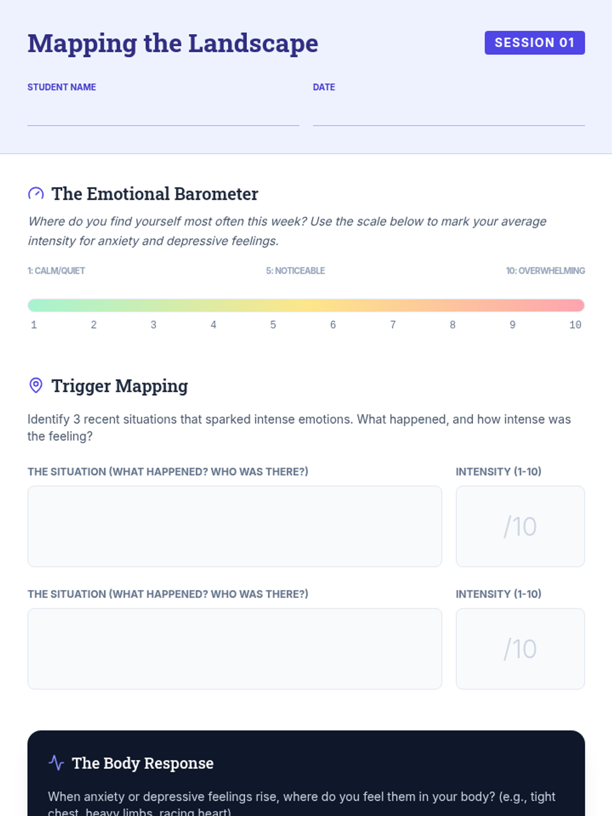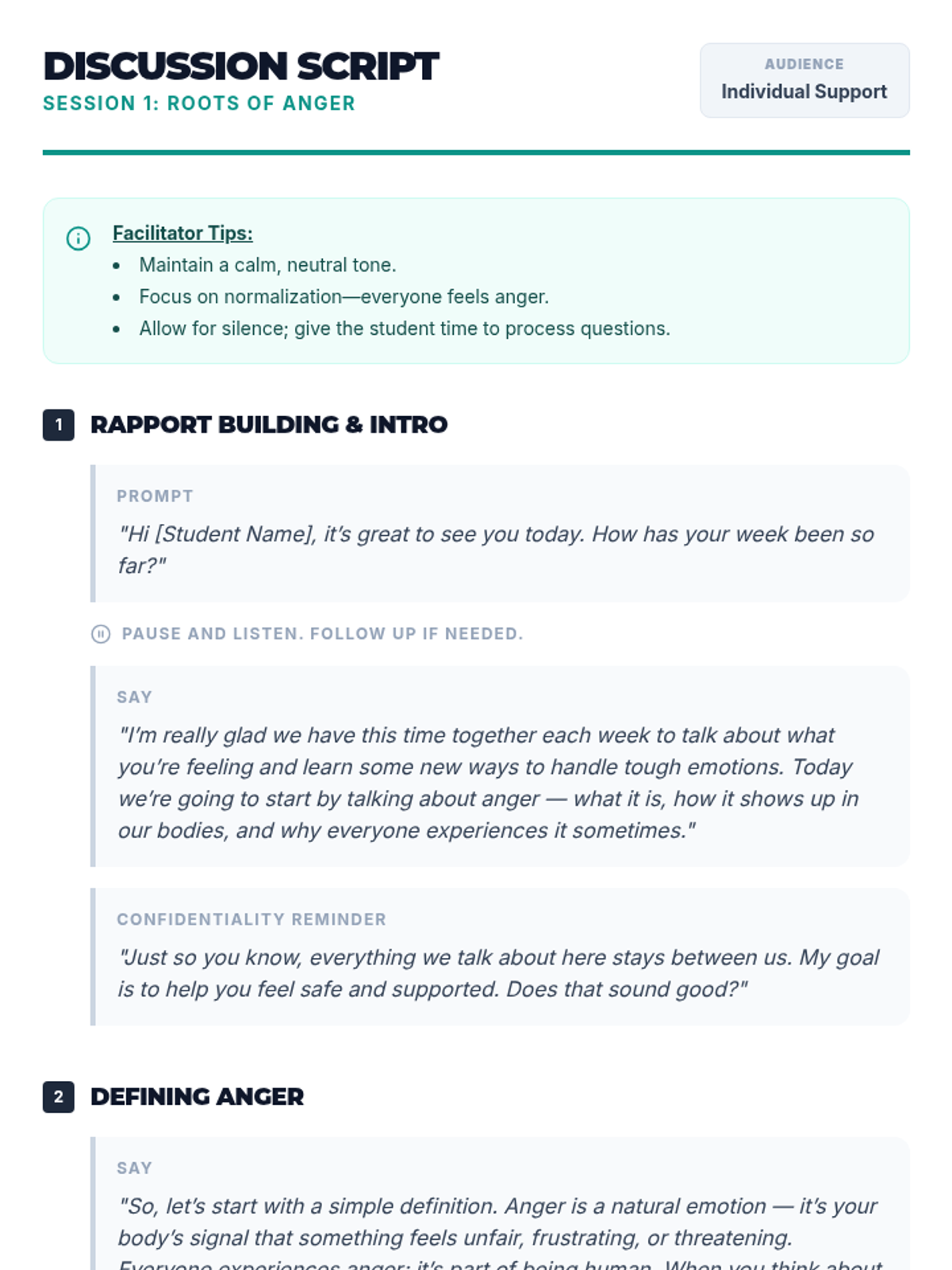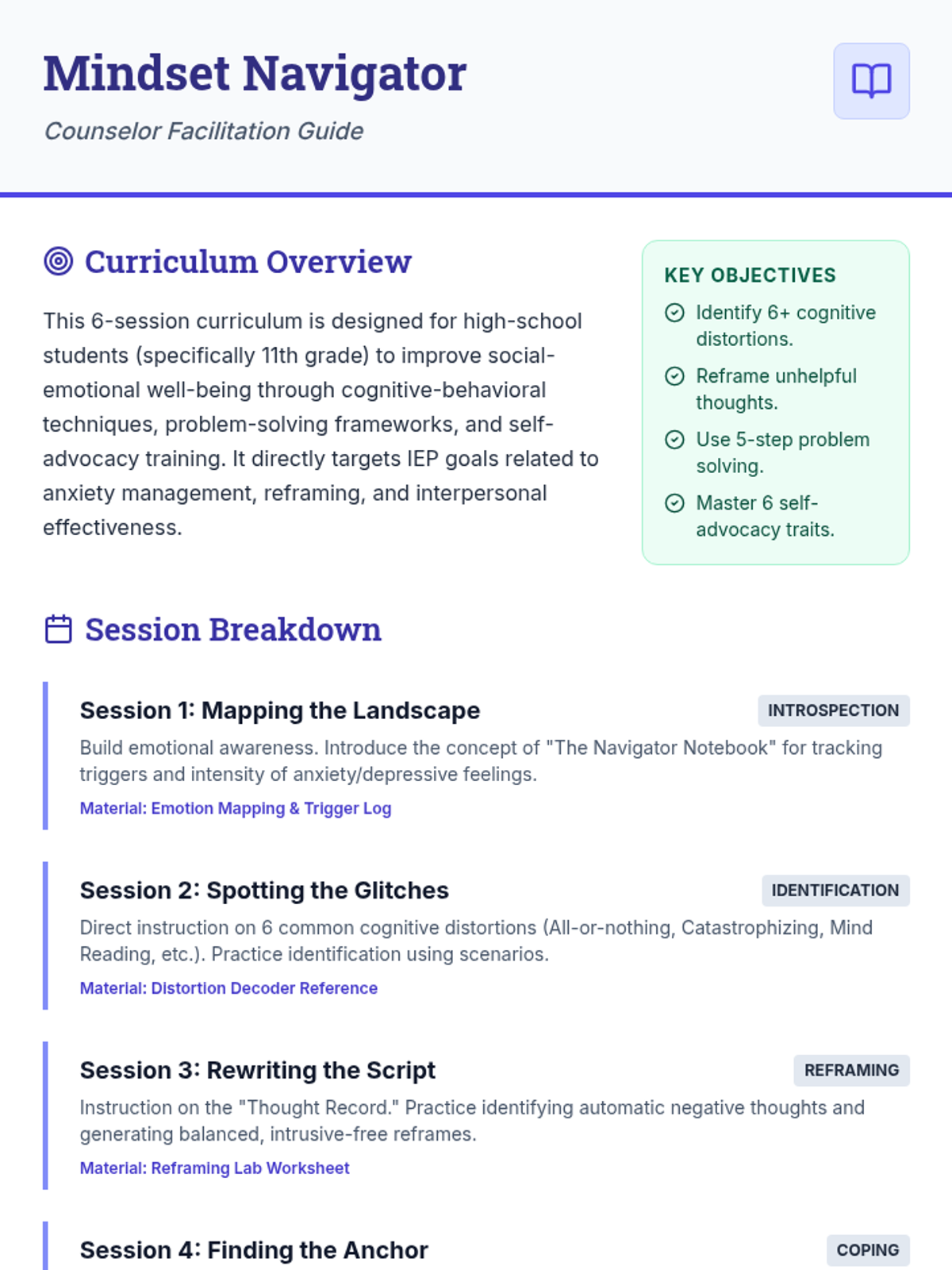 Counseling & Life SkillsSelf-AwarenessBasic Emotion RecognitionComplex Emotion IdentificationEmotional Nuance & Mixed FeelingsBuilding Positive Self-ImageRecognizing Strengths & Growth AreasAccurate Self-AssessmentPersonal Values IdentificationCultural & Individual Identity ExplorationValues-Based Decision MakingSelf-ManagementStop-and-Think StrategiesDelaying GratificationIndependent Impulse ManagementIdentifying Stress TriggersShort-Term Goal SettingSMART Goals DevelopmentGoal Monitoring & AdjustmentBuilding Perseverance & ResilienceInternal Motivation DevelopmentComprehensive Stress Reduction PlanningSocial AwarenessRecognizing Others' FeelingsDemonstrating EmpathyRespecting Individual DifferencesUnderstanding Cultural DiversityComplex Empathetic ResponsesMultiple Viewpoint ConsiderationMulti-Perspective AnalysisChallenging Stereotypes & BiasRelationship SkillsActive ListeningClear Verbal & Nonverbal CommunicationBuilding Positive FriendshipsWorking Cooperatively in GroupsCommunicating Personal BoundariesRespecting Others' BoundariesAssertive ExpressionPeaceful Problem-SolvingContributing to Team GoalsComplex Conflict NavigationMediation & NegotiationHealthy Romantic RelationshipsResponsible Decision-MakingDaily Problem IdentificationBrainstorming Multiple SolutionsEvaluating Pros & ConsRecognizing Risks & ConsequencesApplying Ethical FrameworksInformed Risk-Benefit DecisionsRoot Cause AnalysisMindfulnessMindful BreathingBody Scan MeditationDaily Mindfulness ApplicationDaily Self-Care RoutinesBalancing Life DemandsAdvocating for Wellness NeedsMental Health SupportUnderstanding Anxiety SymptomsWorry Management StrategiesProgressive Muscle RelaxationRecognizing Depression SignsBuilding Mood-Supporting RoutinesBehavioral Activation for MoodUnderstanding Grief StagesHealthy Grief CopingCreative Expression of LossBehavioral SupportDaily Check-In ProceduresDaily Goal Setting & ReviewRecognizing Escalation Warning SignsRequesting Breaks & SupportSelf-Calming During DistressUnderstanding Positive ReinforcementToken Economy ImplementationBehavior Chart TrackingAnalyzing Behavior PatternsIdentifying Antecedents & ConsequencesDetermining Behavior FunctionFunction-Based InterventionsIndividualized Behavior ContractsData-Driven Behavior AdjustmentTherapeutic ApproachesThoughts-Feelings-Behaviors ConnectionRecognizing Thinking PatternsChallenging Negative ThoughtsPositive Self-Talk PracticeThought Record TrackingAdvanced Cognitive RestructuringComprehensive CBT PlansBehavioral Activation TechniquesBuilding Positive ExperiencesExposure Hierarchies for AnxietyPresent-Moment AwarenessNon-Judgmental ObservationSelf-Soothing & DistractionComplex Emotion LabelingReducing Emotional Vulnerability (PLEASE)DEAR MAN CommunicationGIVE Skills for RelationshipsFAST Skills for Self-RespectRadical Acceptance PracticeCrisis Survival Skills (TIPP)Understanding Trauma EffectsTrauma Responses & TriggersIdentifying Trauma FeelingsGrounding TechniquesRegulation During Trauma DistressSafe Place VisualizationProcessing Through NarrativeDeveloping Trauma StoryPersonalized Safety PlanningGroup SupportTurn-Taking & SharingGroup Conversation SkillsSharing in Supportive EnvironmentLearning from Similar ChallengesBuilding Community & BelongingNavigating Peer RelationshipsGroup Skill PracticeGroup Mental Health EducationStress & Anxiety UnderstandingCrisis Support & SafetyKnowing When to Seek HelpIdentifying Mental Health CrisesGrounding During CrisisUsing Crisis HotlinesBuilding Support NetworksAccessing Mental Health ResourcesWarning Signs & Coping StrategiesDeveloping Personal Safety PlansUnderstanding Suicide Warning SignsGatekeeper Skills for PeersDigital LiteracySocial MediaTechnology BasicsProductivity ToolsInternet and Online ResearchWeb Design and PublishingDigital CitizenshipOnline Safety and PrivacyEmerging TechnologiesFinancial LiteracyMaking Financial DecisionsBanking and AccountsConsumer SkillsSaving and InvestingCredit and DebtEmployment and IncomeTaxesInsuranceMajor PurchasesEconomic ConceptsFinancial PlanningCollege & Post-Secondary PlanningCareer ExplorationUnderstanding Post-Secondary OptionsCollege Research & SelectionAdmission RequirementsCollege Application ProcessPersonal Statement WritingFAFSA CompletionScholarship Search & ApplicationsUnderstanding Student LoansContinuing Education PlanningInterview PreparationResearching EmployersCommon Interview QuestionsSTAR Method ResponsesProfessional Interview PresenceVirtual Interview SkillsInterview Follow-UpJob Search SkillsUnderstanding Job PostingsEffective Job Search StrategiesNetworking for OpportunitiesResume Writing BasicsAction Verbs & AchievementsTailoring Resumes to JobsCover Letter WritingProfessional ReferencesProfessional CommunicationBusiness Email EtiquettePhone & Voicemail ProfessionalismMeeting ParticipationPresentation SkillsProfessional Work EthicTime Management & ProductivityTeamwork & CollaborationAdaptability & FlexibilityProblem-Solving at WorkConstructive FeedbackWorkplace RightsUnderstanding Employment LawsPay & Benefits UnderstandingWorkplace SafetyAnti-Discrimination & Harassment