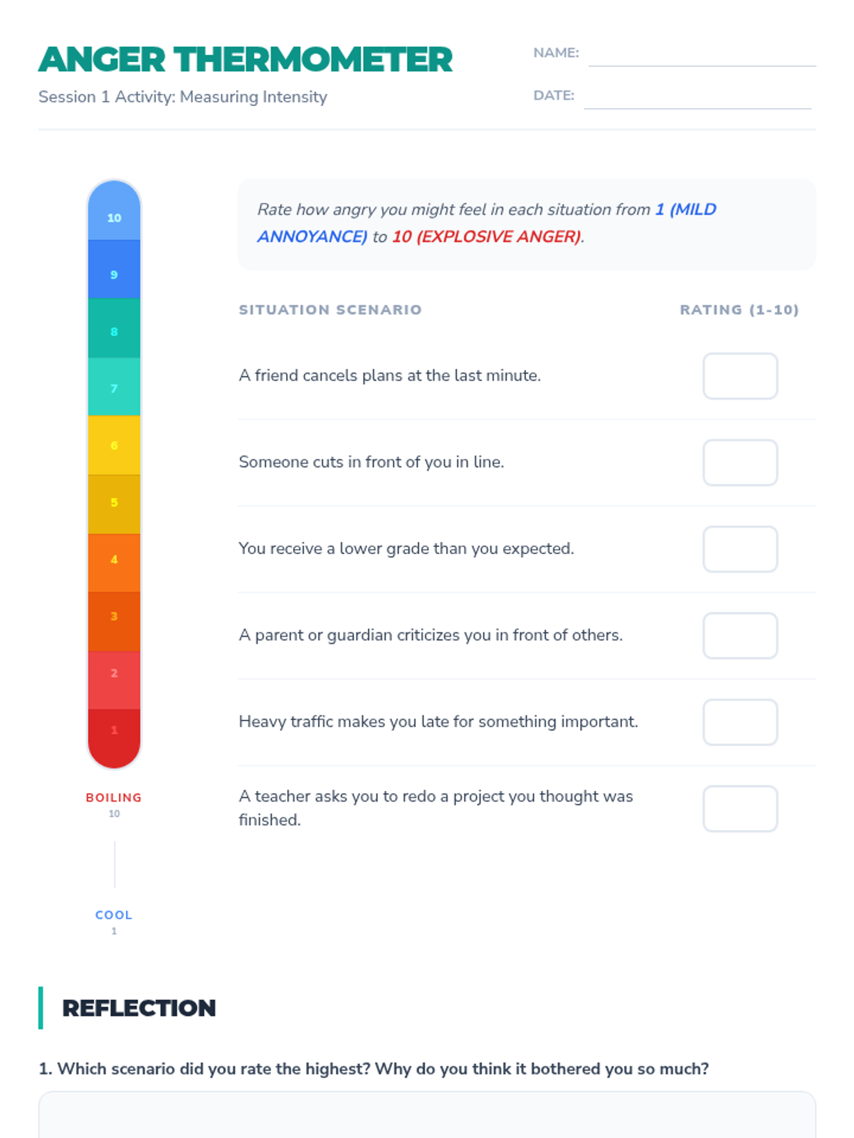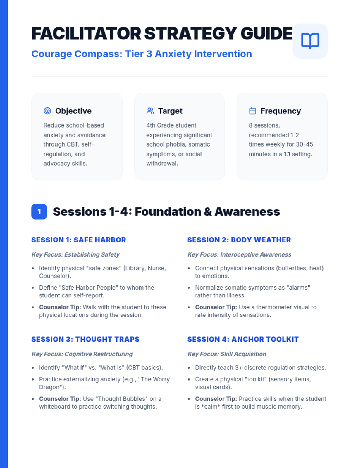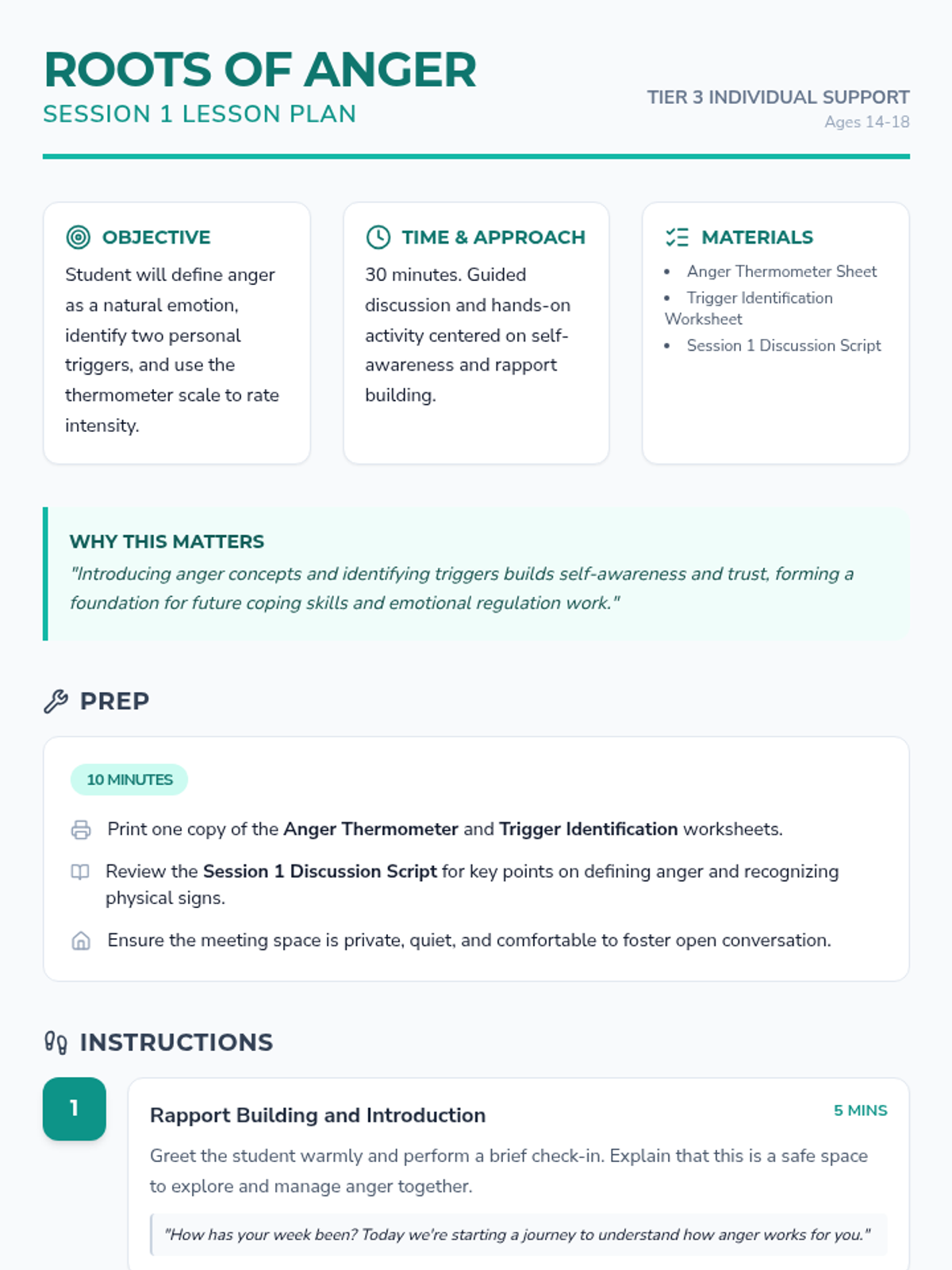 Counseling & Life SkillsSelf-AwarenessBasic Emotion RecognitionComplex Emotion IdentificationEmotional Nuance & Mixed FeelingsBuilding Positive Self-ImageRecognizing Strengths & Growth AreasAccurate Self-AssessmentPersonal Values IdentificationCultural & Individual Identity ExplorationValues-Based Decision MakingSelf-ManagementStop-and-Think StrategiesDelaying GratificationIndependent Impulse ManagementIdentifying Stress TriggersShort-Term Goal SettingSMART Goals DevelopmentGoal Monitoring & AdjustmentBuilding Perseverance & ResilienceInternal Motivation DevelopmentComprehensive Stress Reduction PlanningSocial AwarenessRecognizing Others' FeelingsDemonstrating EmpathyRespecting Individual DifferencesUnderstanding Cultural DiversityComplex Empathetic ResponsesMultiple Viewpoint ConsiderationMulti-Perspective AnalysisChallenging Stereotypes & BiasRelationship SkillsActive ListeningClear Verbal & Nonverbal CommunicationBuilding Positive FriendshipsWorking Cooperatively in GroupsCommunicating Personal BoundariesRespecting Others' BoundariesAssertive ExpressionPeaceful Problem-SolvingContributing to Team GoalsComplex Conflict NavigationMediation & NegotiationHealthy Romantic RelationshipsResponsible Decision-MakingDaily Problem IdentificationBrainstorming Multiple SolutionsEvaluating Pros & ConsRecognizing Risks & ConsequencesApplying Ethical FrameworksInformed Risk-Benefit DecisionsRoot Cause AnalysisMindfulnessMindful BreathingBody Scan MeditationDaily Mindfulness ApplicationDaily Self-Care RoutinesBalancing Life DemandsAdvocating for Wellness NeedsMental Health SupportUnderstanding Anxiety SymptomsWorry Management StrategiesProgressive Muscle RelaxationRecognizing Depression SignsBuilding Mood-Supporting RoutinesBehavioral Activation for MoodUnderstanding Grief StagesHealthy Grief CopingCreative Expression of LossBehavioral SupportDaily Check-In ProceduresDaily Goal Setting & ReviewRecognizing Escalation Warning SignsRequesting Breaks & SupportSelf-Calming During DistressUnderstanding Positive ReinforcementToken Economy ImplementationBehavior Chart TrackingAnalyzing Behavior PatternsIdentifying Antecedents & ConsequencesDetermining Behavior FunctionFunction-Based InterventionsIndividualized Behavior ContractsData-Driven Behavior AdjustmentTherapeutic ApproachesThoughts-Feelings-Behaviors ConnectionRecognizing Thinking PatternsChallenging Negative ThoughtsPositive Self-Talk PracticeThought Record TrackingAdvanced Cognitive RestructuringComprehensive CBT PlansBehavioral Activation TechniquesBuilding Positive ExperiencesExposure Hierarchies for AnxietyPresent-Moment AwarenessNon-Judgmental ObservationSelf-Soothing & DistractionComplex Emotion LabelingReducing Emotional Vulnerability (PLEASE)DEAR MAN CommunicationGIVE Skills for RelationshipsFAST Skills for Self-RespectRadical Acceptance PracticeCrisis Survival Skills (TIPP)Understanding Trauma EffectsTrauma Responses & TriggersIdentifying Trauma FeelingsGrounding TechniquesRegulation During Trauma DistressSafe Place VisualizationProcessing Through NarrativeDeveloping Trauma StoryPersonalized Safety PlanningGroup SupportTurn-Taking & SharingGroup Conversation SkillsSharing in Supportive EnvironmentLearning from Similar ChallengesBuilding Community & BelongingNavigating Peer RelationshipsGroup Skill PracticeGroup Mental Health EducationStress & Anxiety UnderstandingCrisis Support & SafetyKnowing When to Seek HelpIdentifying Mental Health CrisesGrounding During CrisisUsing Crisis HotlinesBuilding Support NetworksAccessing Mental Health ResourcesWarning Signs & Coping StrategiesDeveloping Personal Safety PlansUnderstanding Suicide Warning SignsGatekeeper Skills for PeersDigital LiteracySocial MediaTechnology BasicsProductivity ToolsInternet and Online ResearchWeb Design and PublishingDigital CitizenshipOnline Safety and PrivacyEmerging TechnologiesFinancial LiteracyMaking Financial DecisionsBanking and AccountsConsumer SkillsSaving and InvestingCredit and DebtEmployment and IncomeTaxesInsuranceMajor PurchasesEconomic ConceptsFinancial PlanningCollege & Post-Secondary PlanningCareer ExplorationUnderstanding Post-Secondary OptionsCollege Research & SelectionAdmission RequirementsCollege Application ProcessPersonal Statement WritingFAFSA CompletionScholarship Search & ApplicationsUnderstanding Student LoansContinuing Education PlanningInterview PreparationResearching EmployersCommon Interview QuestionsSTAR Method ResponsesProfessional Interview PresenceVirtual Interview SkillsInterview Follow-UpJob Search SkillsUnderstanding Job PostingsEffective Job Search StrategiesNetworking for OpportunitiesResume Writing BasicsAction Verbs & AchievementsTailoring Resumes to JobsCover Letter WritingProfessional ReferencesProfessional CommunicationBusiness Email EtiquettePhone & Voicemail ProfessionalismMeeting ParticipationPresentation SkillsProfessional Work EthicTime Management & ProductivityTeamwork & CollaborationAdaptability & FlexibilityProblem-Solving at WorkConstructive FeedbackWorkplace RightsUnderstanding Employment LawsPay & Benefits UnderstandingWorkplace SafetyAnti-Discrimination & Harassment