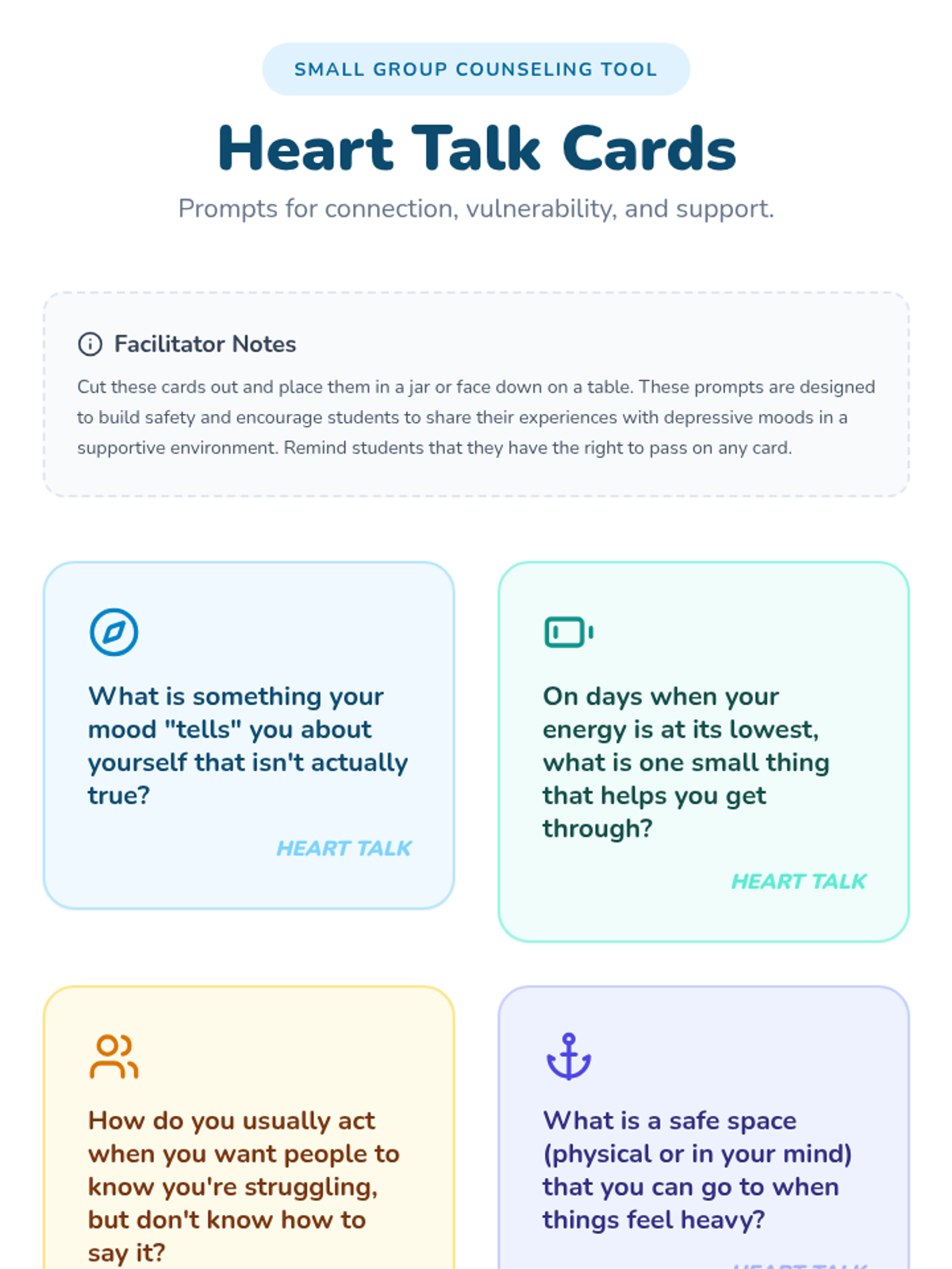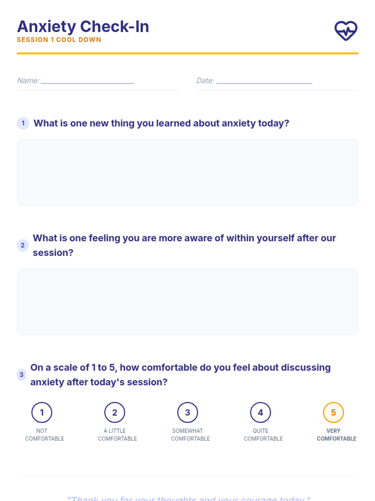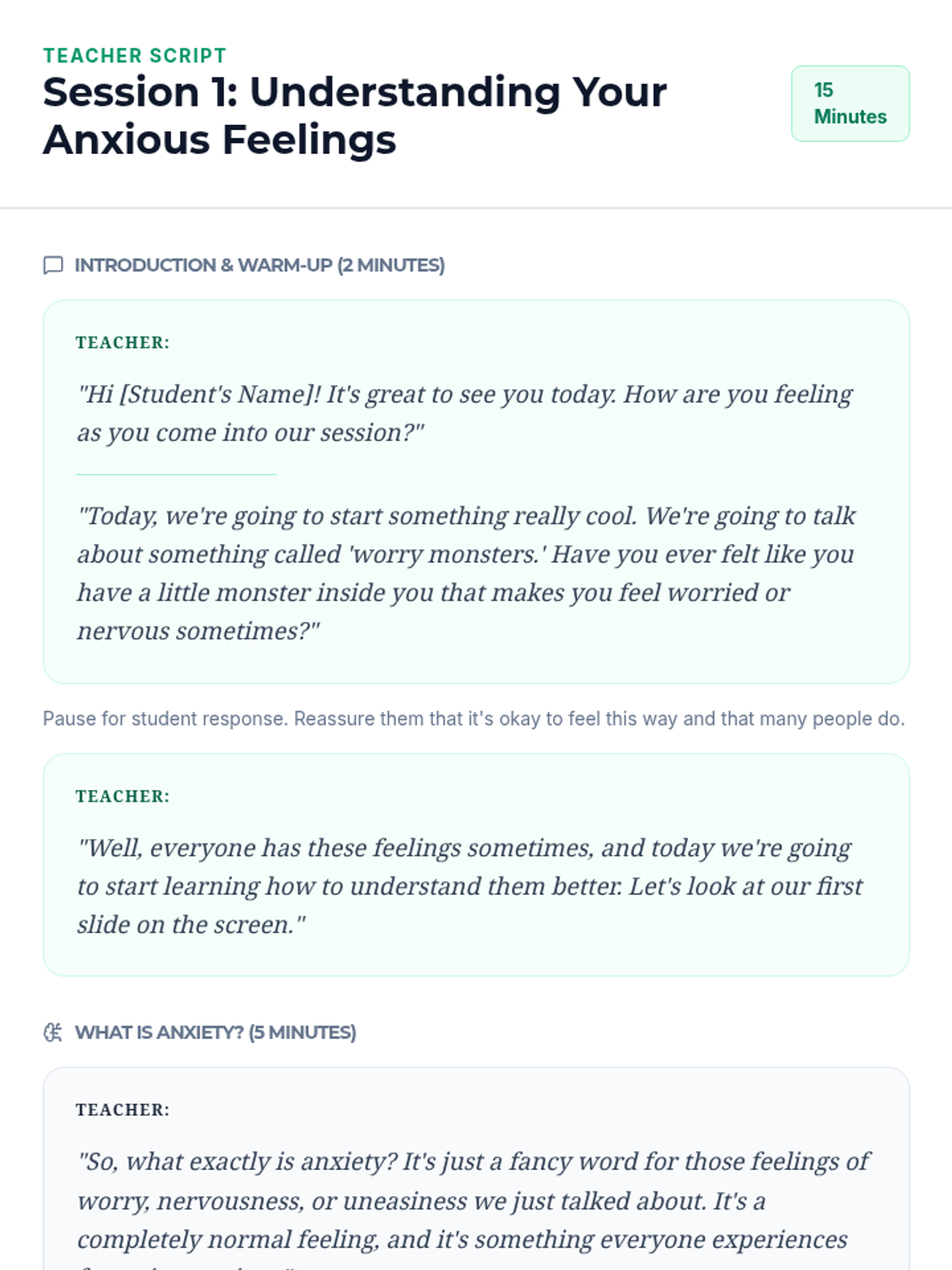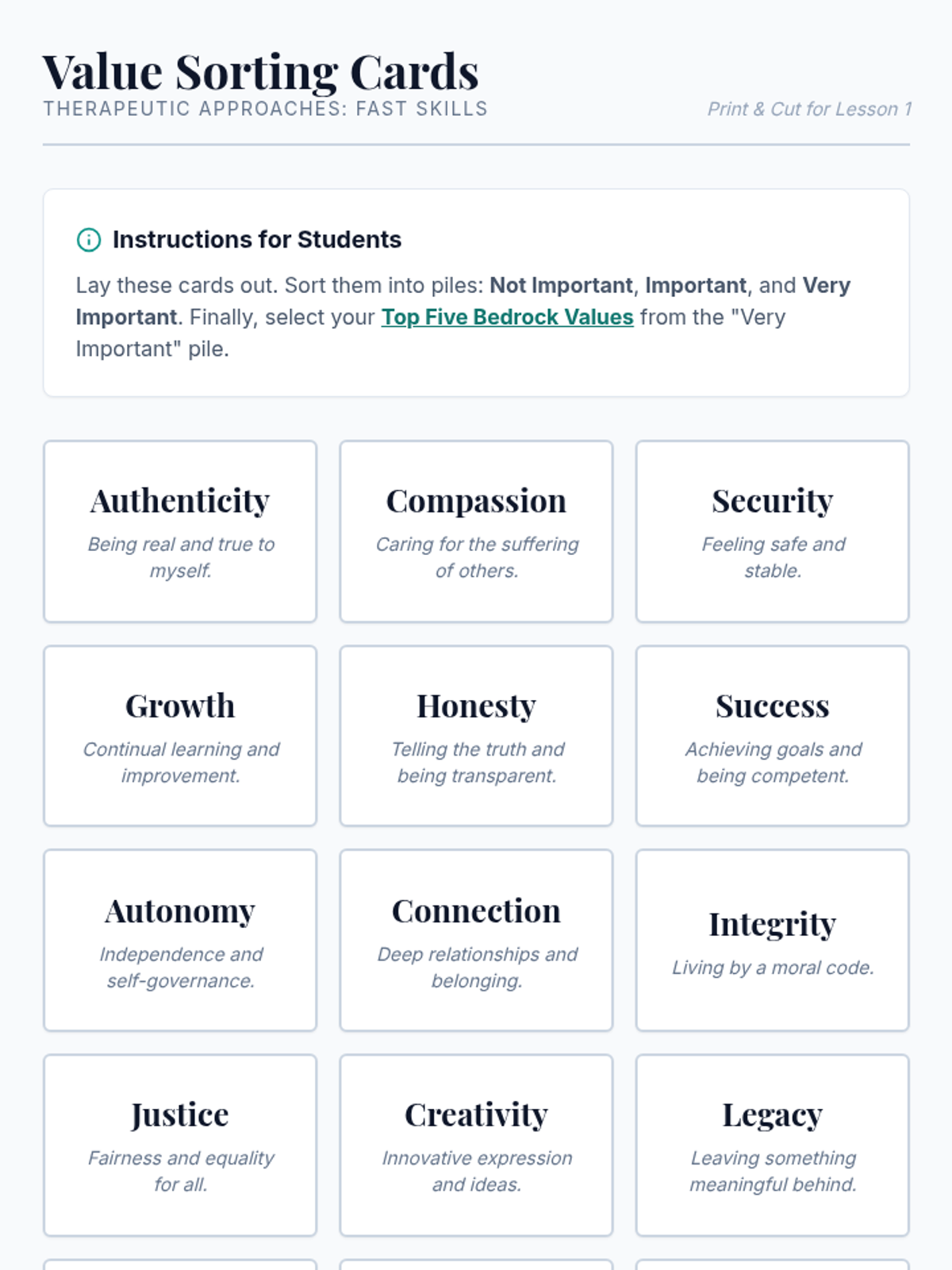 Counseling & Life SkillsSelf-AwarenessBasic Emotion RecognitionComplex Emotion IdentificationEmotional Nuance & Mixed FeelingsBuilding Positive Self-ImageRecognizing Strengths & Growth AreasAccurate Self-AssessmentPersonal Values IdentificationCultural & Individual Identity ExplorationValues-Based Decision MakingSelf-ManagementStop-and-Think StrategiesDelaying GratificationIndependent Impulse ManagementIdentifying Stress TriggersShort-Term Goal SettingSMART Goals DevelopmentGoal Monitoring & AdjustmentBuilding Perseverance & ResilienceInternal Motivation DevelopmentComprehensive Stress Reduction PlanningSocial AwarenessRecognizing Others' FeelingsDemonstrating EmpathyRespecting Individual DifferencesUnderstanding Cultural DiversityComplex Empathetic ResponsesMultiple Viewpoint ConsiderationMulti-Perspective AnalysisChallenging Stereotypes & BiasRelationship SkillsActive ListeningClear Verbal & Nonverbal CommunicationBuilding Positive FriendshipsWorking Cooperatively in GroupsCommunicating Personal BoundariesRespecting Others' BoundariesAssertive ExpressionPeaceful Problem-SolvingContributing to Team GoalsComplex Conflict NavigationMediation & NegotiationHealthy Romantic RelationshipsResponsible Decision-MakingDaily Problem IdentificationBrainstorming Multiple SolutionsEvaluating Pros & ConsRecognizing Risks & ConsequencesApplying Ethical FrameworksInformed Risk-Benefit DecisionsRoot Cause AnalysisMindfulnessMindful BreathingBody Scan MeditationDaily Mindfulness ApplicationDaily Self-Care RoutinesBalancing Life DemandsAdvocating for Wellness NeedsMental Health SupportUnderstanding Anxiety SymptomsWorry Management StrategiesProgressive Muscle RelaxationRecognizing Depression SignsBuilding Mood-Supporting RoutinesBehavioral Activation for MoodUnderstanding Grief StagesHealthy Grief CopingCreative Expression of LossBehavioral SupportDaily Check-In ProceduresDaily Goal Setting & ReviewRecognizing Escalation Warning SignsRequesting Breaks & SupportSelf-Calming During DistressUnderstanding Positive ReinforcementToken Economy ImplementationBehavior Chart TrackingAnalyzing Behavior PatternsIdentifying Antecedents & ConsequencesDetermining Behavior FunctionFunction-Based InterventionsIndividualized Behavior ContractsData-Driven Behavior AdjustmentTherapeutic ApproachesThoughts-Feelings-Behaviors ConnectionRecognizing Thinking PatternsChallenging Negative ThoughtsPositive Self-Talk PracticeThought Record TrackingAdvanced Cognitive RestructuringComprehensive CBT PlansBehavioral Activation TechniquesBuilding Positive ExperiencesExposure Hierarchies for AnxietyPresent-Moment AwarenessNon-Judgmental ObservationSelf-Soothing & DistractionComplex Emotion LabelingReducing Emotional Vulnerability (PLEASE)DEAR MAN CommunicationGIVE Skills for RelationshipsFAST Skills for Self-RespectRadical Acceptance PracticeCrisis Survival Skills (TIPP)Understanding Trauma EffectsTrauma Responses & TriggersIdentifying Trauma FeelingsGrounding TechniquesRegulation During Trauma DistressSafe Place VisualizationProcessing Through NarrativeDeveloping Trauma StoryPersonalized Safety PlanningGroup SupportTurn-Taking & SharingGroup Conversation SkillsSharing in Supportive EnvironmentLearning from Similar ChallengesBuilding Community & BelongingNavigating Peer RelationshipsGroup Skill PracticeGroup Mental Health EducationStress & Anxiety UnderstandingCrisis Support & SafetyKnowing When to Seek HelpIdentifying Mental Health CrisesGrounding During CrisisUsing Crisis HotlinesBuilding Support NetworksAccessing Mental Health ResourcesWarning Signs & Coping StrategiesDeveloping Personal Safety PlansUnderstanding Suicide Warning SignsGatekeeper Skills for PeersDigital LiteracySocial MediaTechnology BasicsProductivity ToolsInternet and Online ResearchWeb Design and PublishingDigital CitizenshipOnline Safety and PrivacyEmerging TechnologiesFinancial LiteracyMaking Financial DecisionsBanking and AccountsConsumer SkillsSaving and InvestingCredit and DebtEmployment and IncomeTaxesInsuranceMajor PurchasesEconomic ConceptsFinancial PlanningCollege & Post-Secondary PlanningCareer ExplorationUnderstanding Post-Secondary OptionsCollege Research & SelectionAdmission RequirementsCollege Application ProcessPersonal Statement WritingFAFSA CompletionScholarship Search & ApplicationsUnderstanding Student LoansContinuing Education PlanningInterview PreparationResearching EmployersCommon Interview QuestionsSTAR Method ResponsesProfessional Interview PresenceVirtual Interview SkillsInterview Follow-UpJob Search SkillsUnderstanding Job PostingsEffective Job Search StrategiesNetworking for OpportunitiesResume Writing BasicsAction Verbs & AchievementsTailoring Resumes to JobsCover Letter WritingProfessional ReferencesProfessional CommunicationBusiness Email EtiquettePhone & Voicemail ProfessionalismMeeting ParticipationPresentation SkillsProfessional Work EthicTime Management & ProductivityTeamwork & CollaborationAdaptability & FlexibilityProblem-Solving at WorkConstructive FeedbackWorkplace RightsUnderstanding Employment LawsPay & Benefits UnderstandingWorkplace SafetyAnti-Discrimination & Harassment