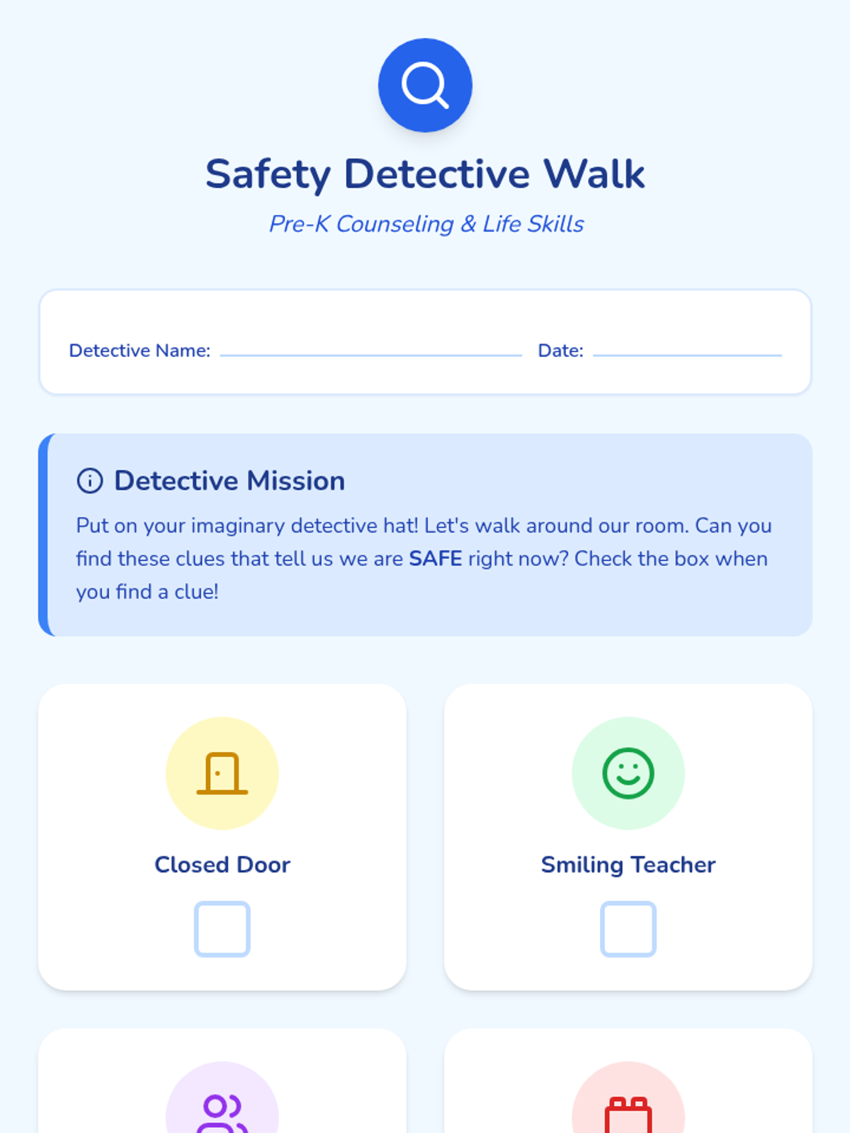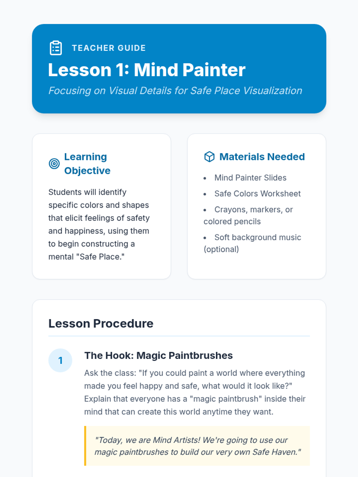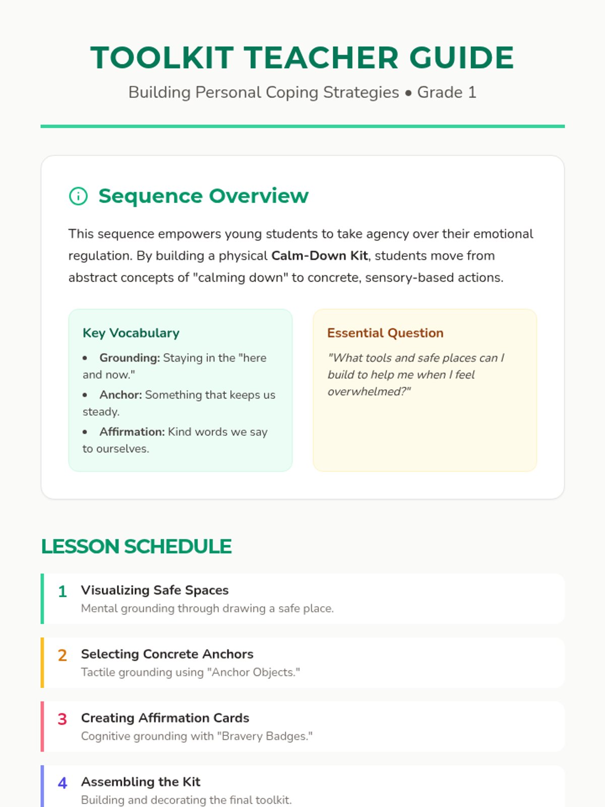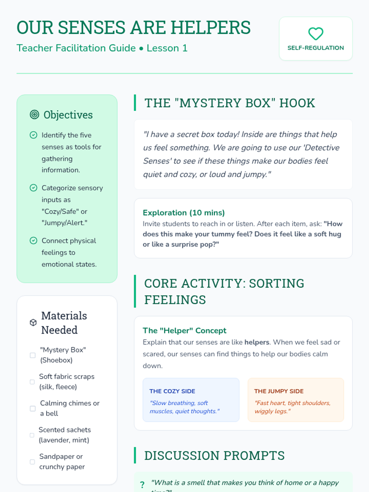 This sequence teaches Pre-K students how to build a mental safe place using their five senses. By focusing on sight, sound, touch, and smell, children create a vivid grounding tool for emotional regulation and self-soothing.