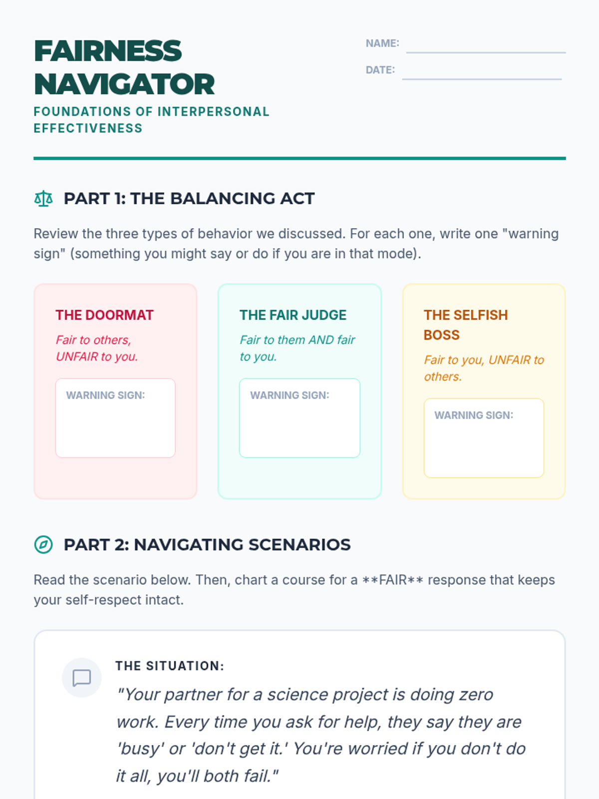 A 5-lesson unit for undergraduates on navigating interpersonal conflict, setting boundaries, and developing communication skills for shared living and working environments. Students explore their own conflict styles, engage in simulations, and practice assertive communication and de-escalation techniques.