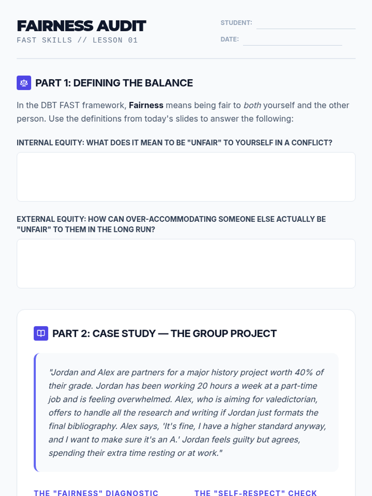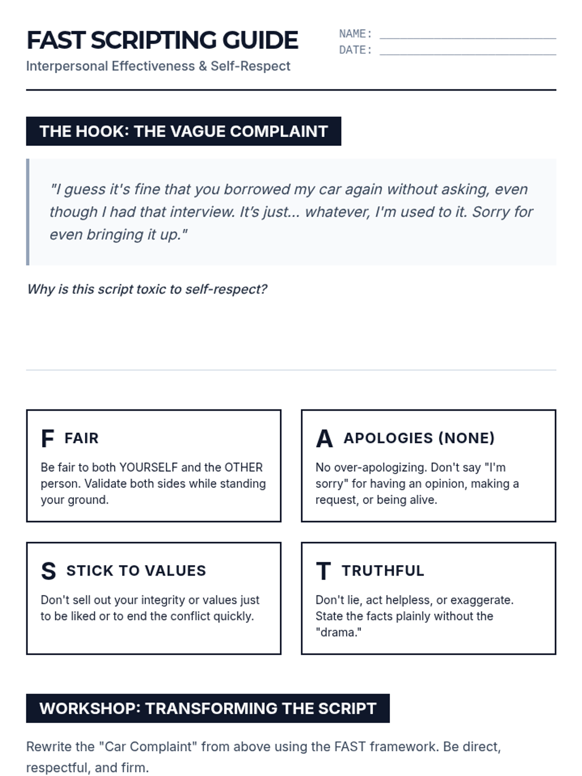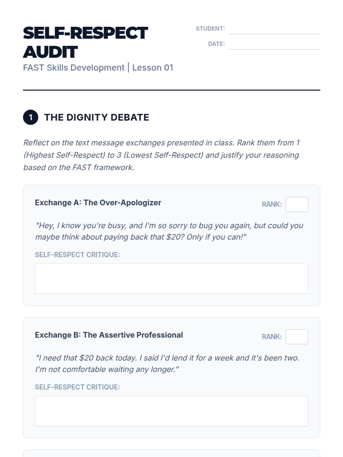 FAST Skills for Self-RespectInterpersonal effectiveness techniques for maintaining self-respect using the DBT framework of being Fair, avoiding over-Apologizing, Sticking to values, and being Truthful. Equips learners to preserve personal integrity during social interactions and conflict resolution.