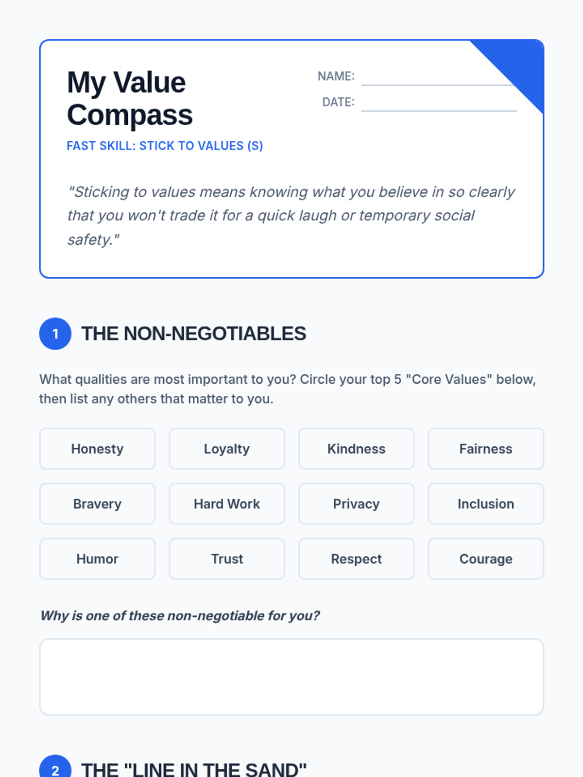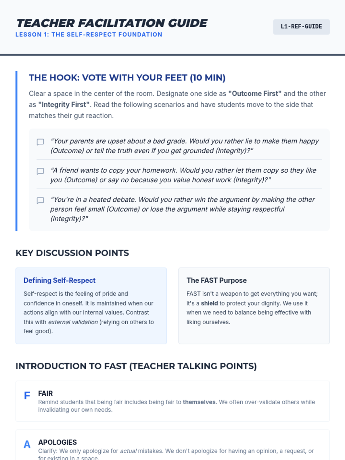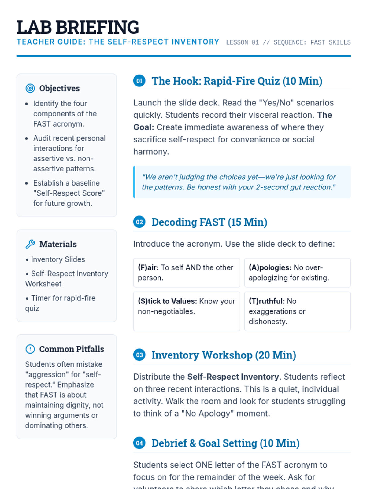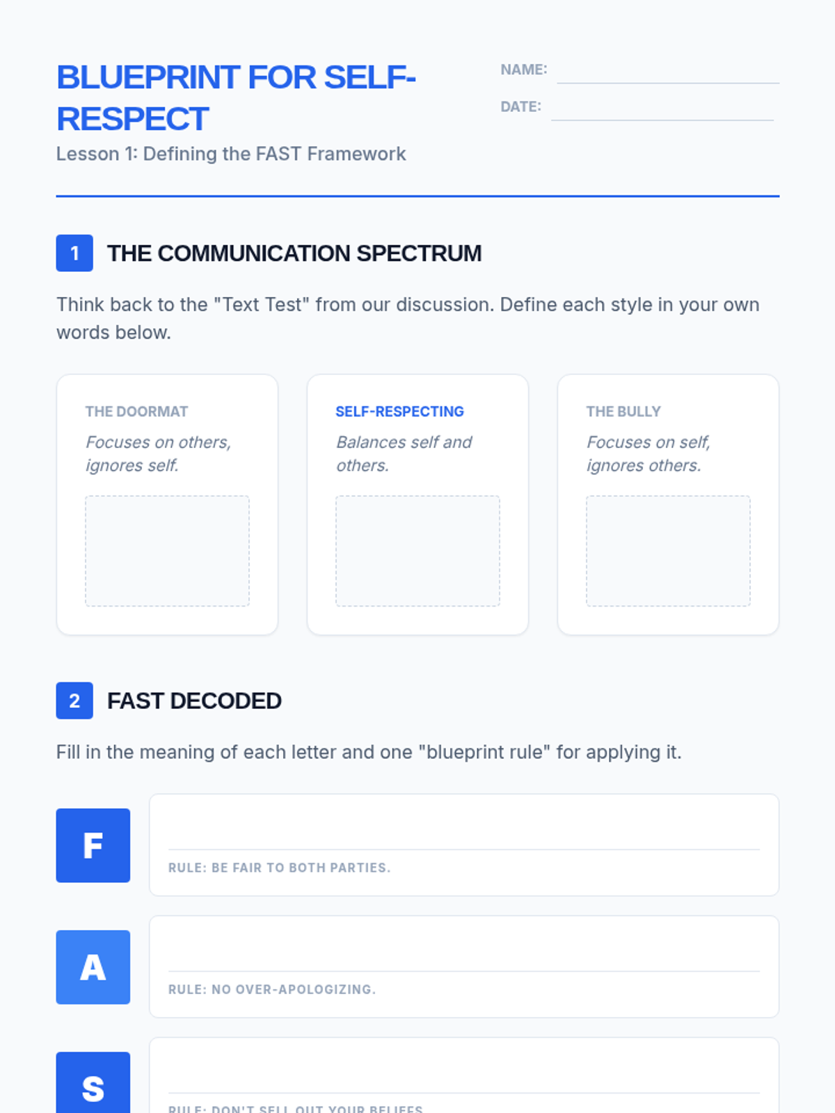 FAST Skills for Self-RespectInterpersonal effectiveness techniques for maintaining self-respect using the DBT framework of being Fair, avoiding over-Apologizing, Sticking to values, and being Truthful. Equips learners to preserve personal integrity during social interactions and conflict resolution.