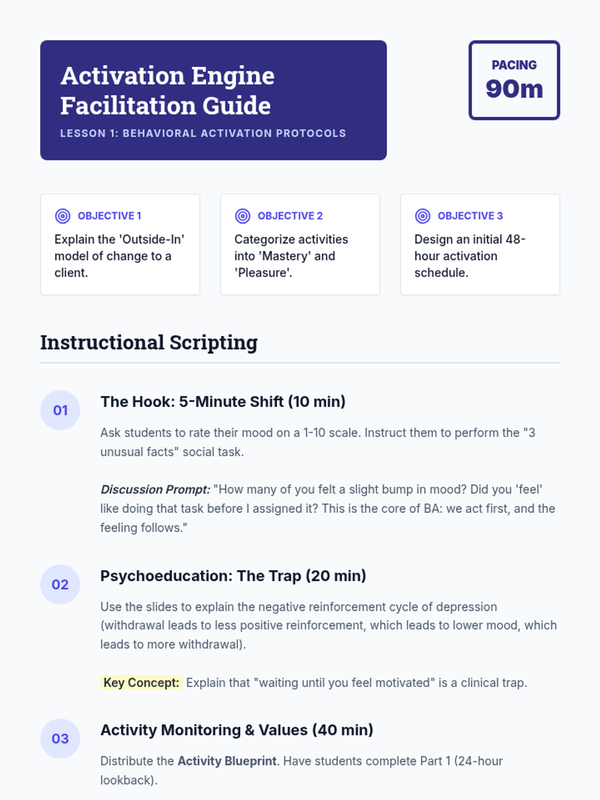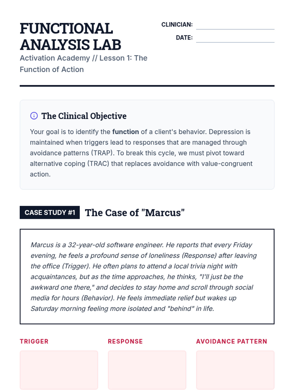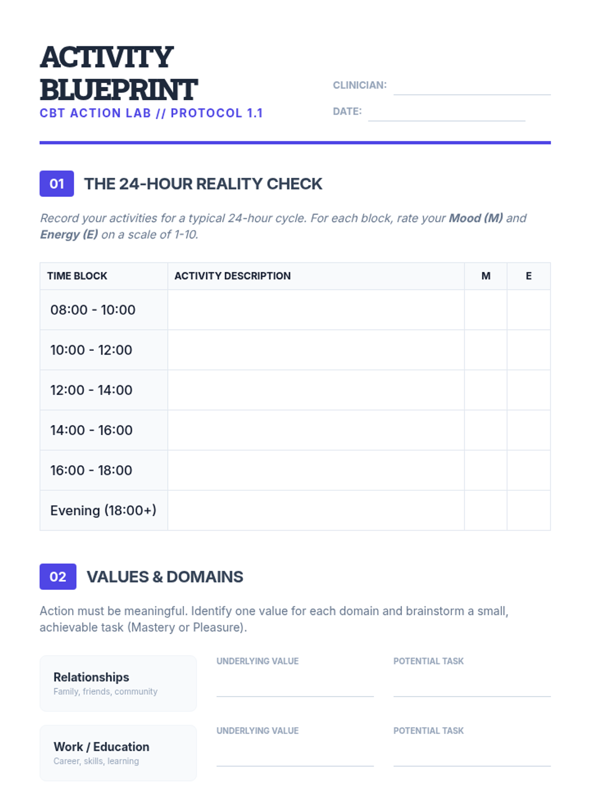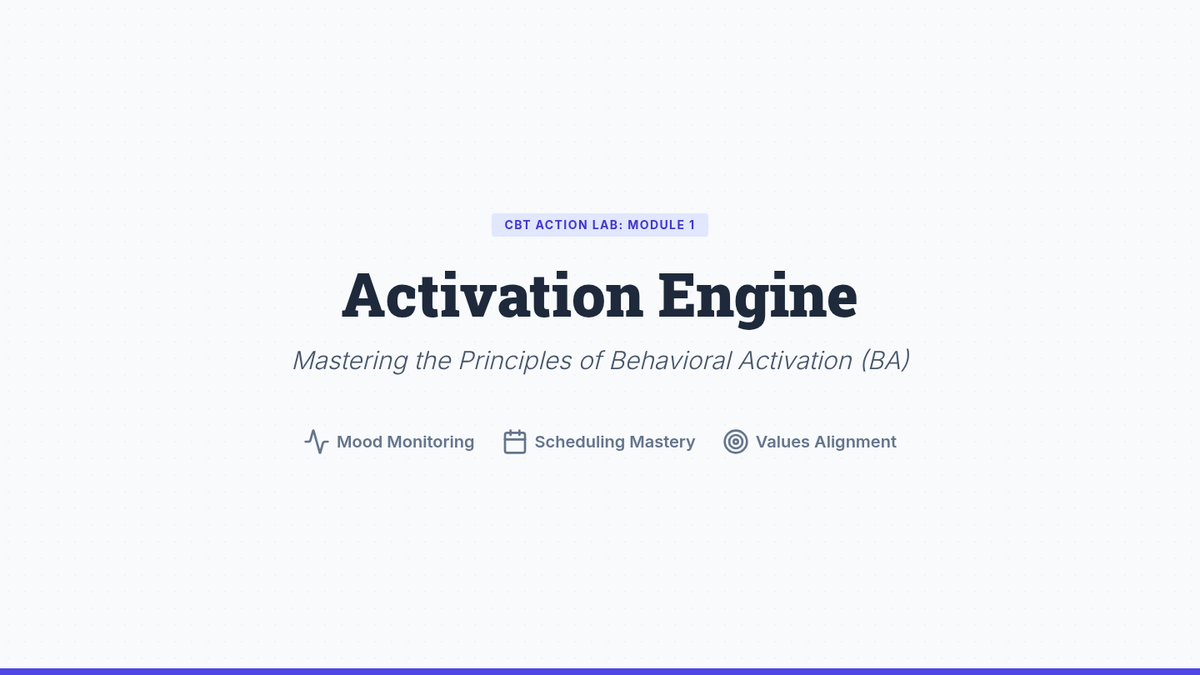 Behavioral Activation TechniquesStructured activity scheduling and mood tracking to reinforce positive behaviors and combat withdrawal. Equips practitioners with tools to help clients reconnect with meaningful, value-based experiences.
