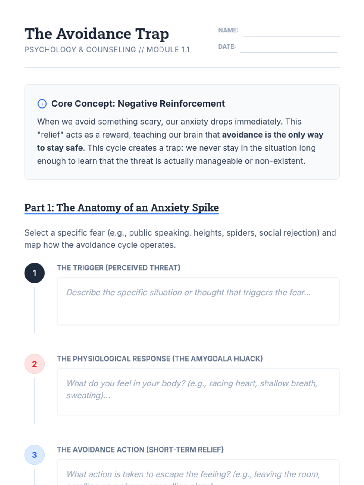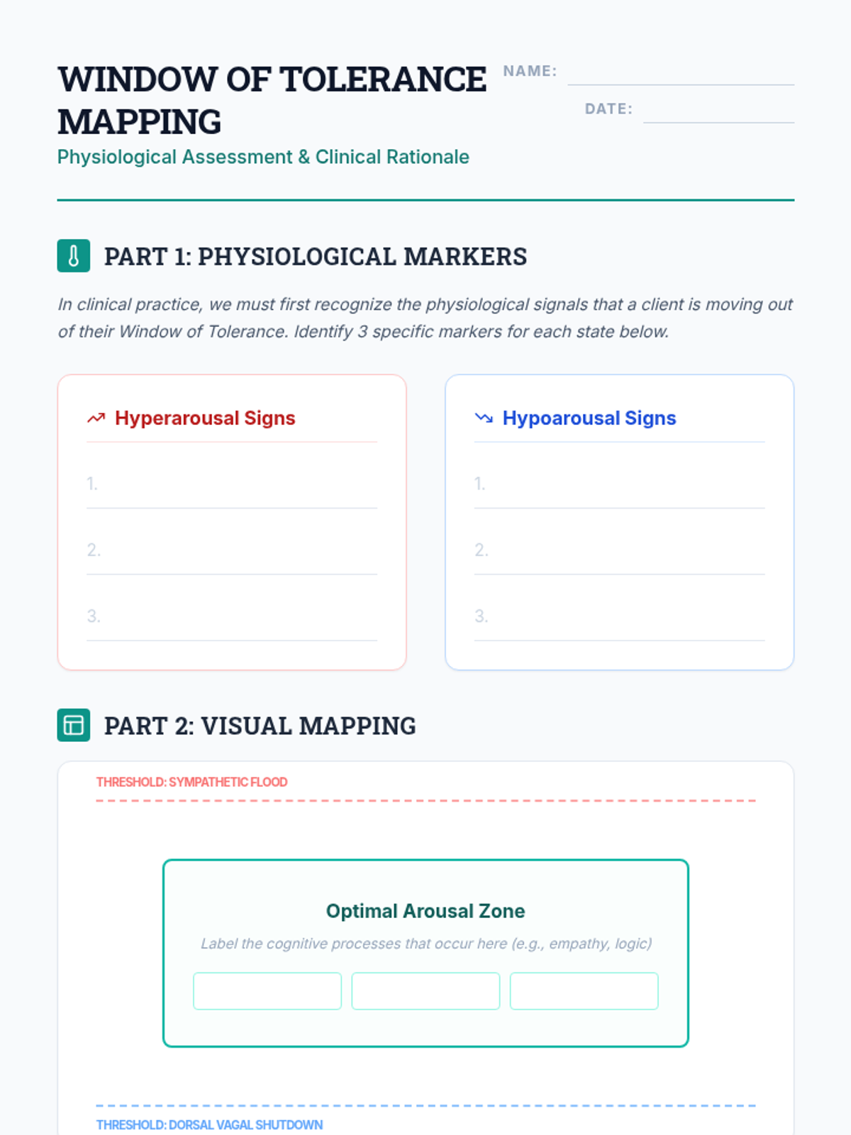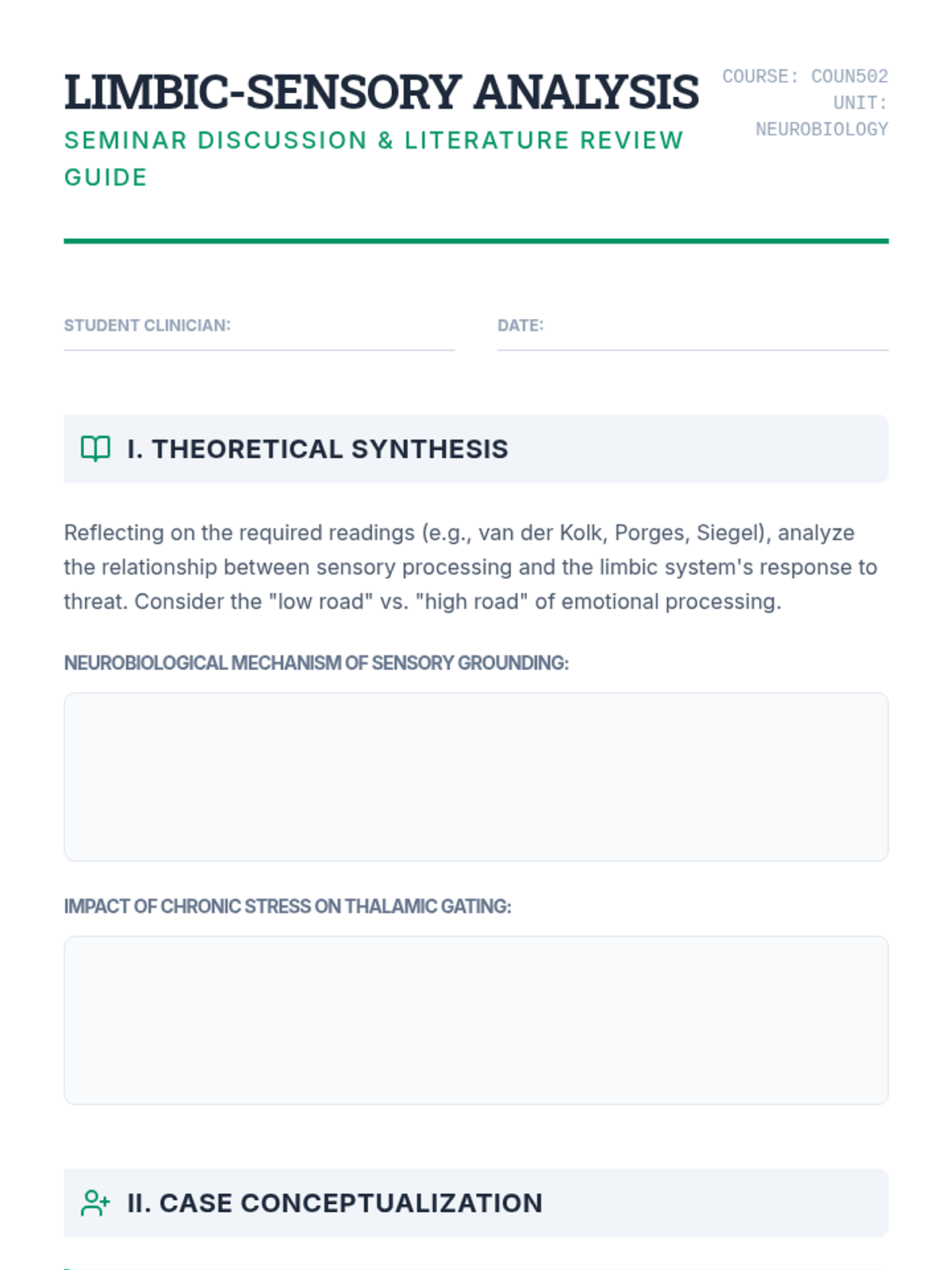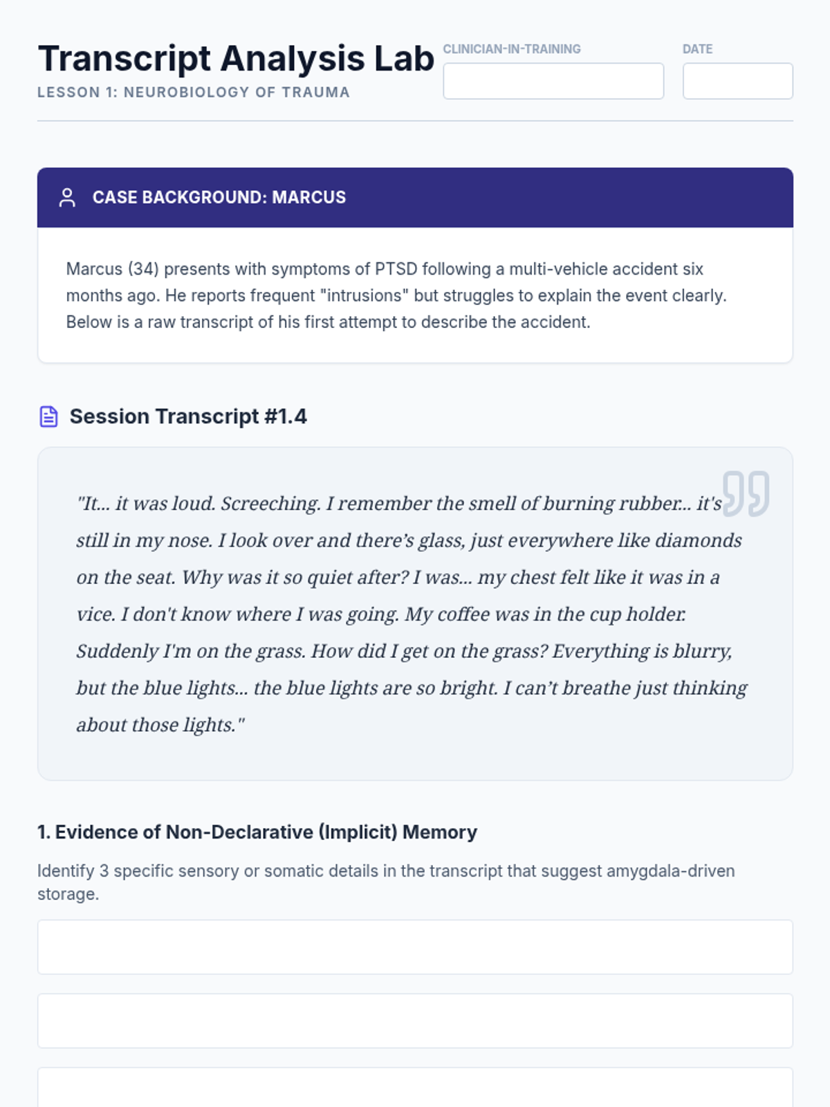 Trauma Responses & TriggersExamines neurobiological mechanisms of fight-flight-freeze responses and identifies environmental or emotional triggers. Develops clinical strategies for stabilization, emotional regulation, and trauma-informed intervention.