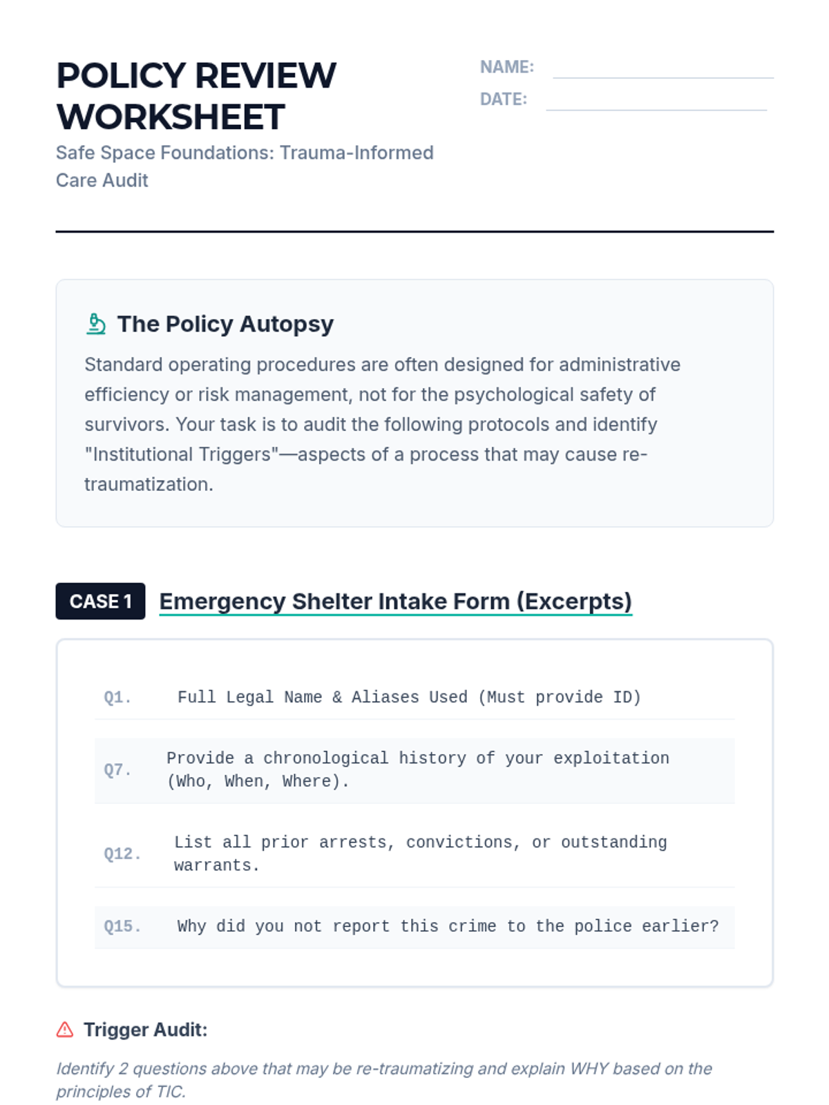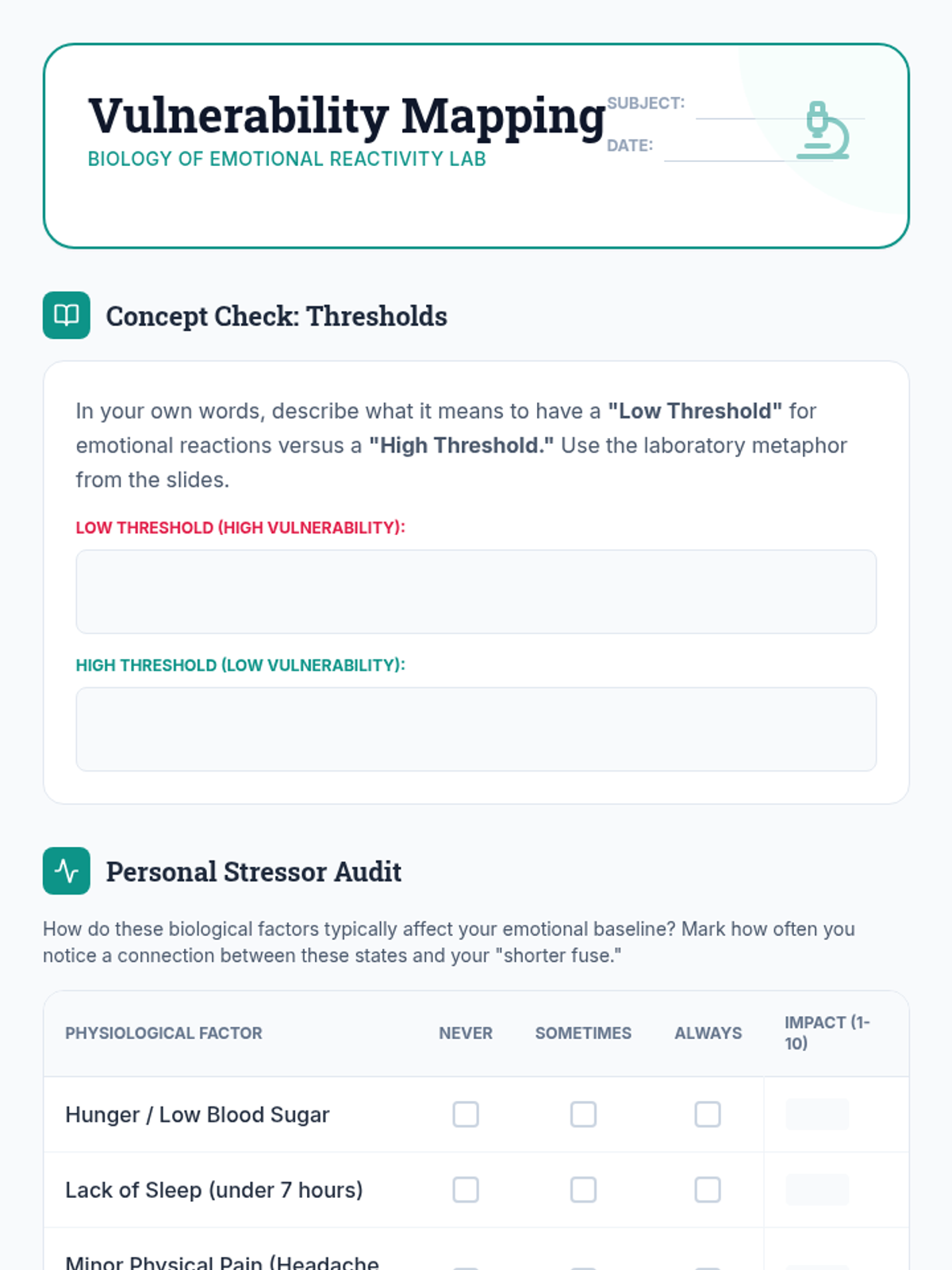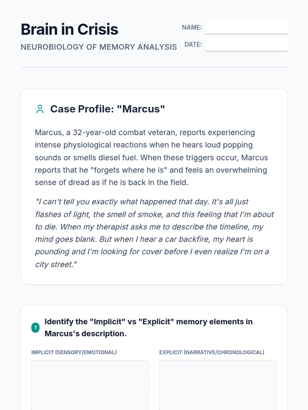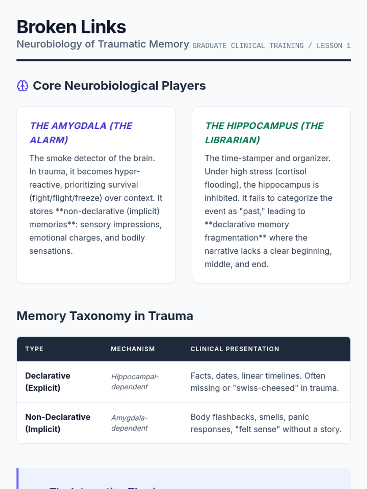 Trauma Responses & TriggersExamines neurobiological mechanisms of fight-flight-freeze responses and identifies environmental or emotional triggers. Develops clinical strategies for stabilization, emotional regulation, and trauma-informed intervention.