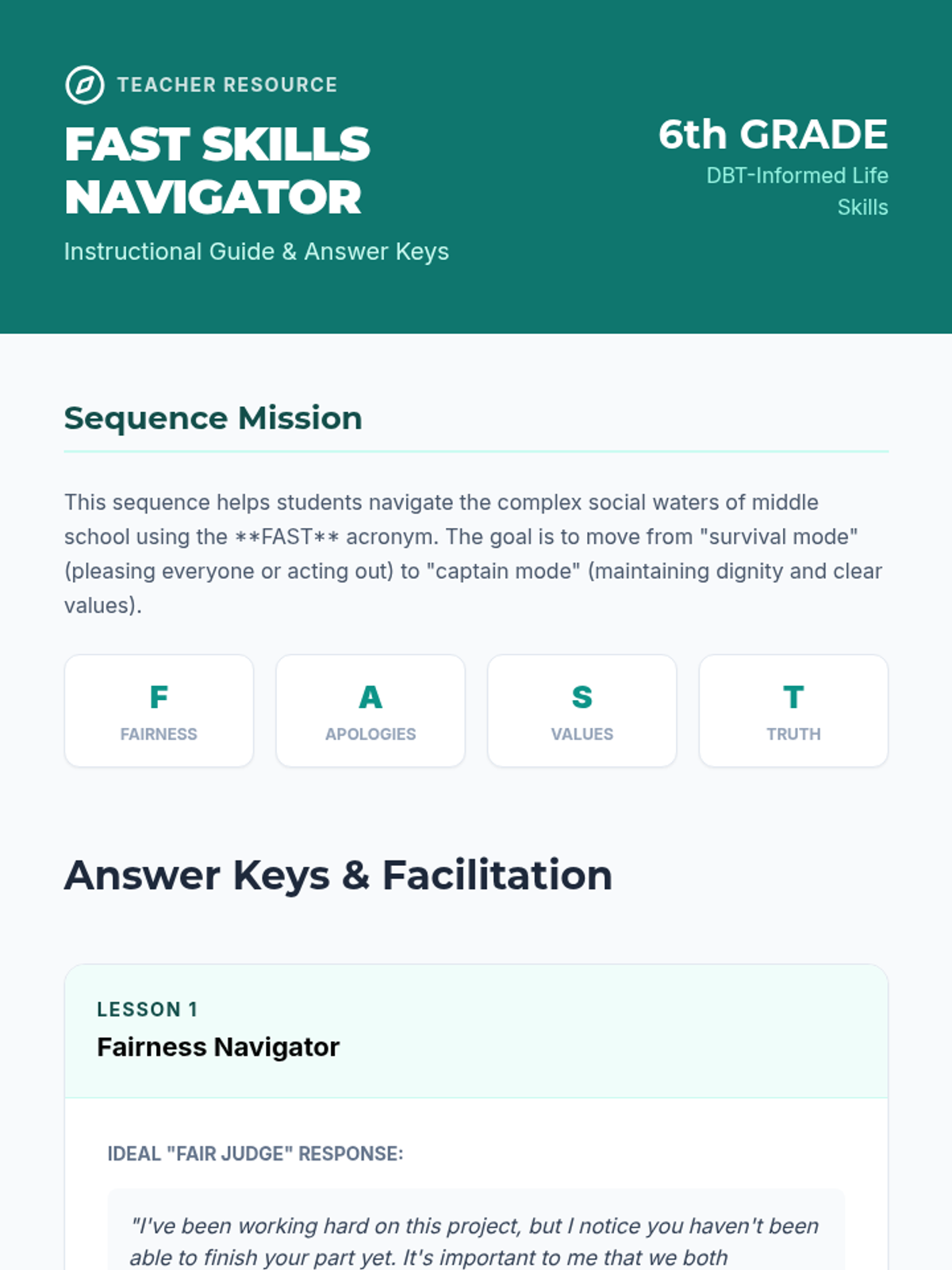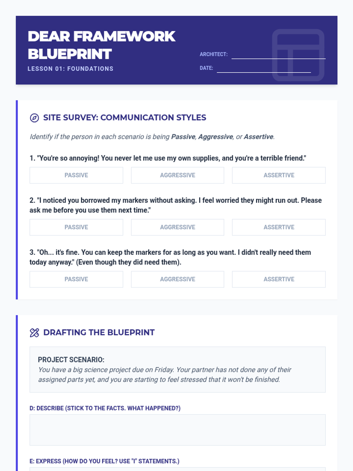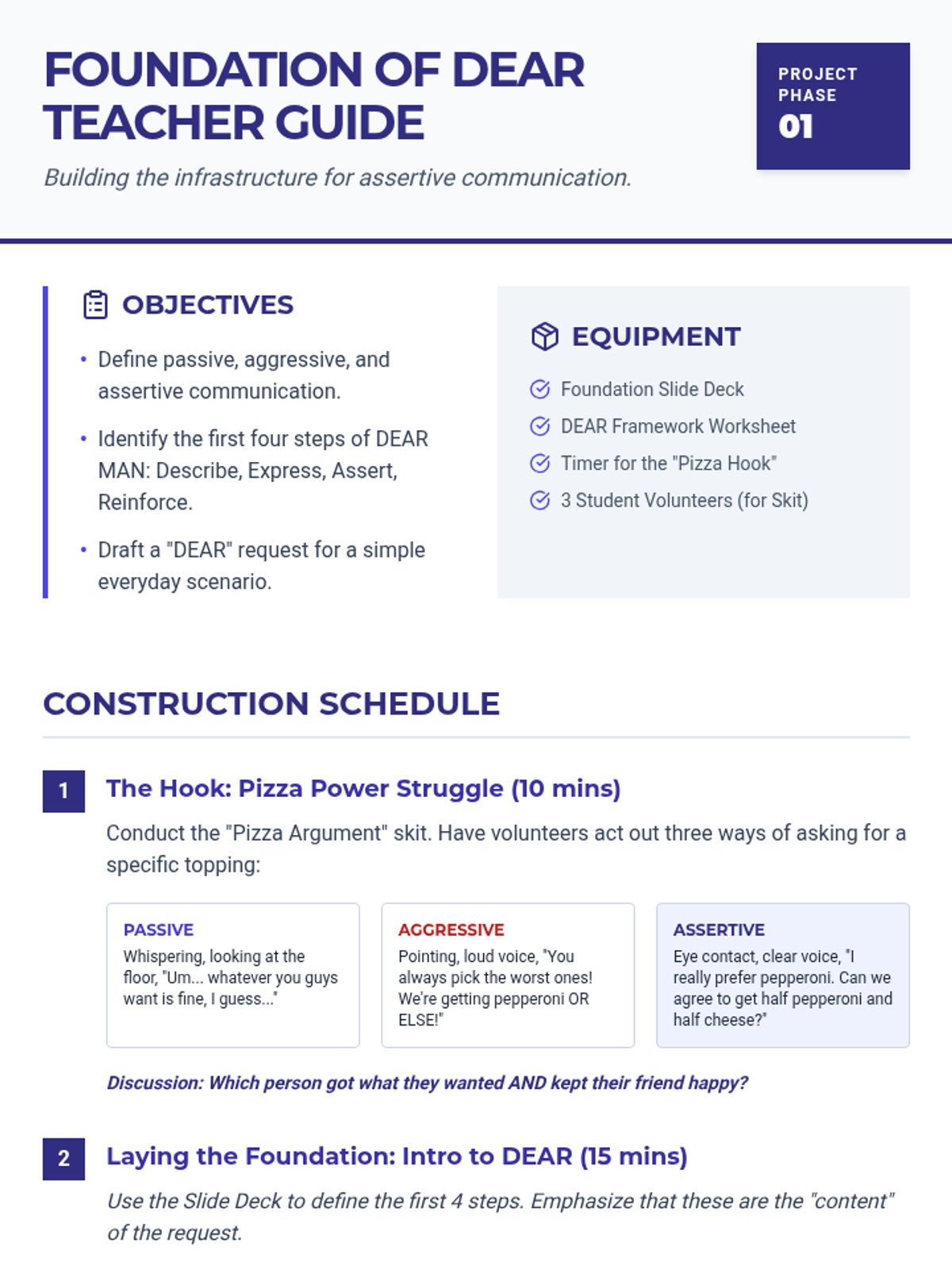 A comprehensive 5-lesson unit for 6th graders on the DBT DEAR MAN framework, teaching assertive communication, boundary setting, and negotiation skills through architectural-themed 'blueprints' for social success.