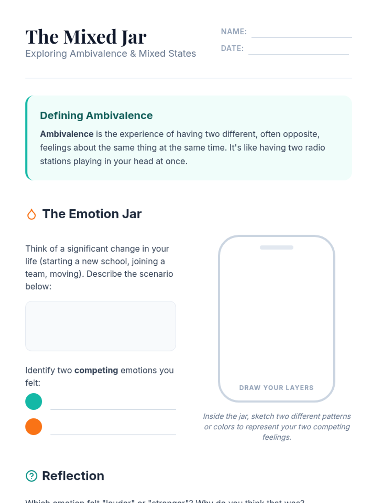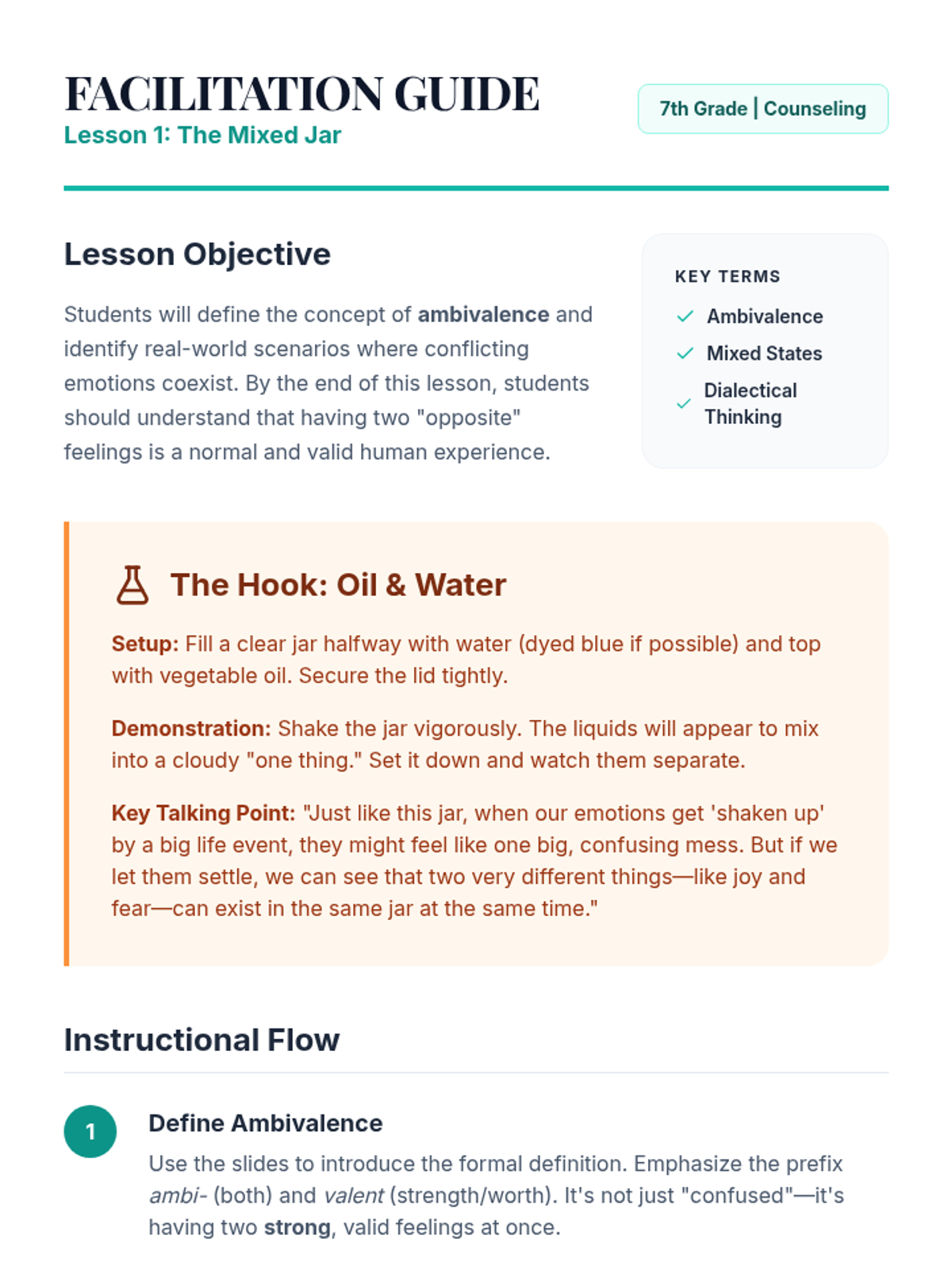 A sequence for middle schoolers to explore the complexity of mixed emotions, focusing on the concept of ambivalence and the linguistic shift from 'but' to 'and' to validate conflicting feelings.