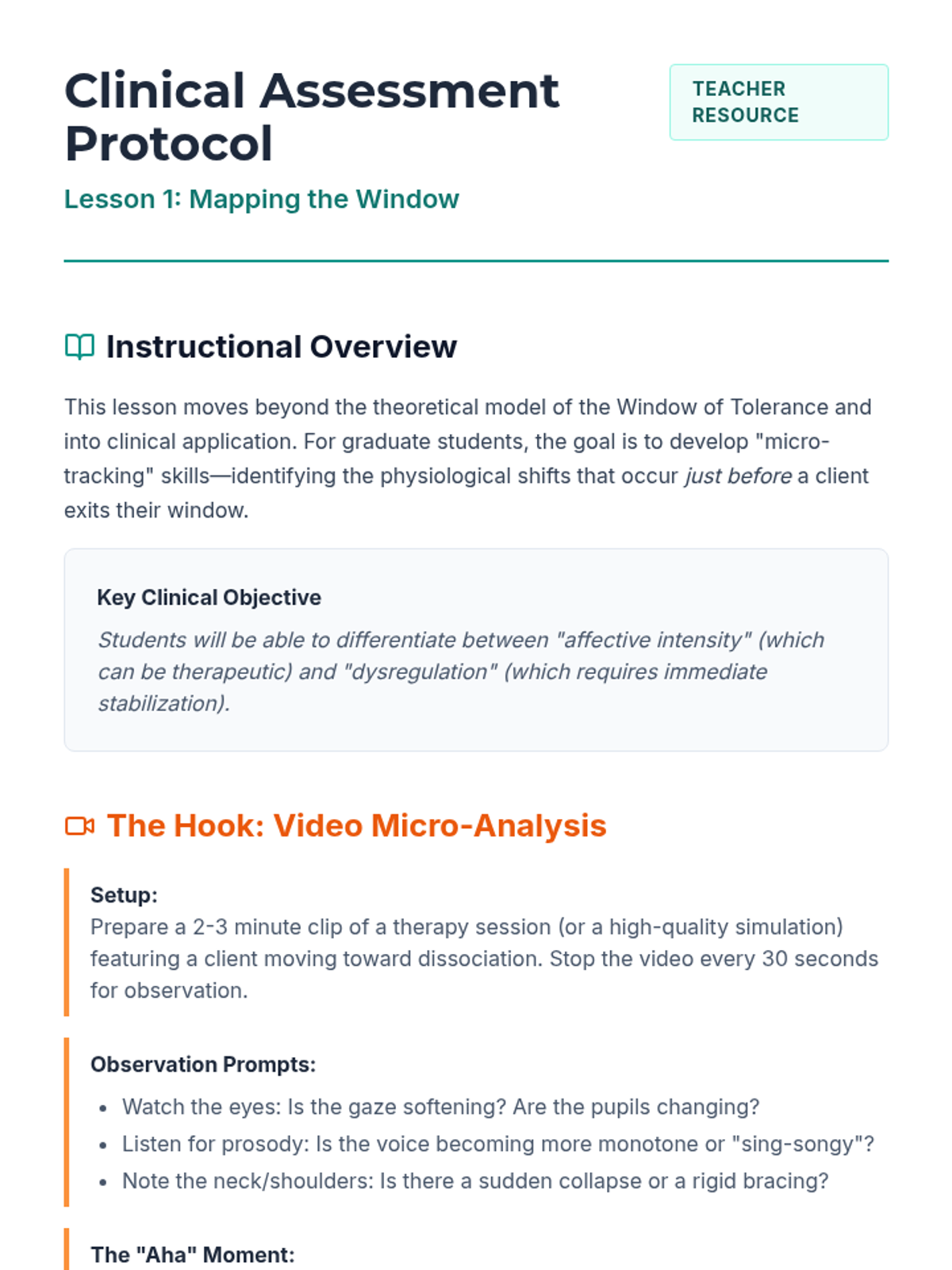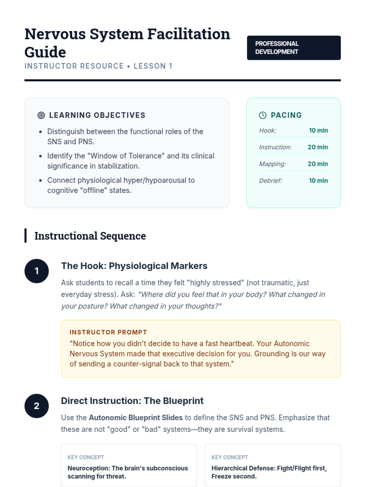 Regulation During Trauma DistressGrounding techniques and nervous system stabilization strategies for managing acute trauma responses. Equips practitioners with somatic tools and distress tolerance interventions to foster emotional safety.