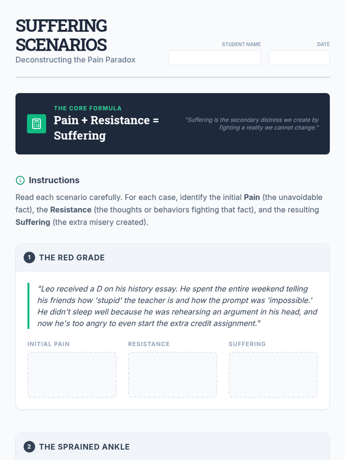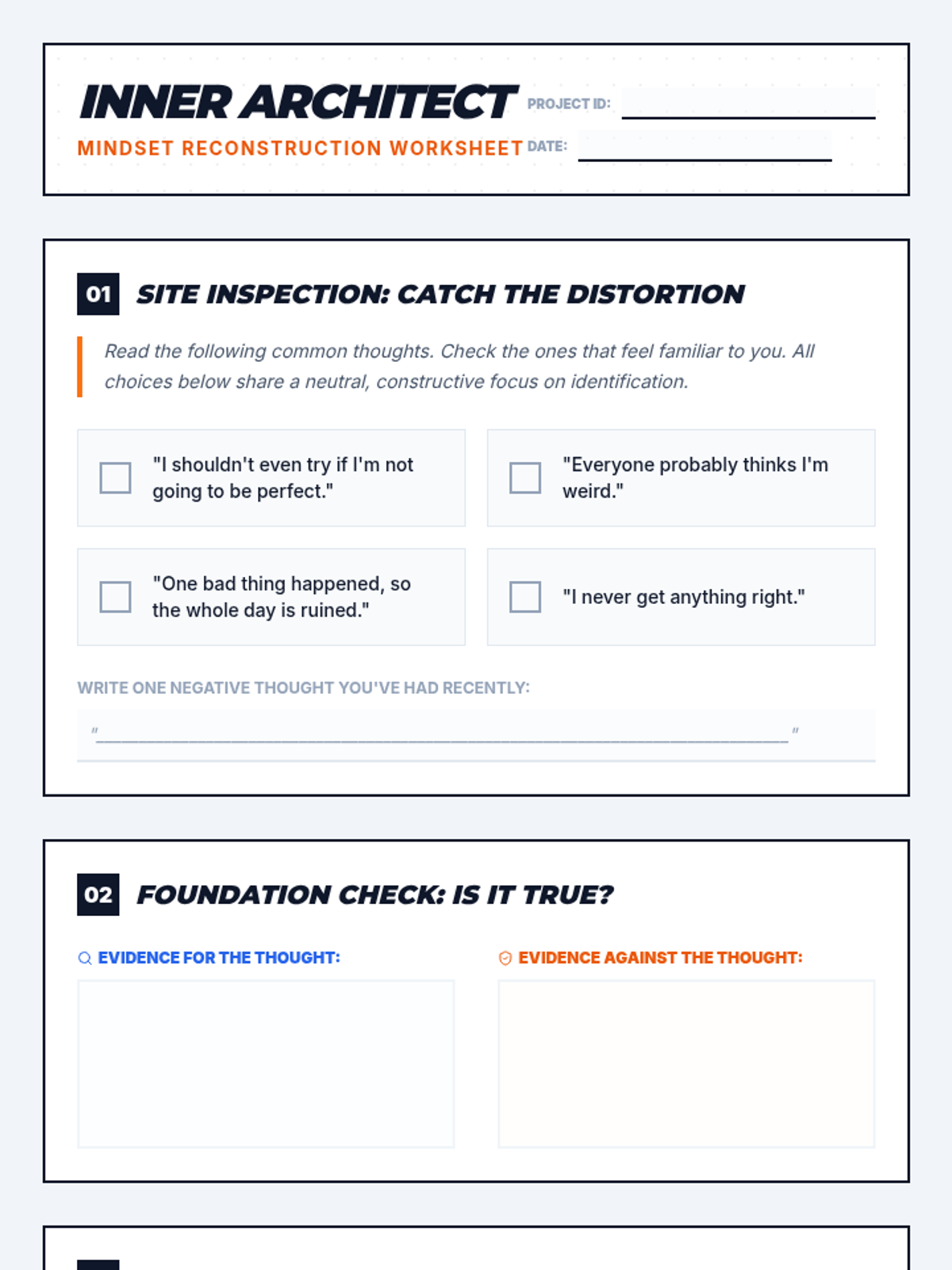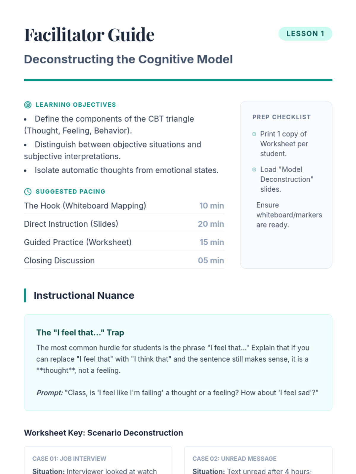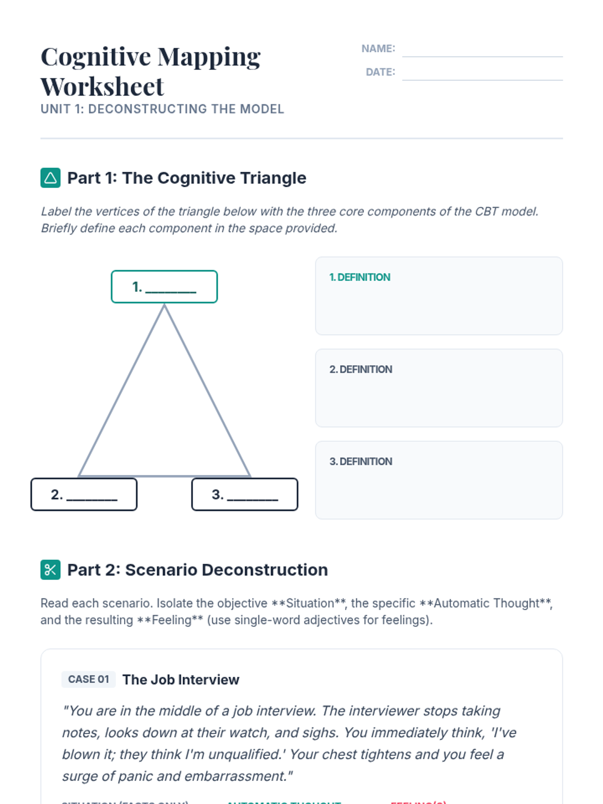 A comprehensive workshop-style sequence for undergraduate students to master cognitive reframing techniques. Students progress from identifying distortions to deconstructing beliefs and building resilient internal narratives.