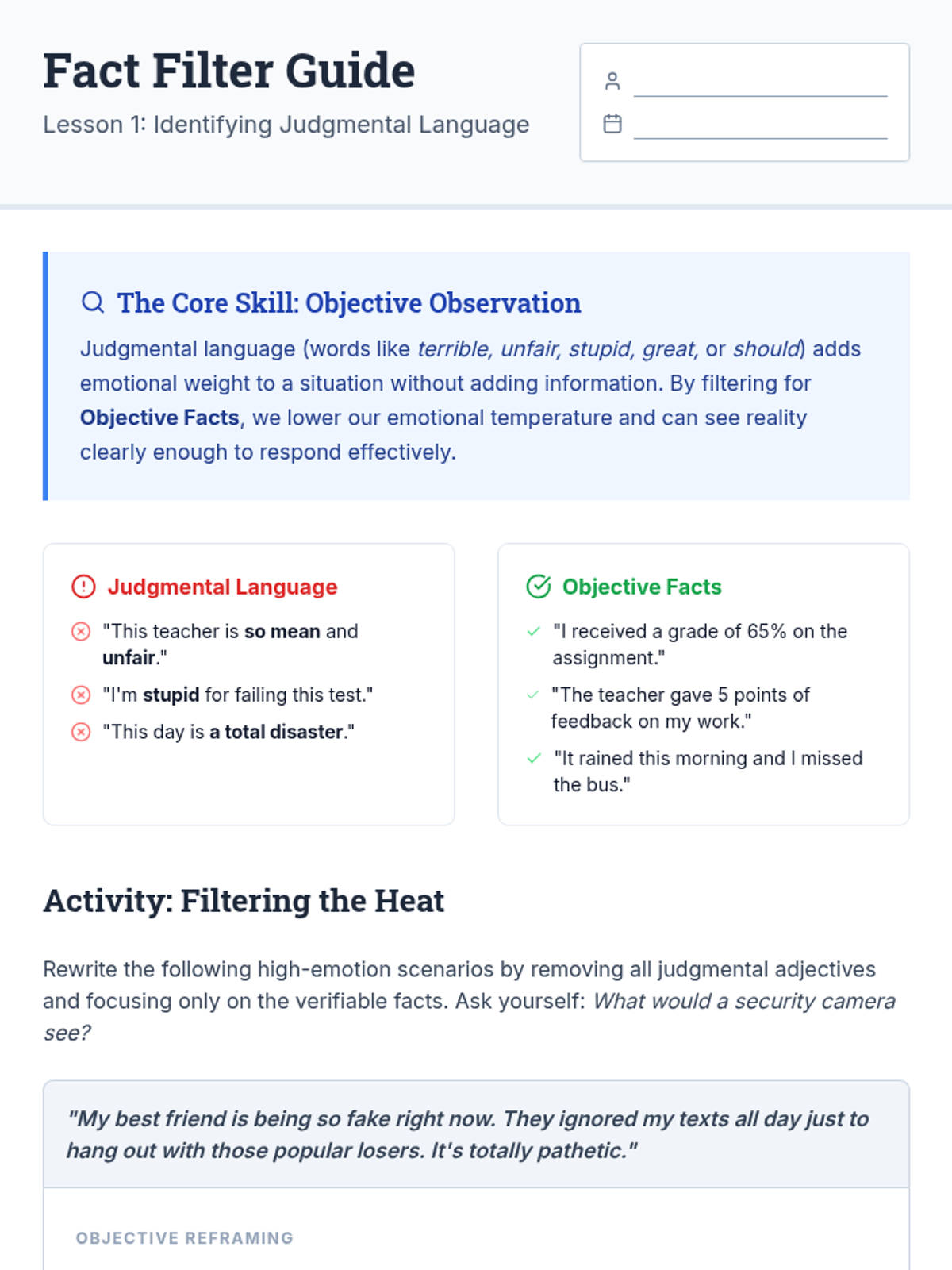 Challenging Negative ThoughtsCognitive restructuring techniques and identification of common cognitive distortions. Equips learners with evidence-based questioning strategies to reframe maladaptive self-talk and promote balanced thinking.