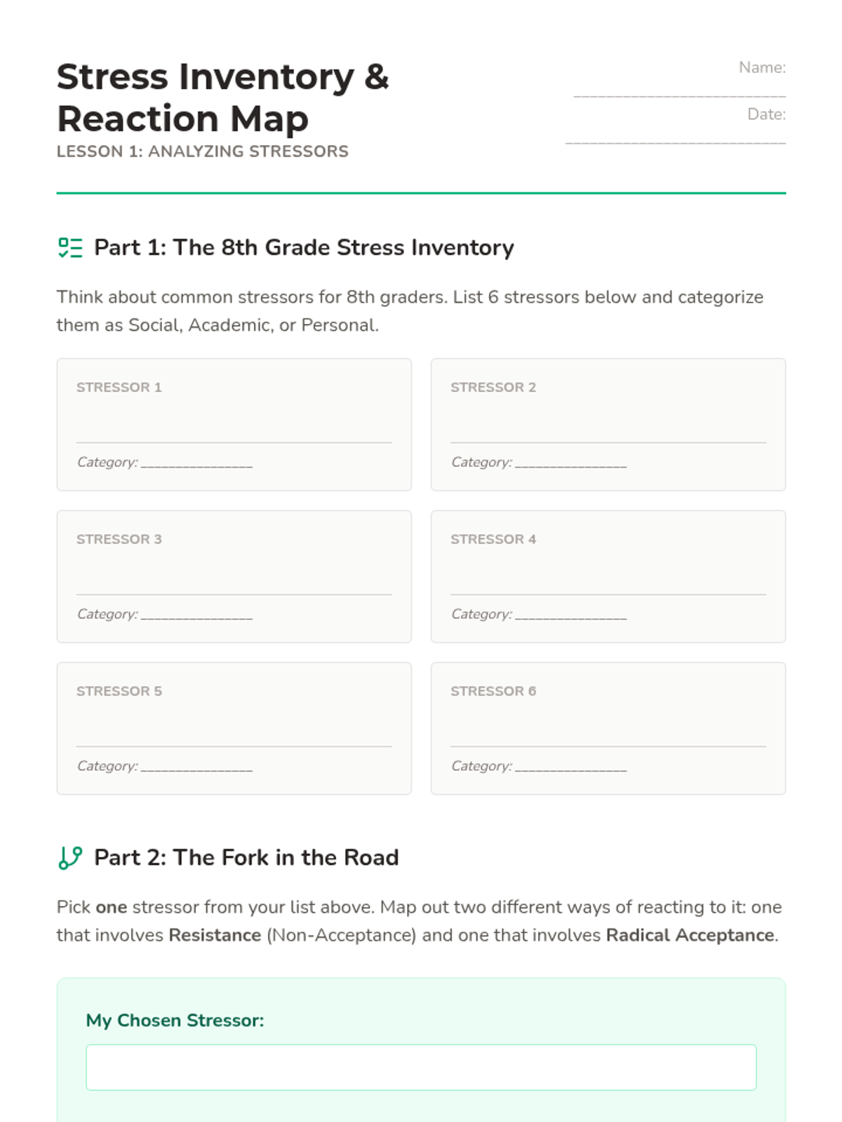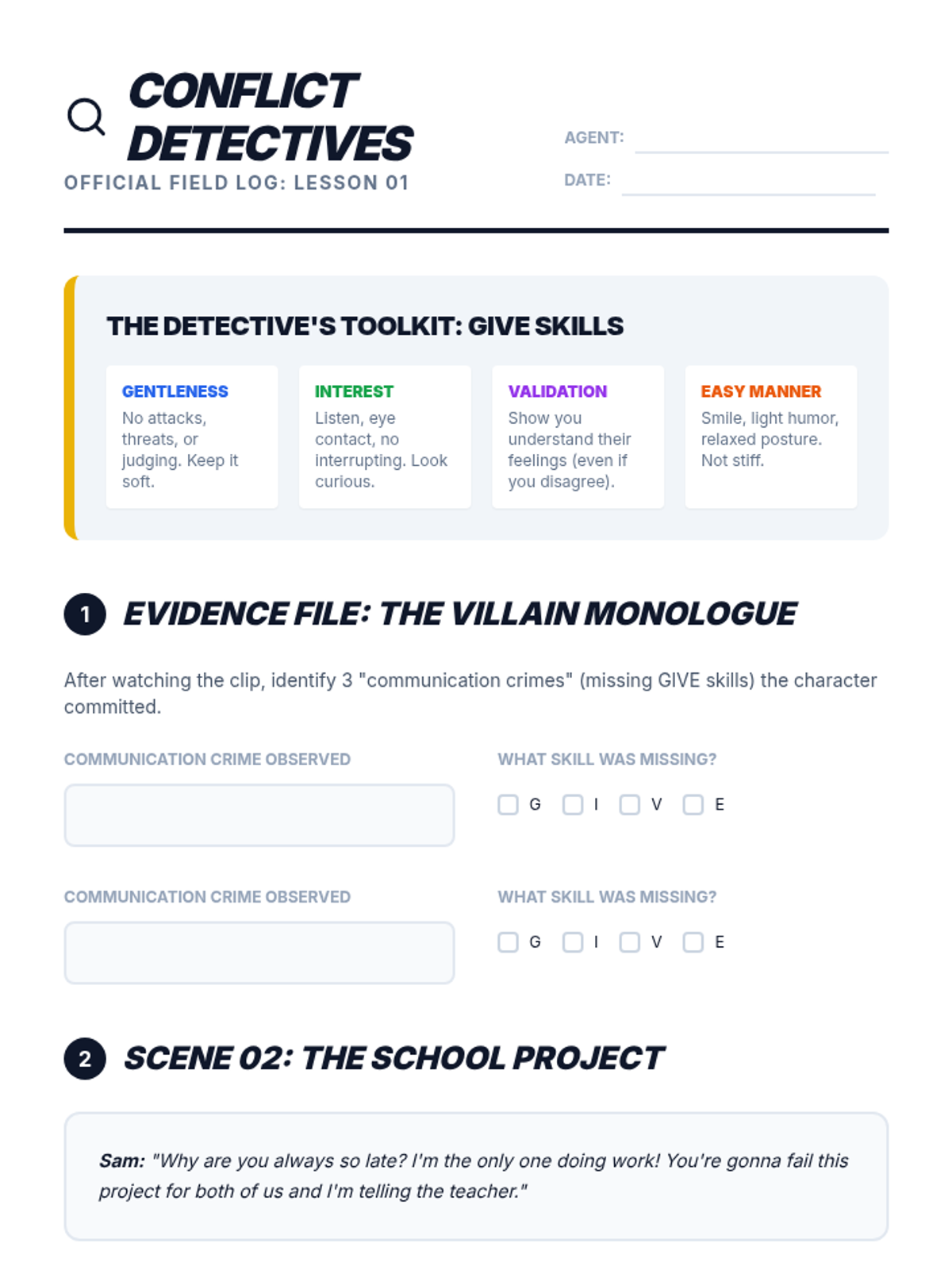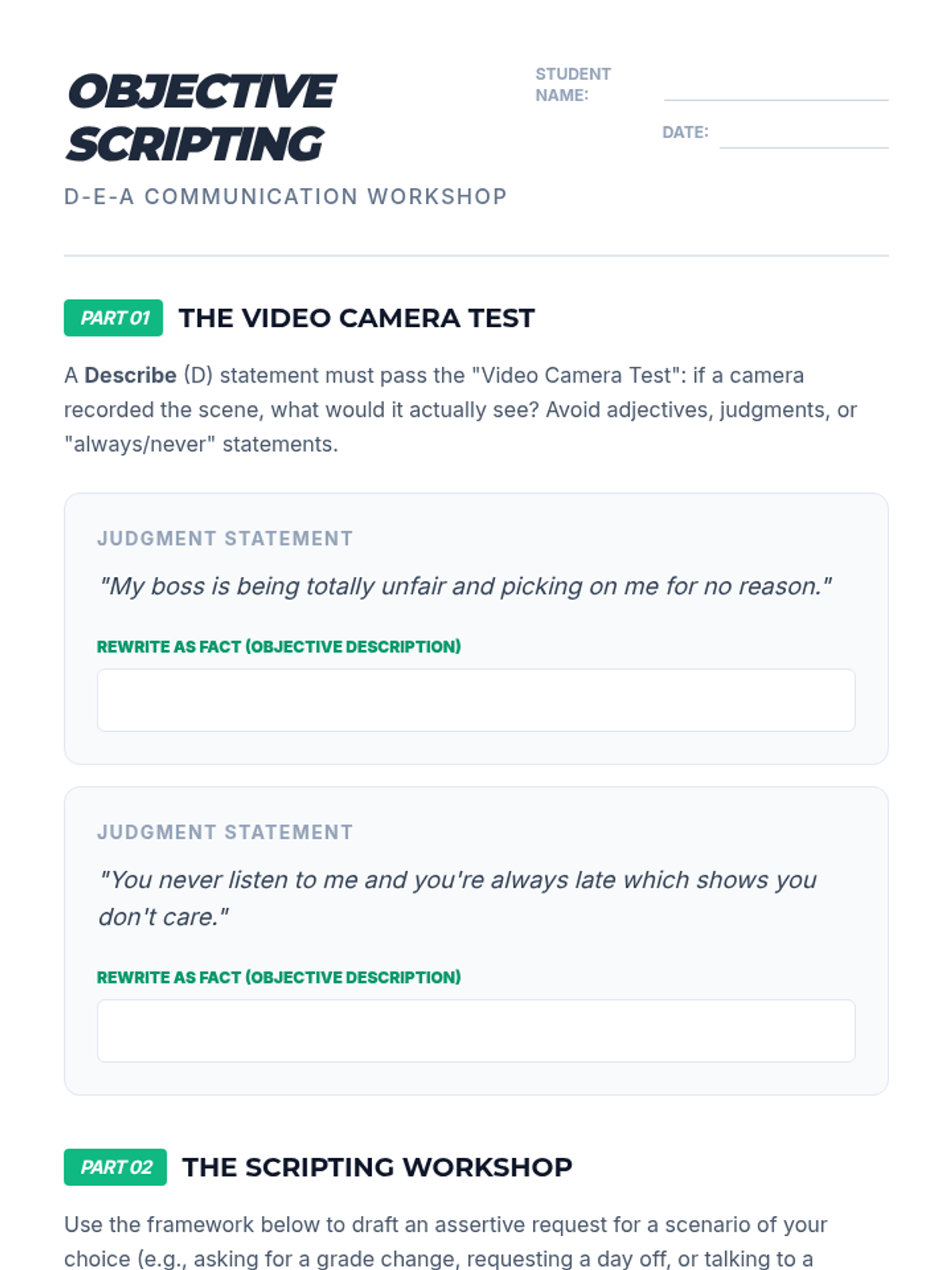 A comprehensive sequence for 7th graders on the DEAR MAN dialectical behavior therapy skill, teaching students to structure assertive requests effectively. Students progress from identifying communication styles to drafting and delivering polished scripts for real-life needs.
