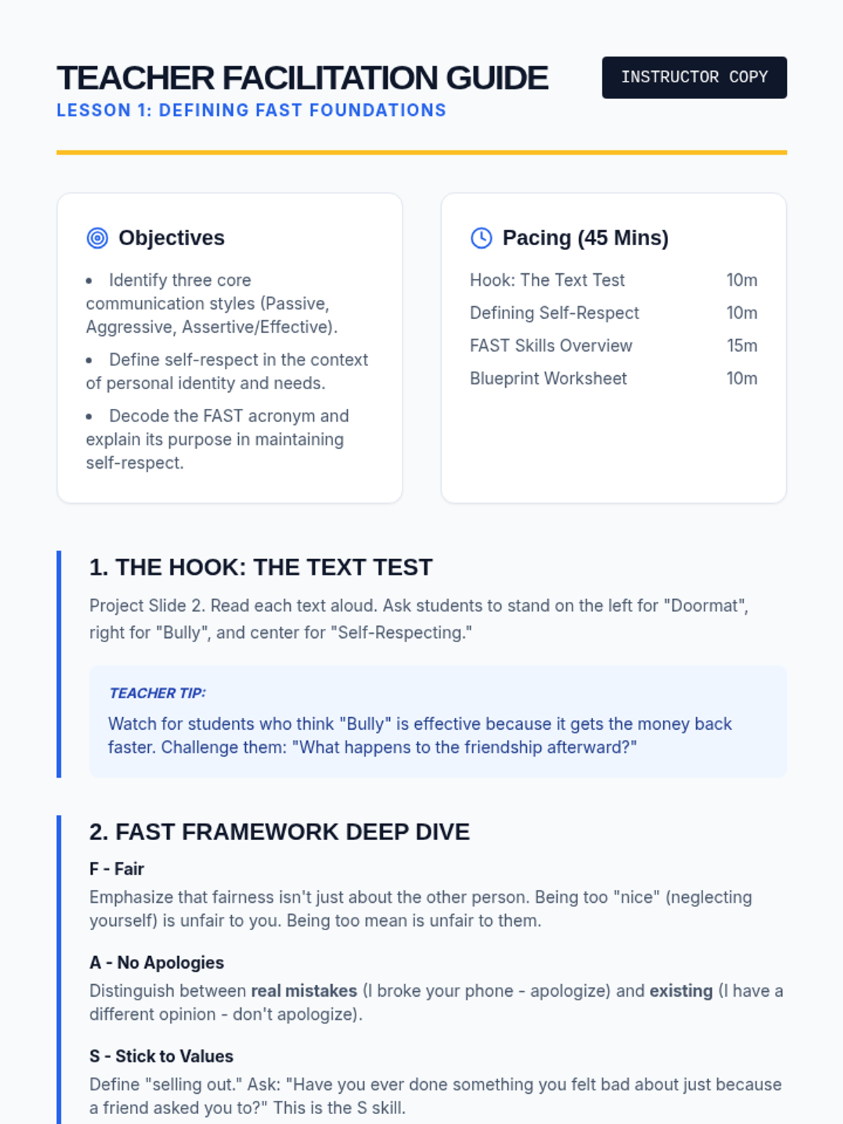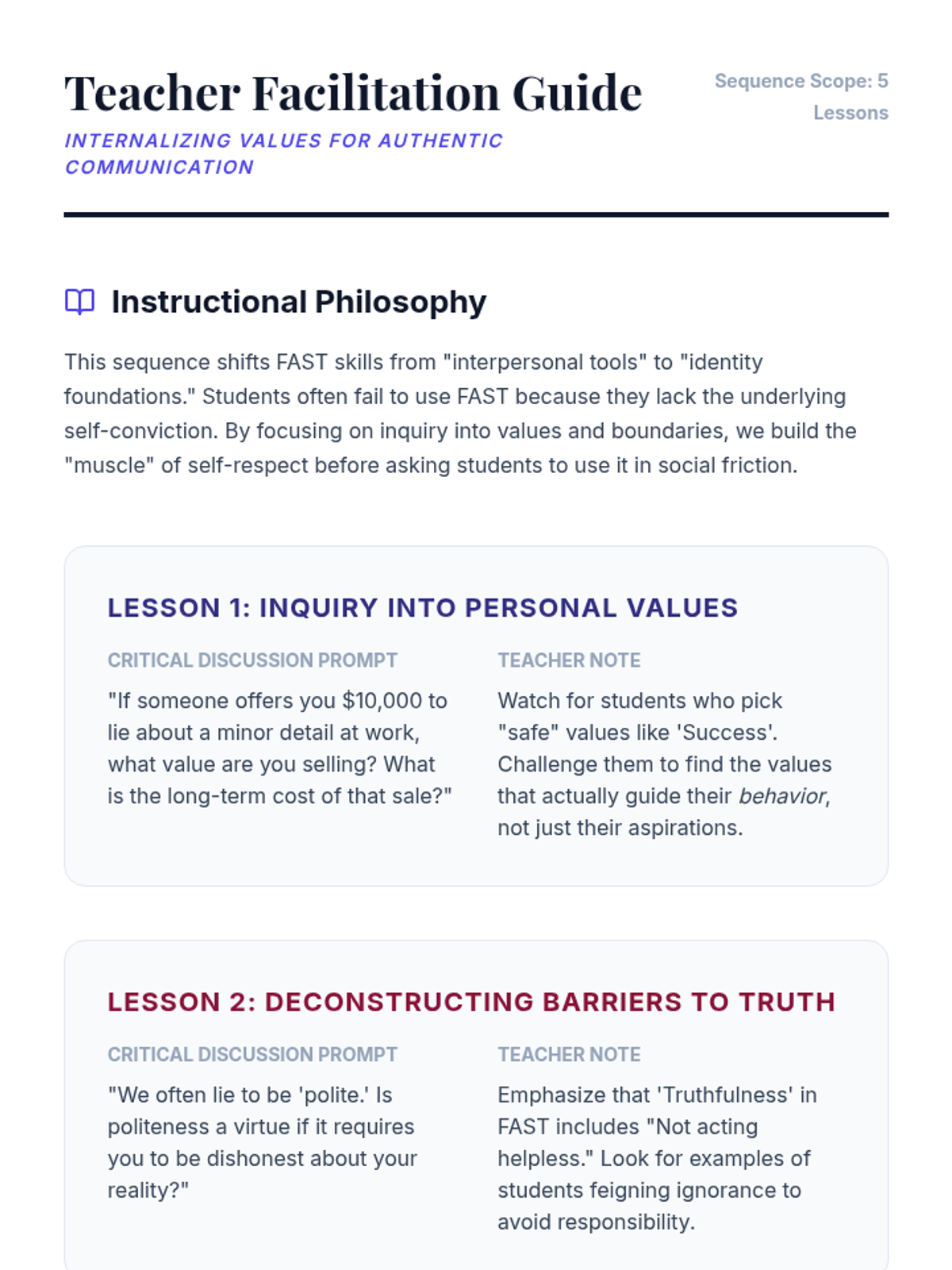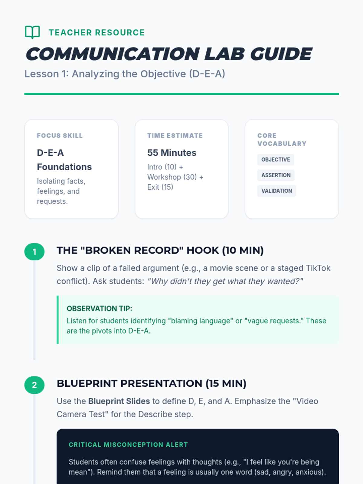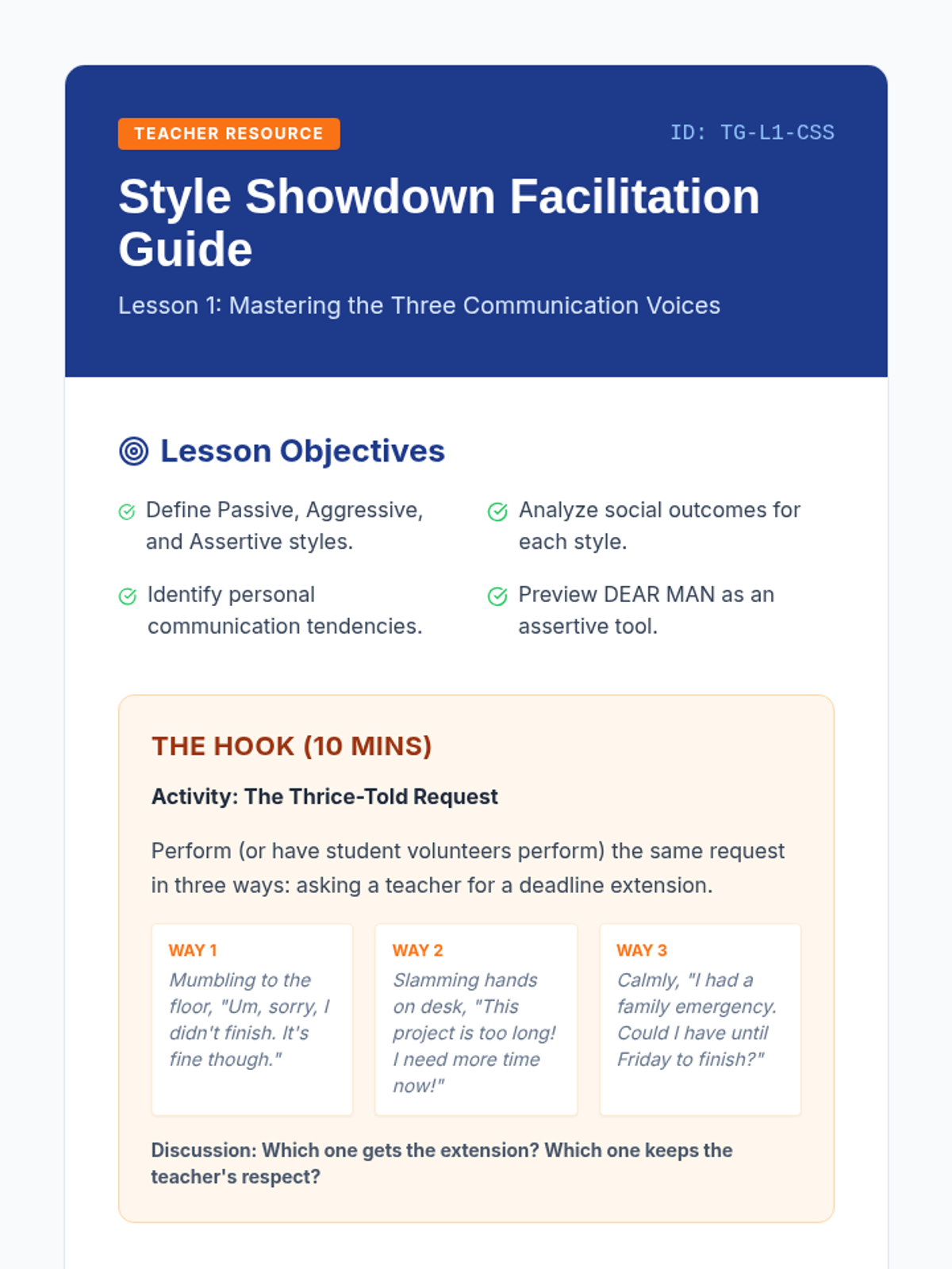 A comprehensive 5-lesson sequence for 7th graders on DEAR MAN communication skills, focusing on boundary setting, refusal techniques, and negotiation in peer conflicts.