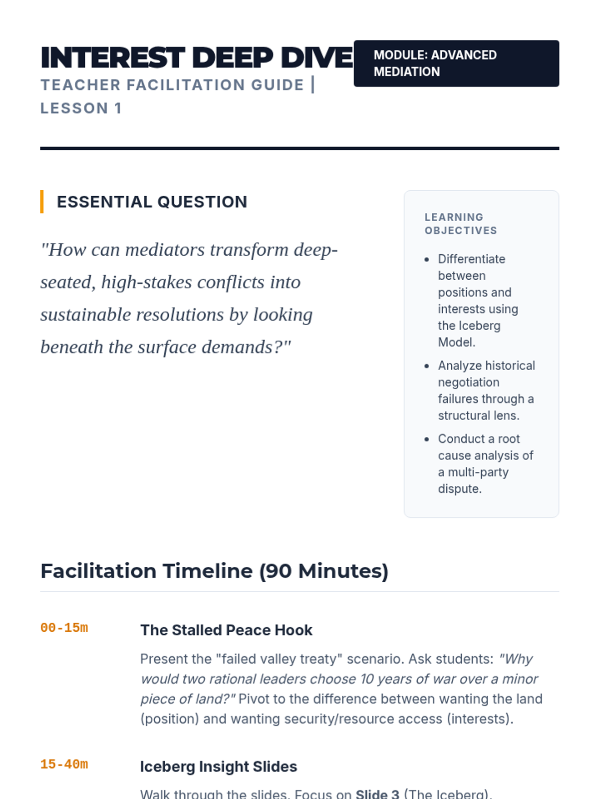 This sequence immerses undergraduate students in the theoretical and practical application of advanced conflict resolution, moving beyond basic interpersonal skills to systemic mediation strategies. Students will master interest-based negotiation, emotional regulation, reframing, and power analysis through simulations and case studies.