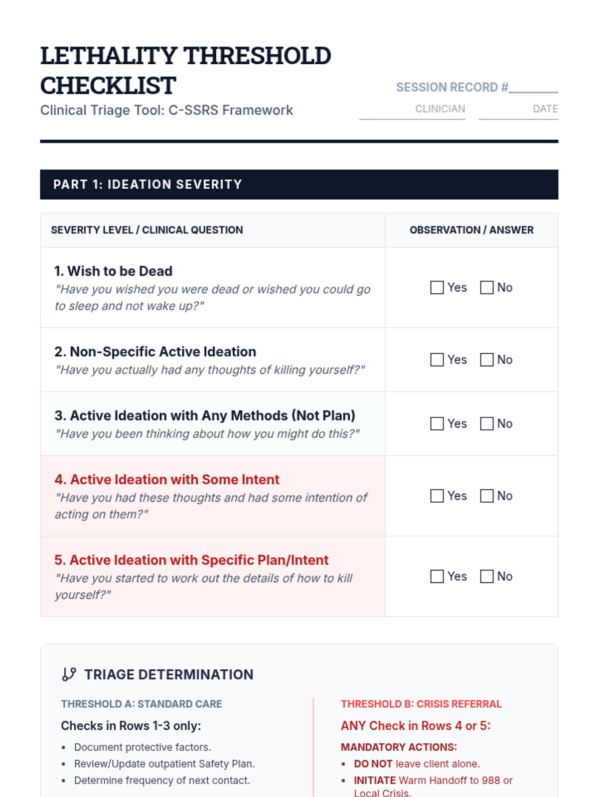 Personalized Safety PlanningIndividualized protocols for identifying warning signs, internal coping mechanisms, and external support networks to mitigate immediate crisis risk. Equips practitioners to co-create actionable steps that prioritize client safety during mental health emergencies.