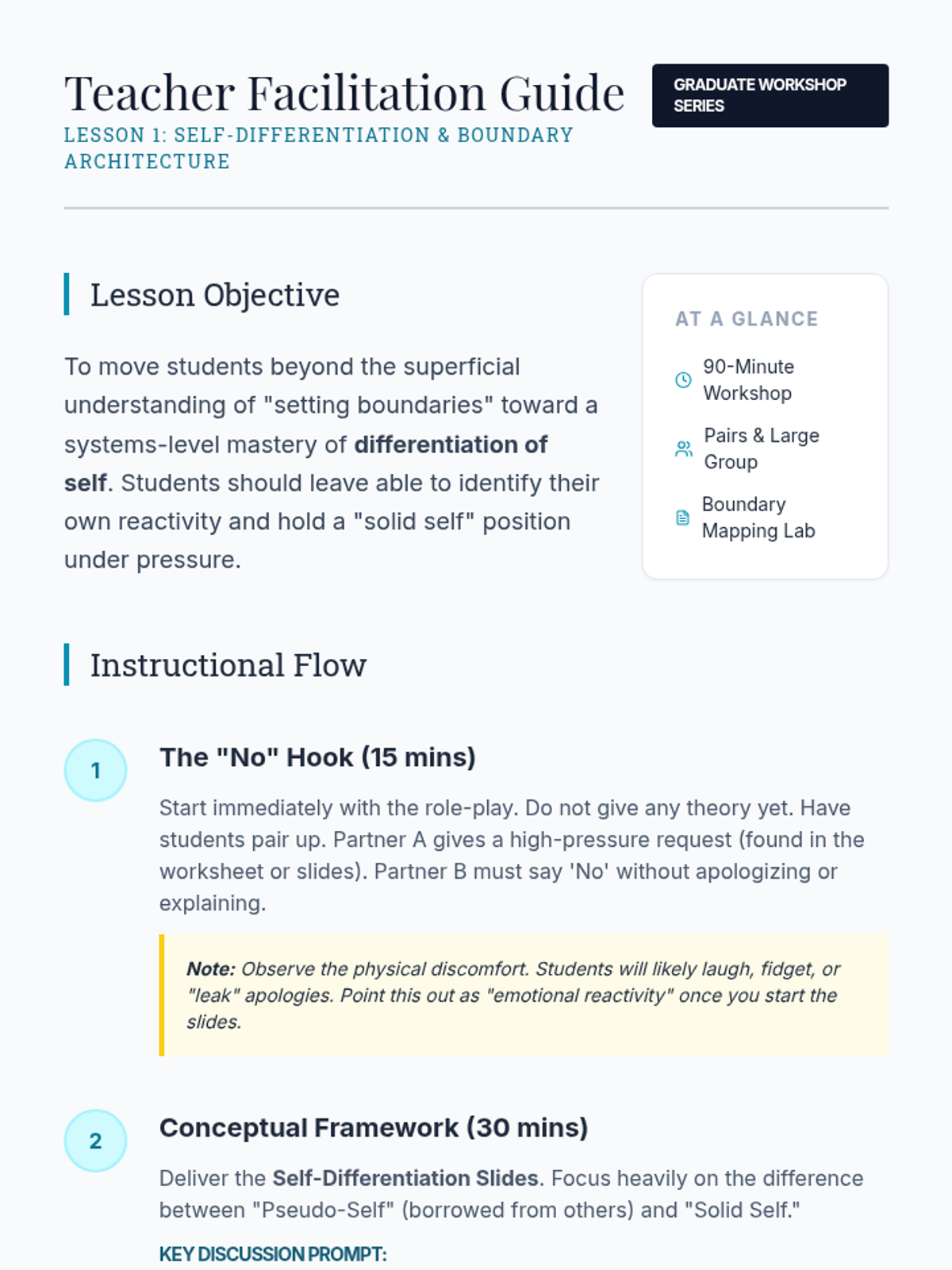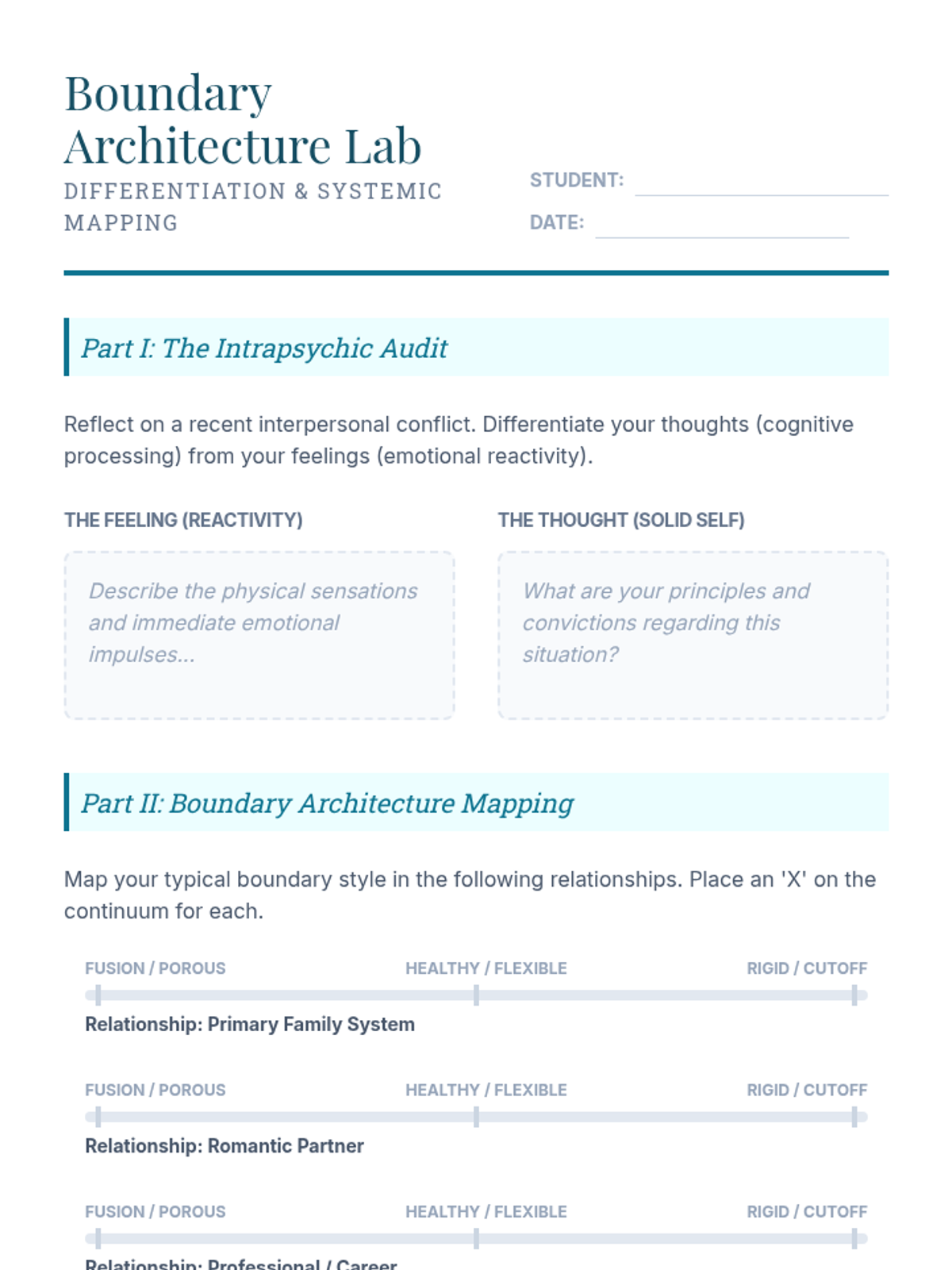 An advanced workshop-style sequence for graduate students focusing on communication architectures, differentiation of self, and the practical mastery of healthy relationship dynamics. Students will move from theoretical frameworks (Bowen Family Systems, NVC) to high-stakes practical simulations.