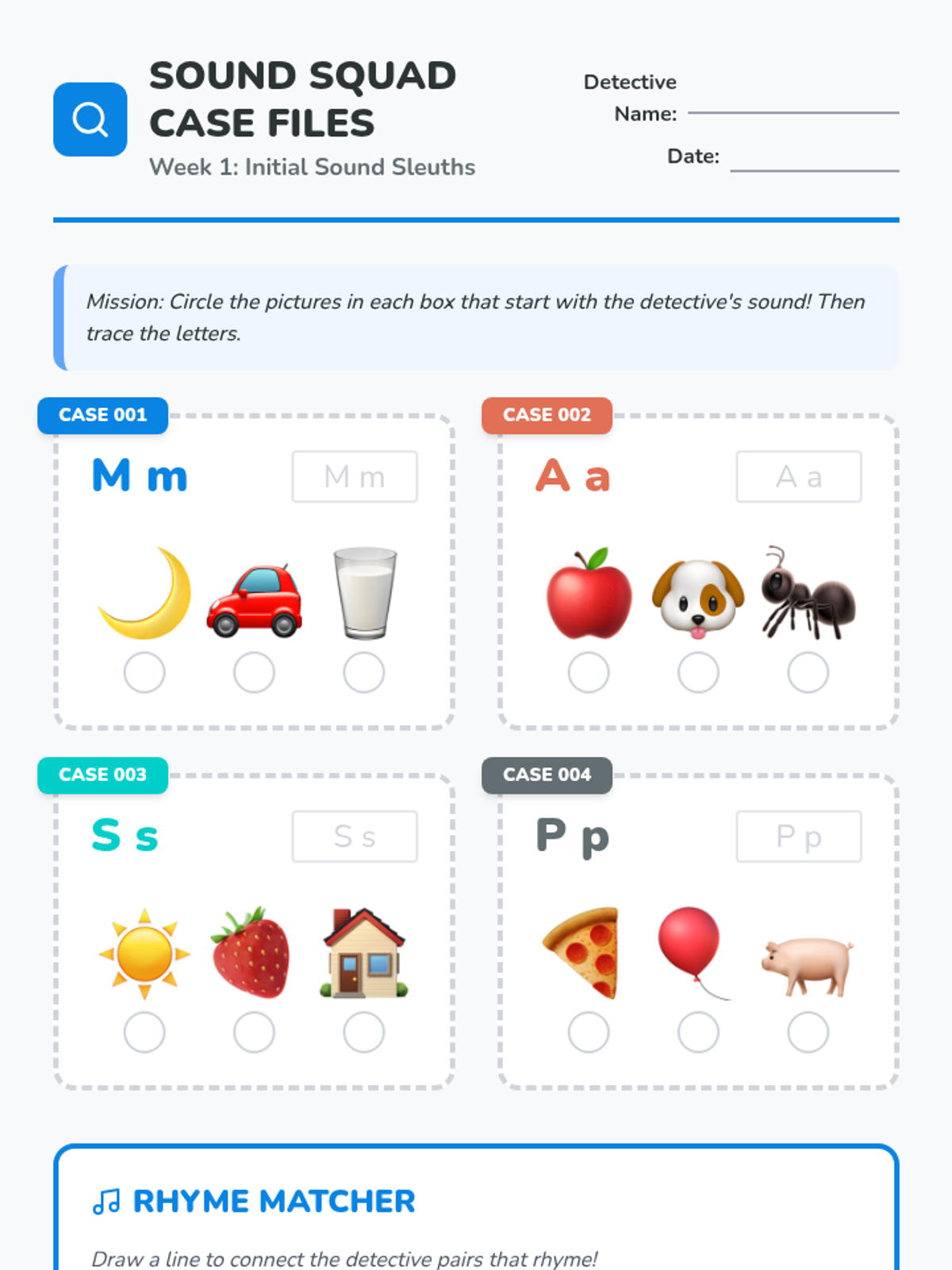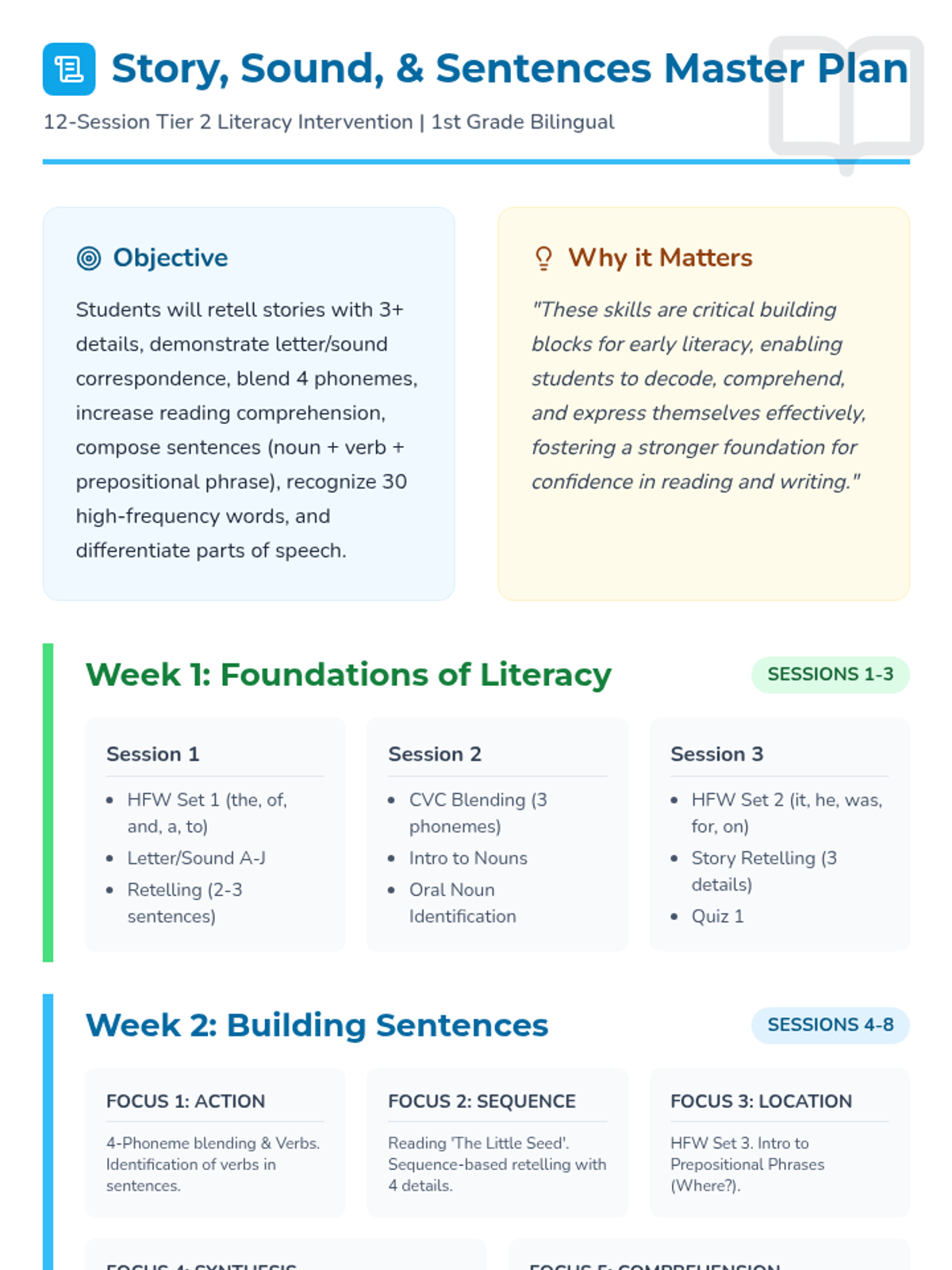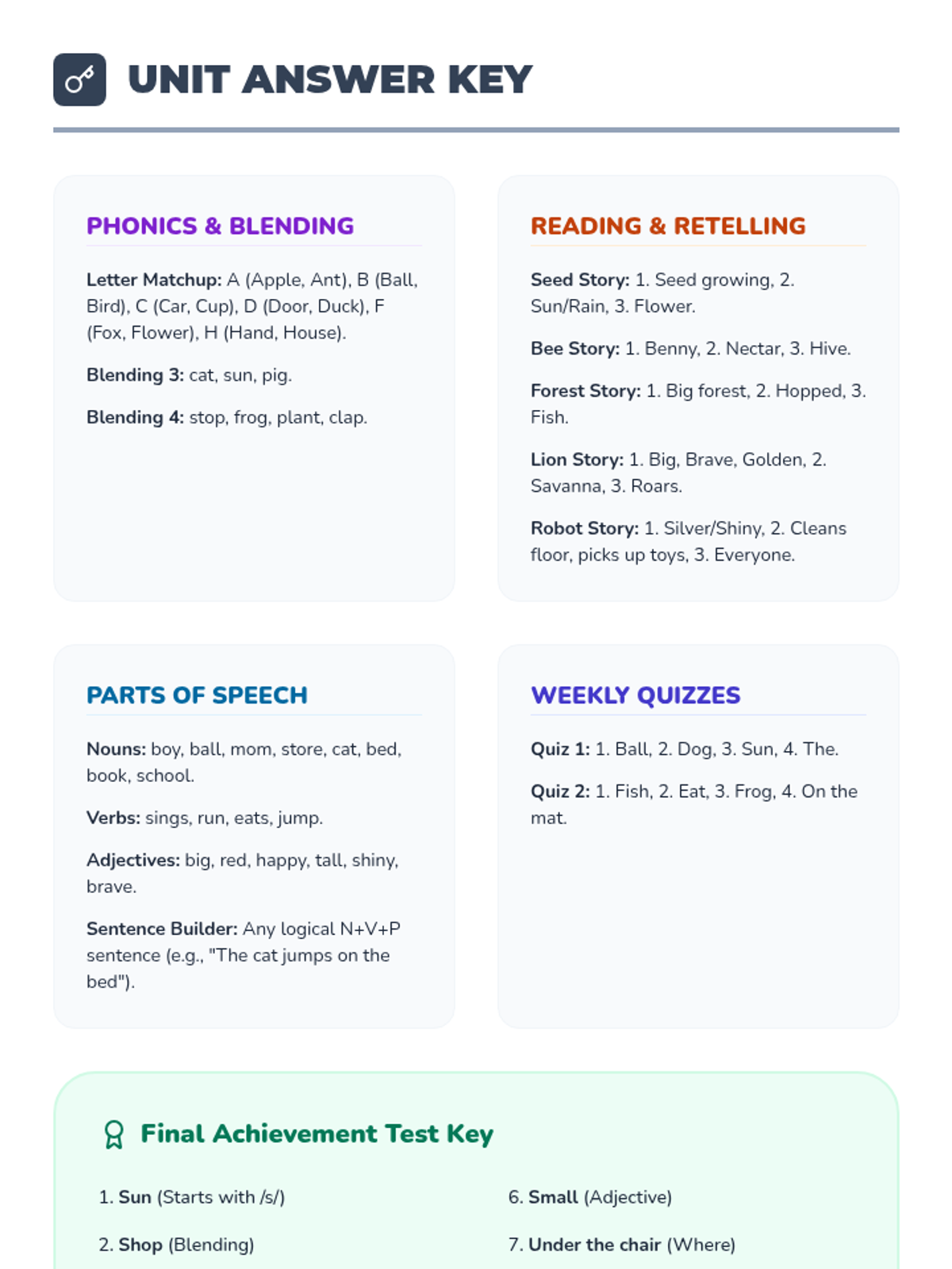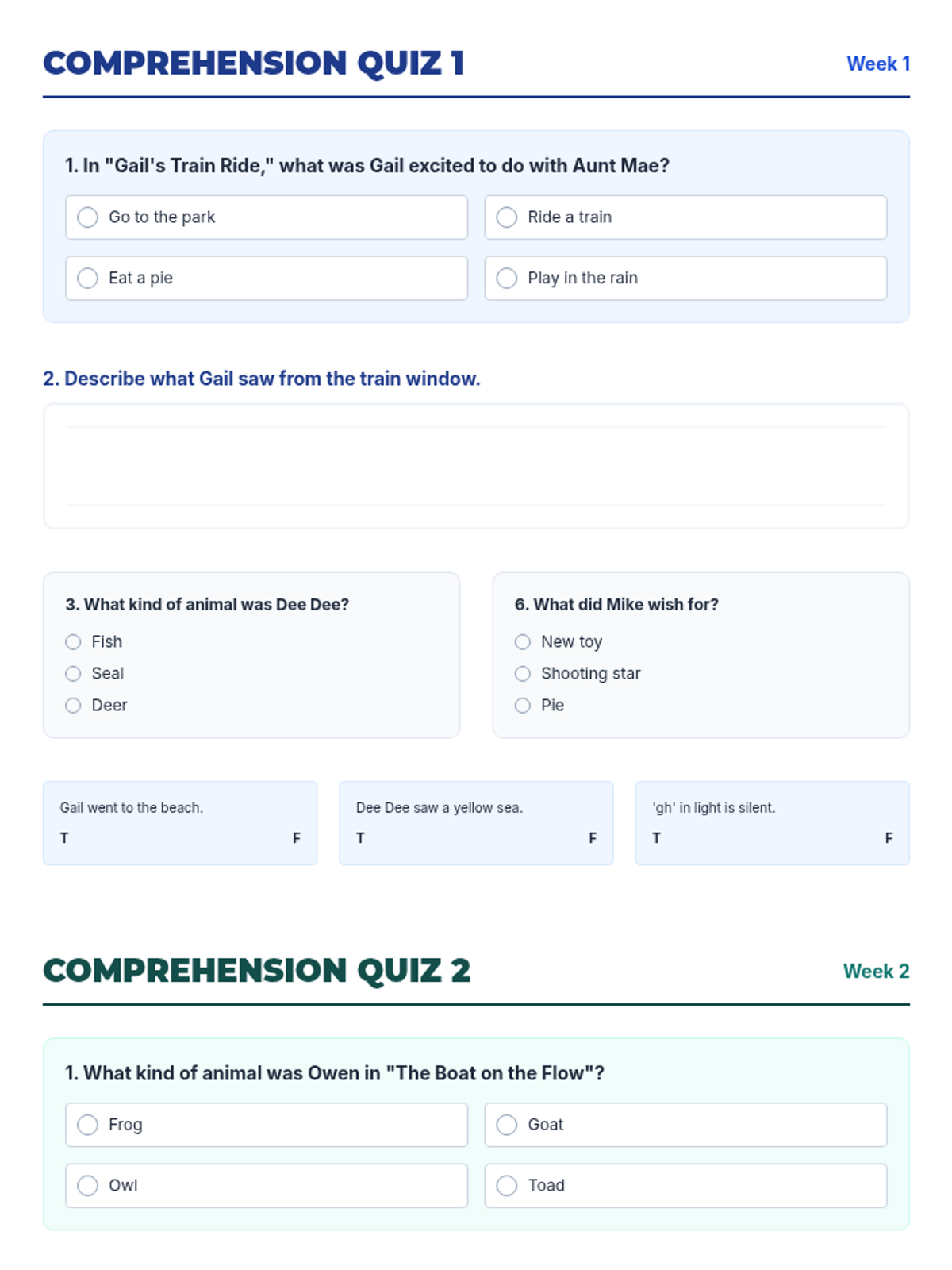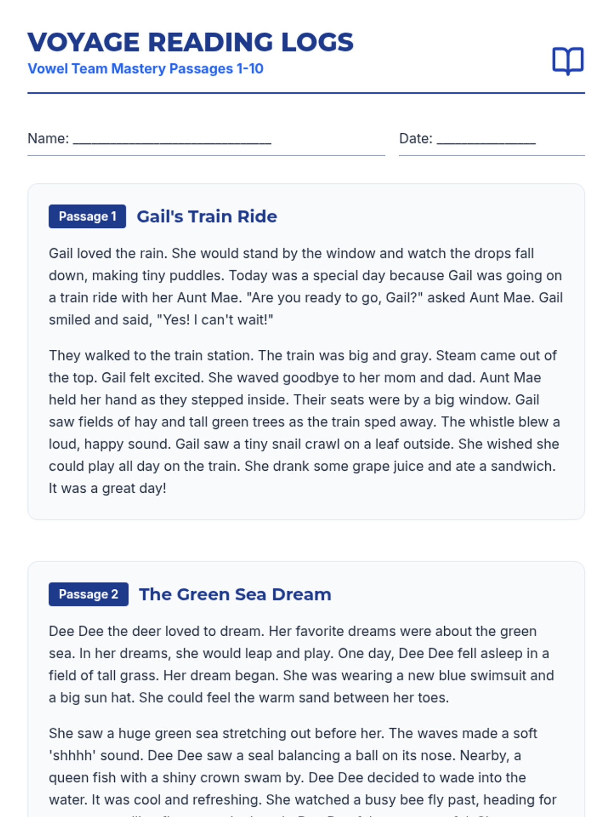 Letter identification, phonemic awareness, and decoding skills ranging from simple letter-sound associations to complex multisyllabic patterns. Develops reading fluency through systematic instruction in vowel teams, consonant blends, and word recognition strategies using decodable texts.