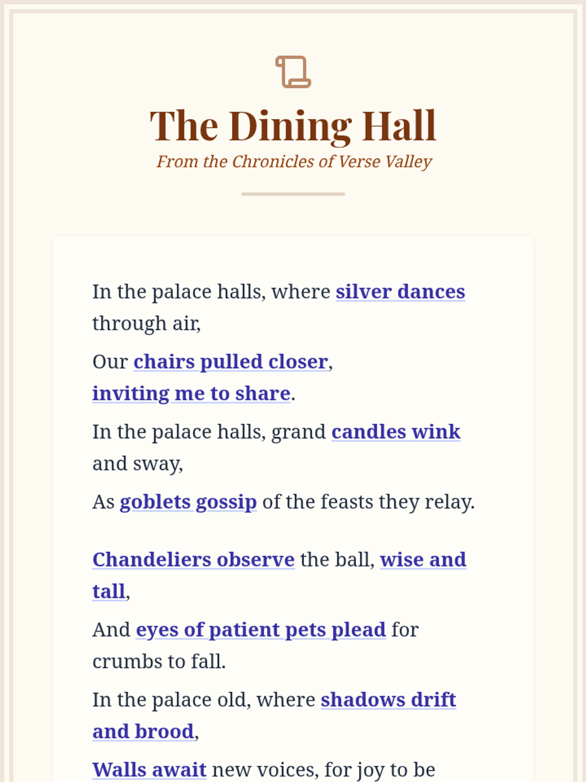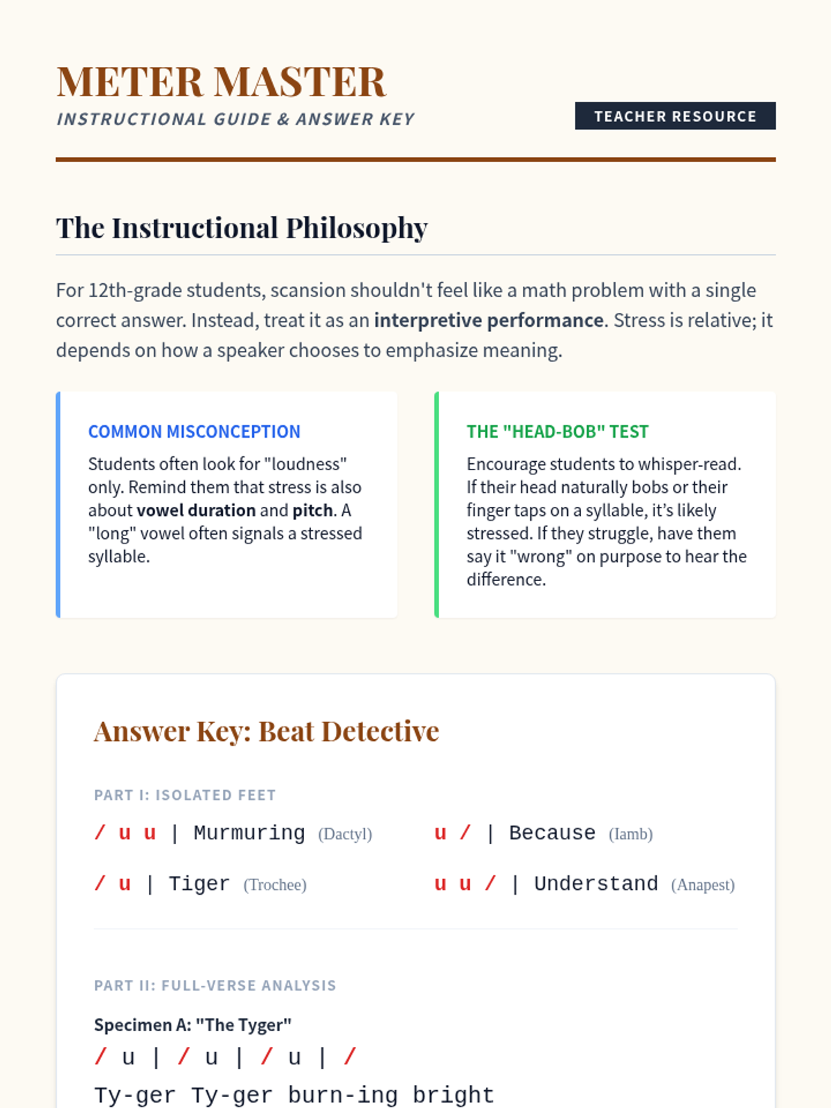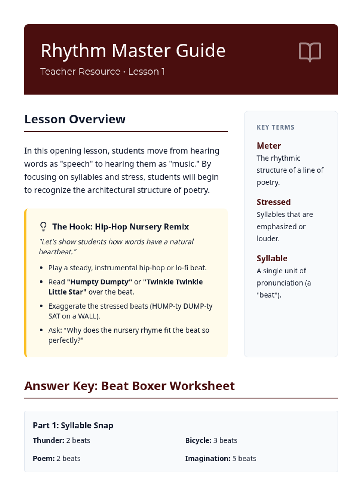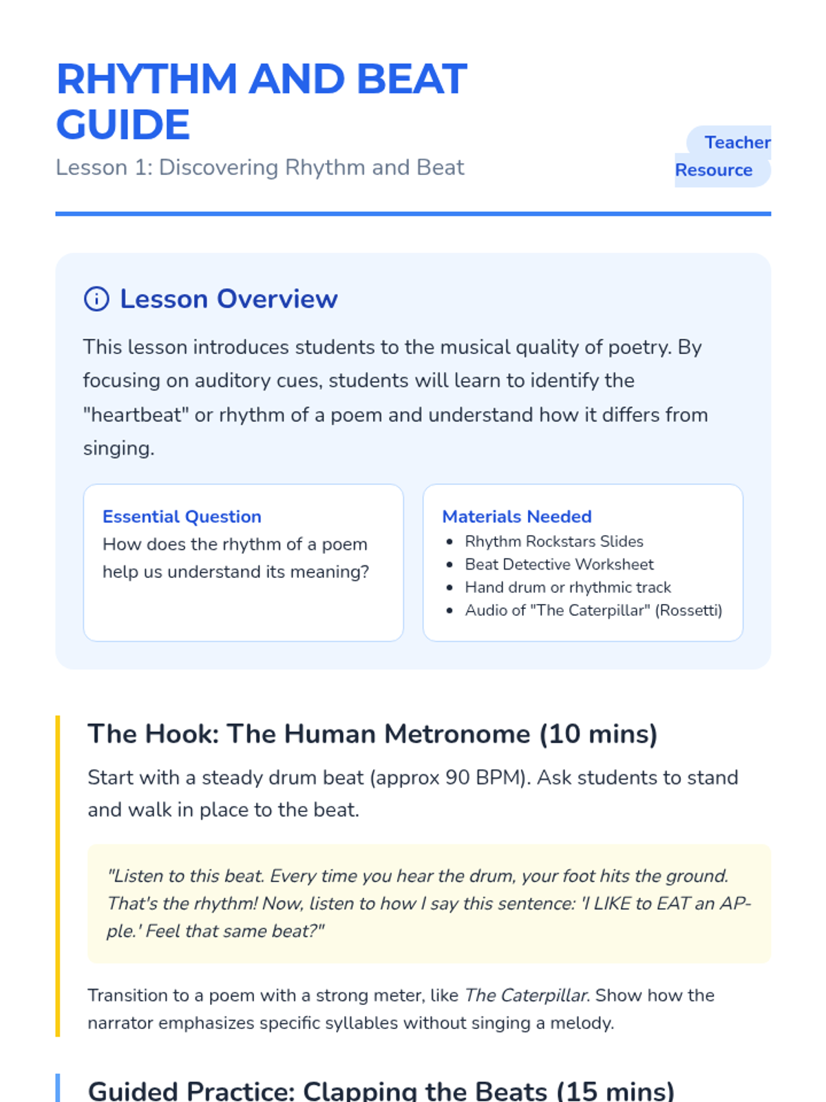 A 3rd-grade ELA sequence focused on rhythm, rhyme, and performance in poetry. Students learn to analyze the auditory elements of poems and perform them in a 'Poetry Cafe' setting.