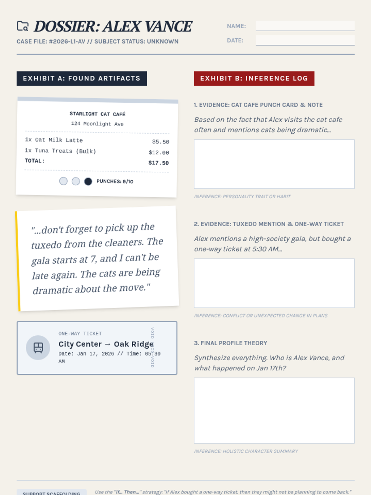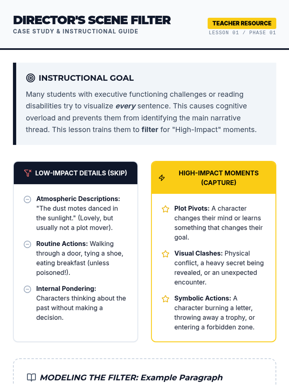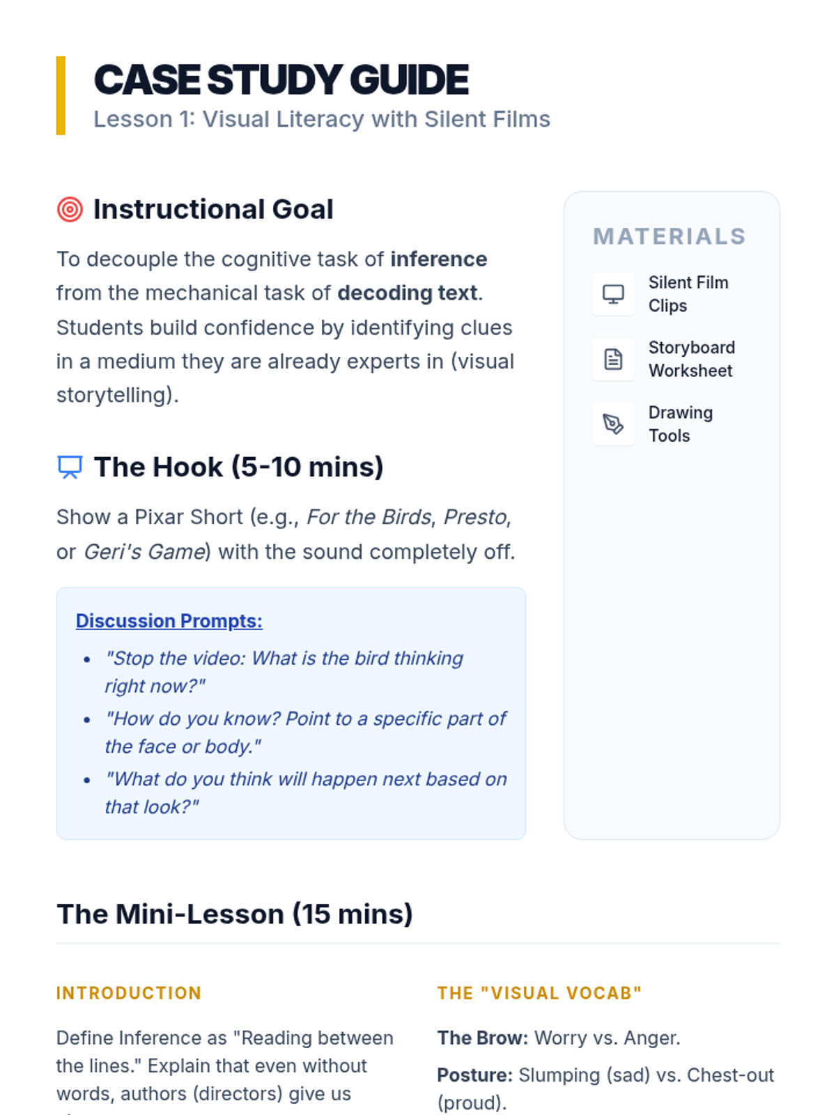 This sequence helps 9th-grade students who struggle with reading fluency build inference skills by first mastering visual analysis in films and images before transitioning those cognitive strategies to written text.