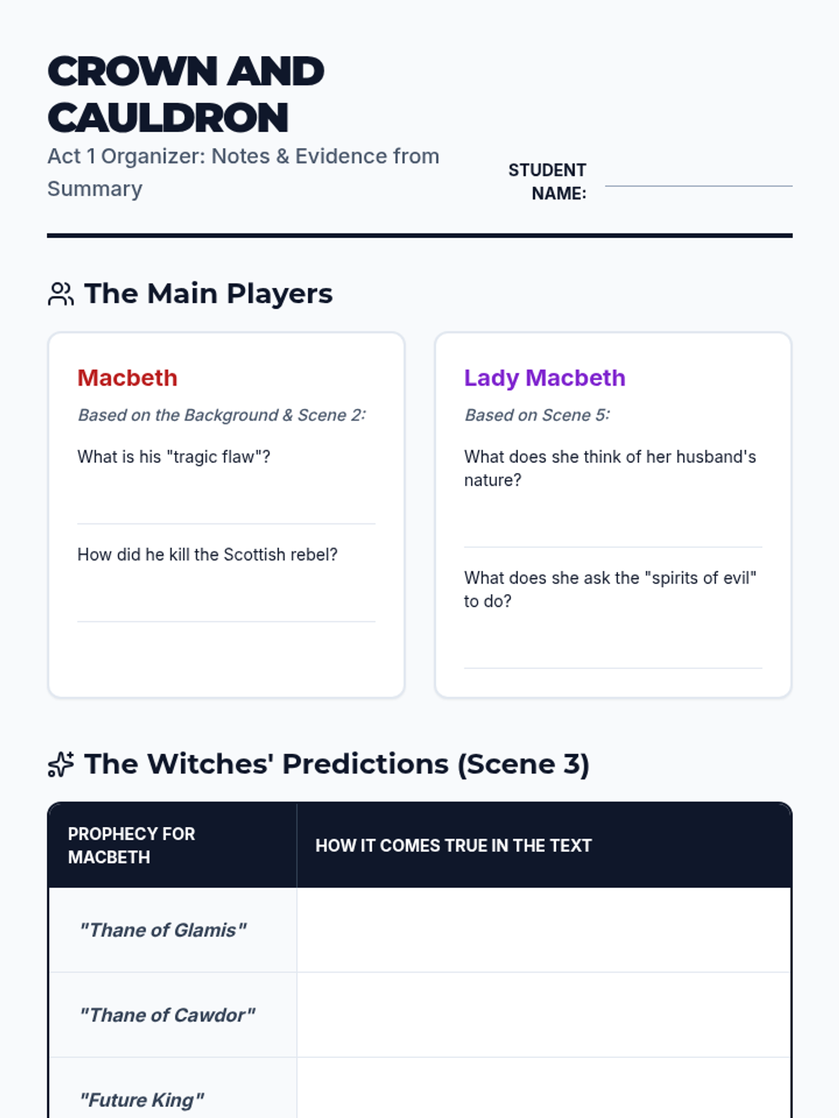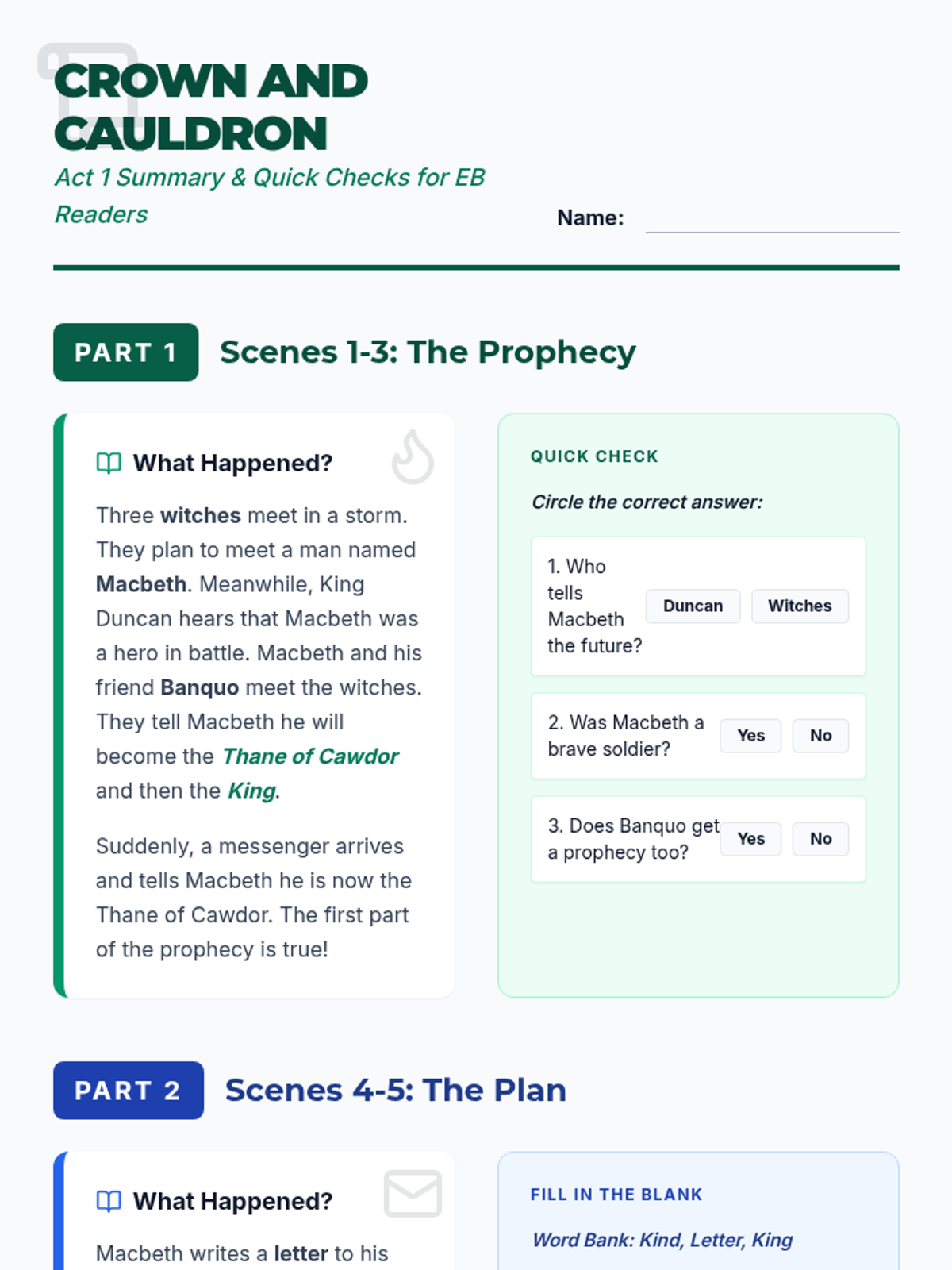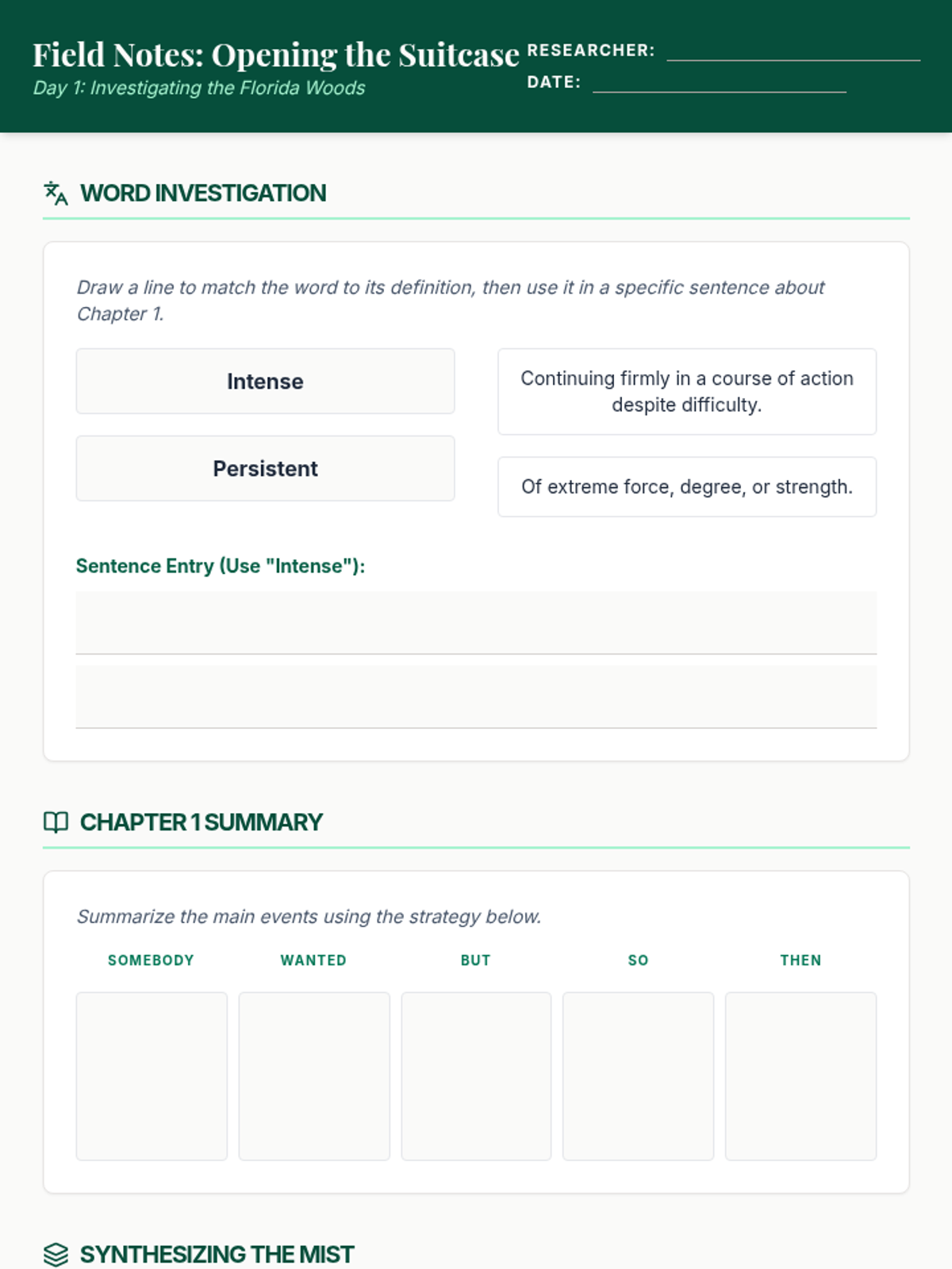 Story ElementsIdentification and analysis of plot, characters, setting, conflict, and resolution. Strengthens reading comprehension by mapping narrative structures and examining how individual components shape a story.